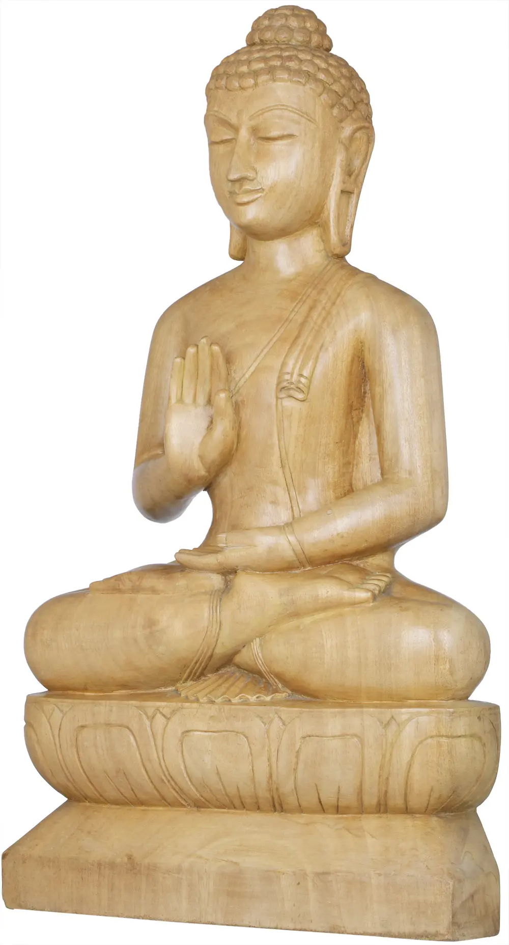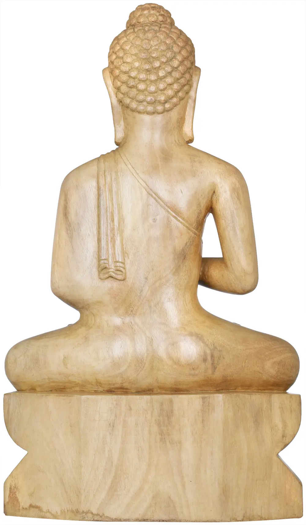 This Tibetan Buddhist Blessing Idol is a wooden statue that is identified as one of the five Dhyani Buddhas. This particular posture of the statue associates itself with the Amogasiddhi Buddha. Amoghasiddhi denotes the accomplishment of all actions. He is the Lord of Prakuta Pure Land. He has a greenish complexion, and his consort is Green Tara. His Bija begins with Ah. In Buddha sculptures and images, Amoghasiddhi's hand gesture is a courageous mudra. His right hand is in front of his chest, palm facing outward. In Vajrayana Buddhism, he is thought to help people overcome envy.