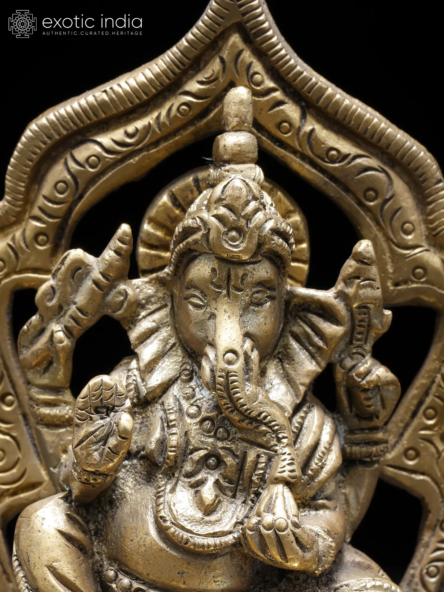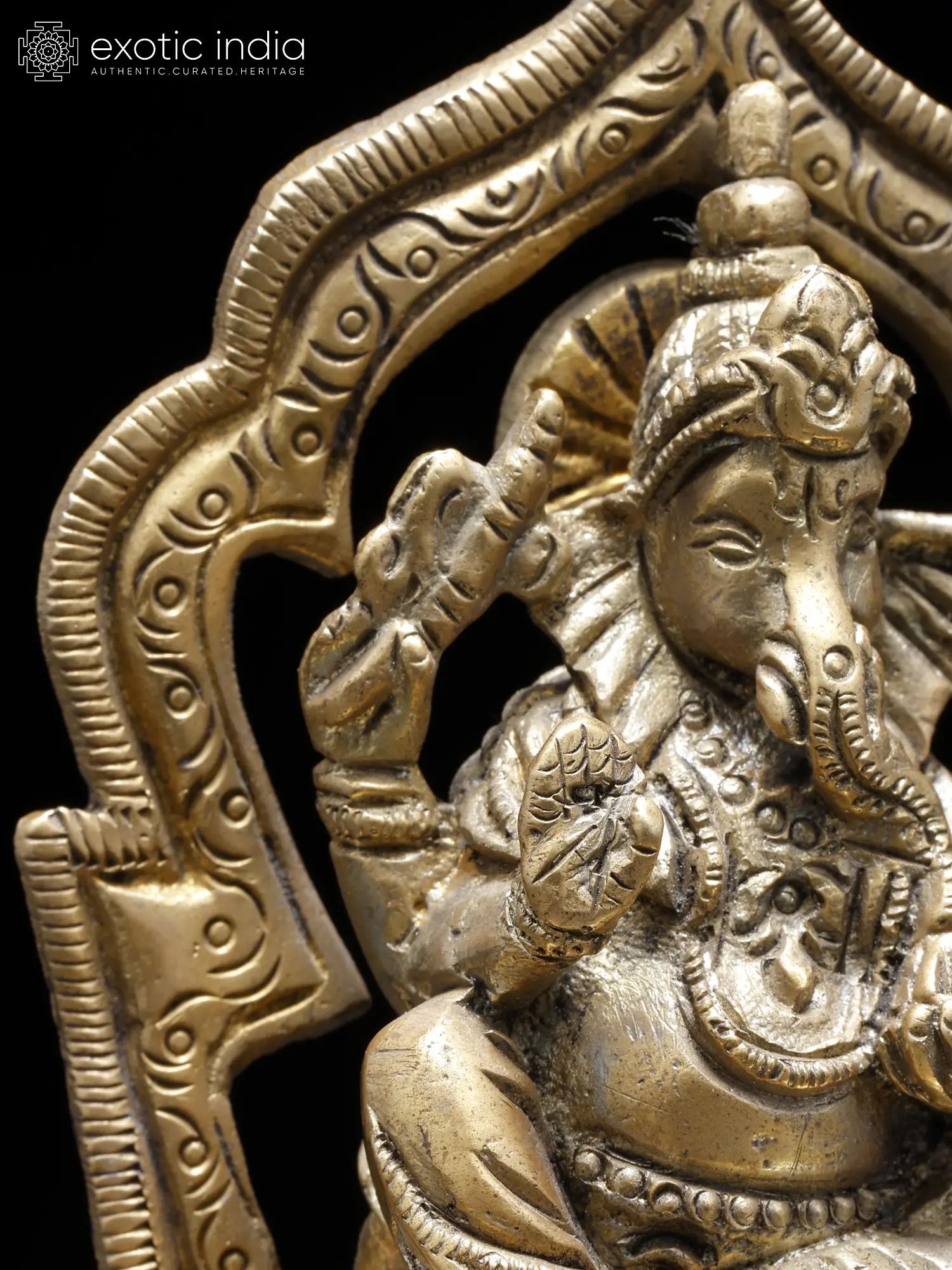 A traditional aureole surrounds Sri Ganesha, who sits in the royal Maharajalilasana pose, supporting himself on a bolster.