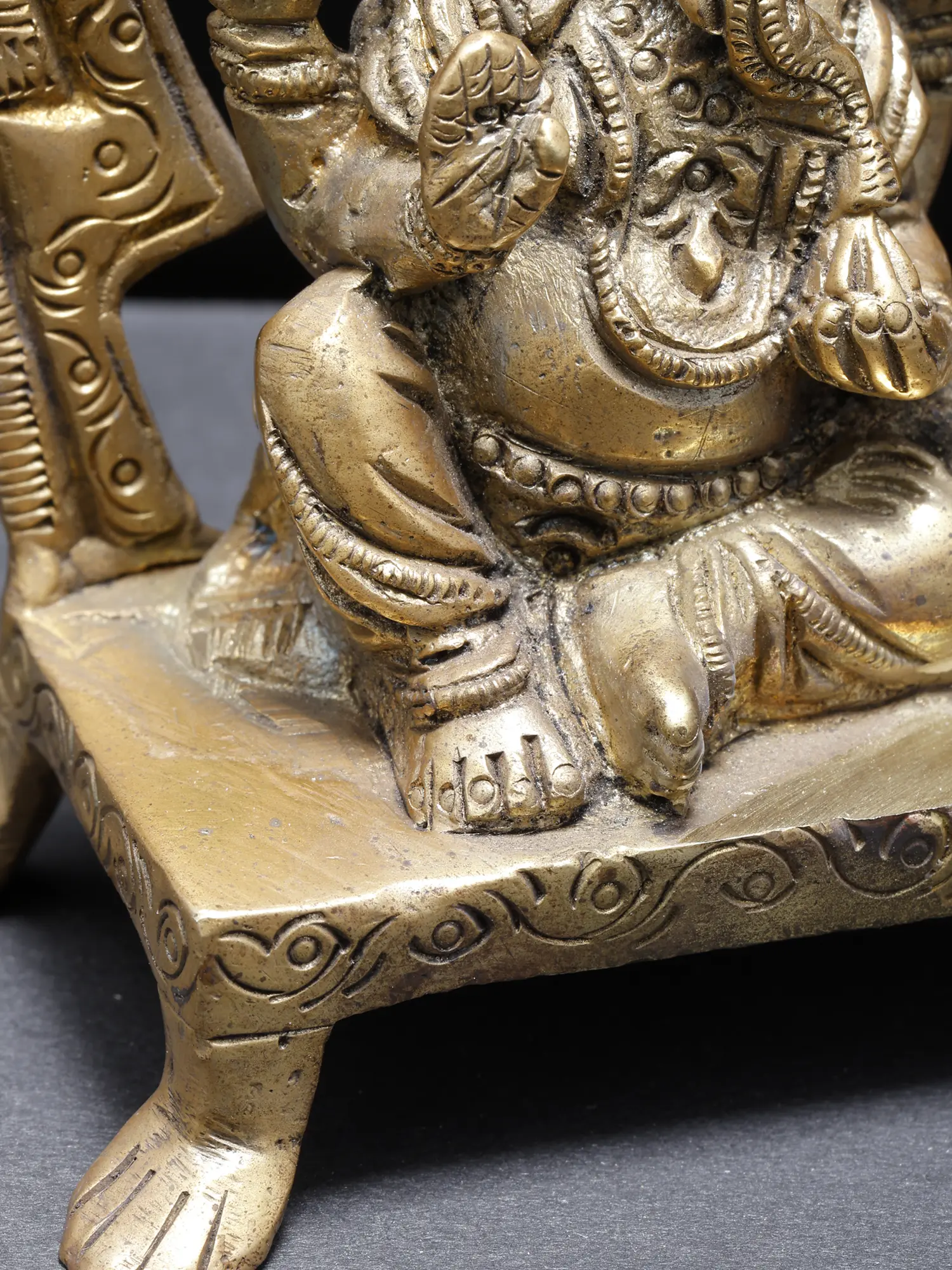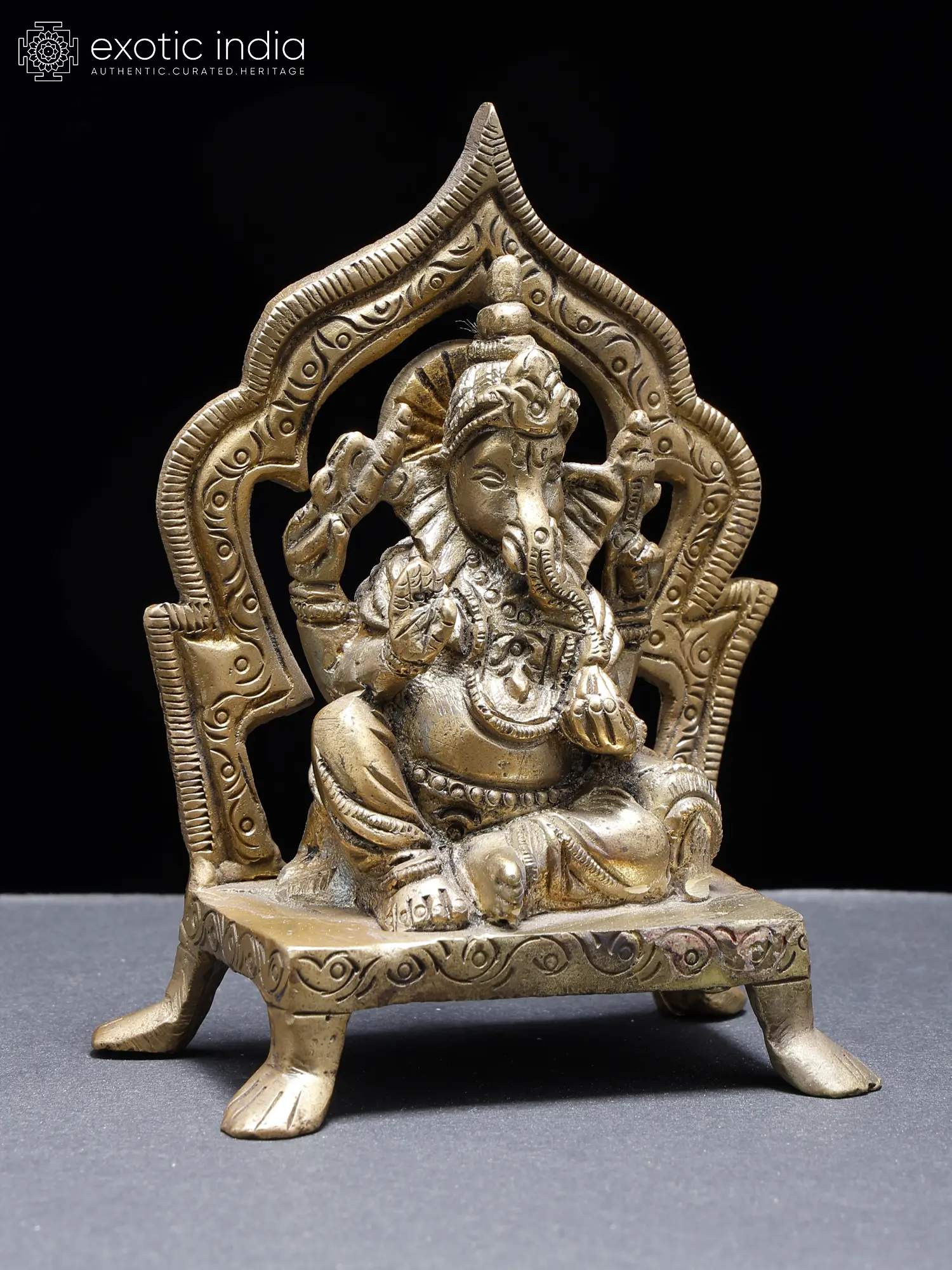 The auspicious Lord Ganesha is presented in this small brass statue in his “Raja Ganapati” form, embodying the regalia and fortune that he bestows upon the devotees.