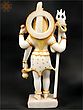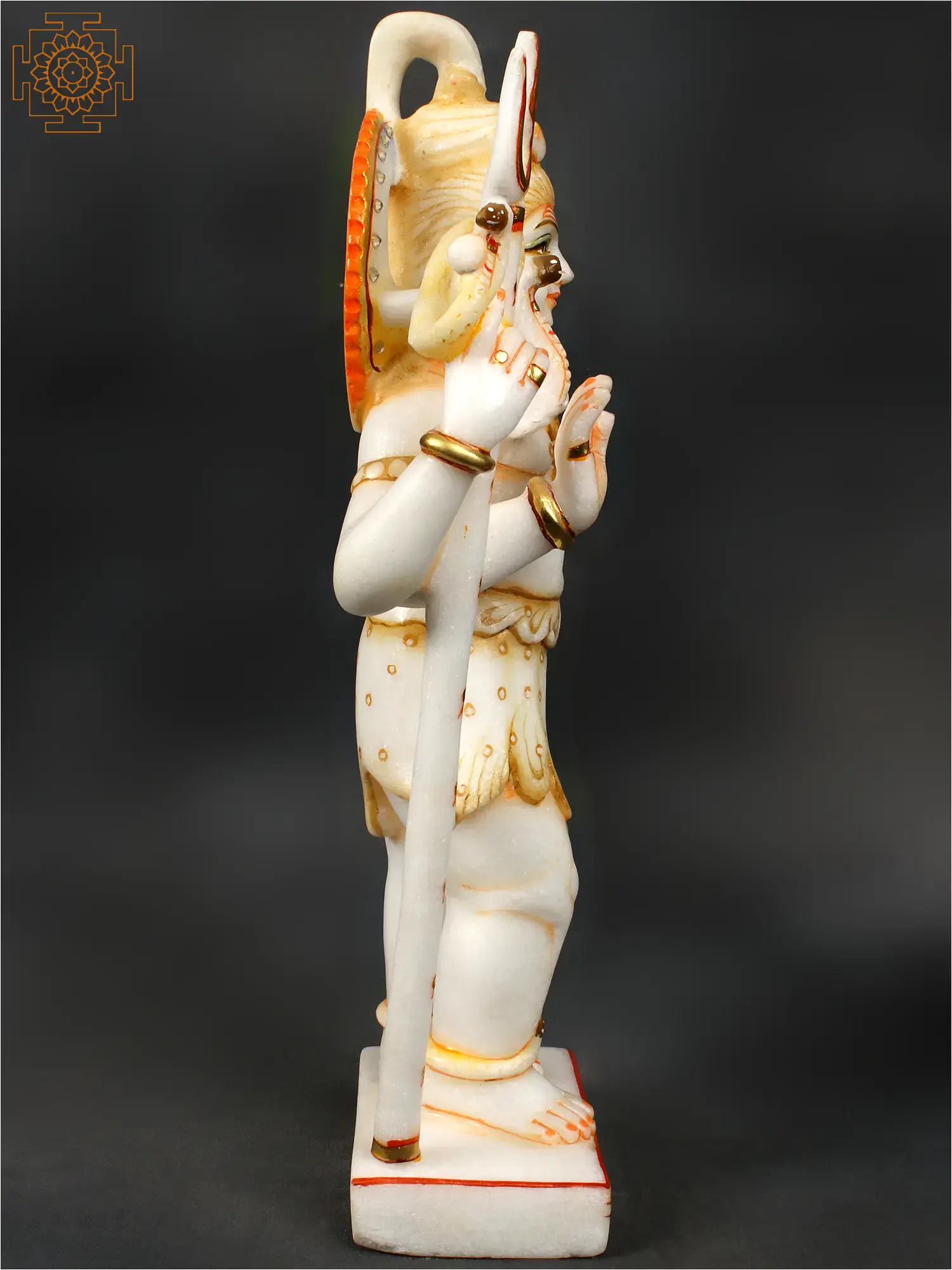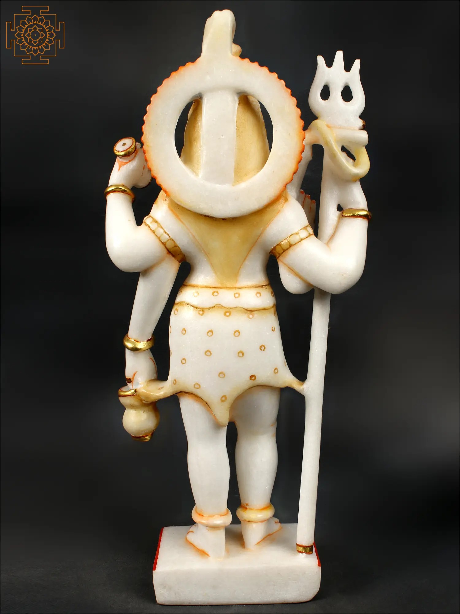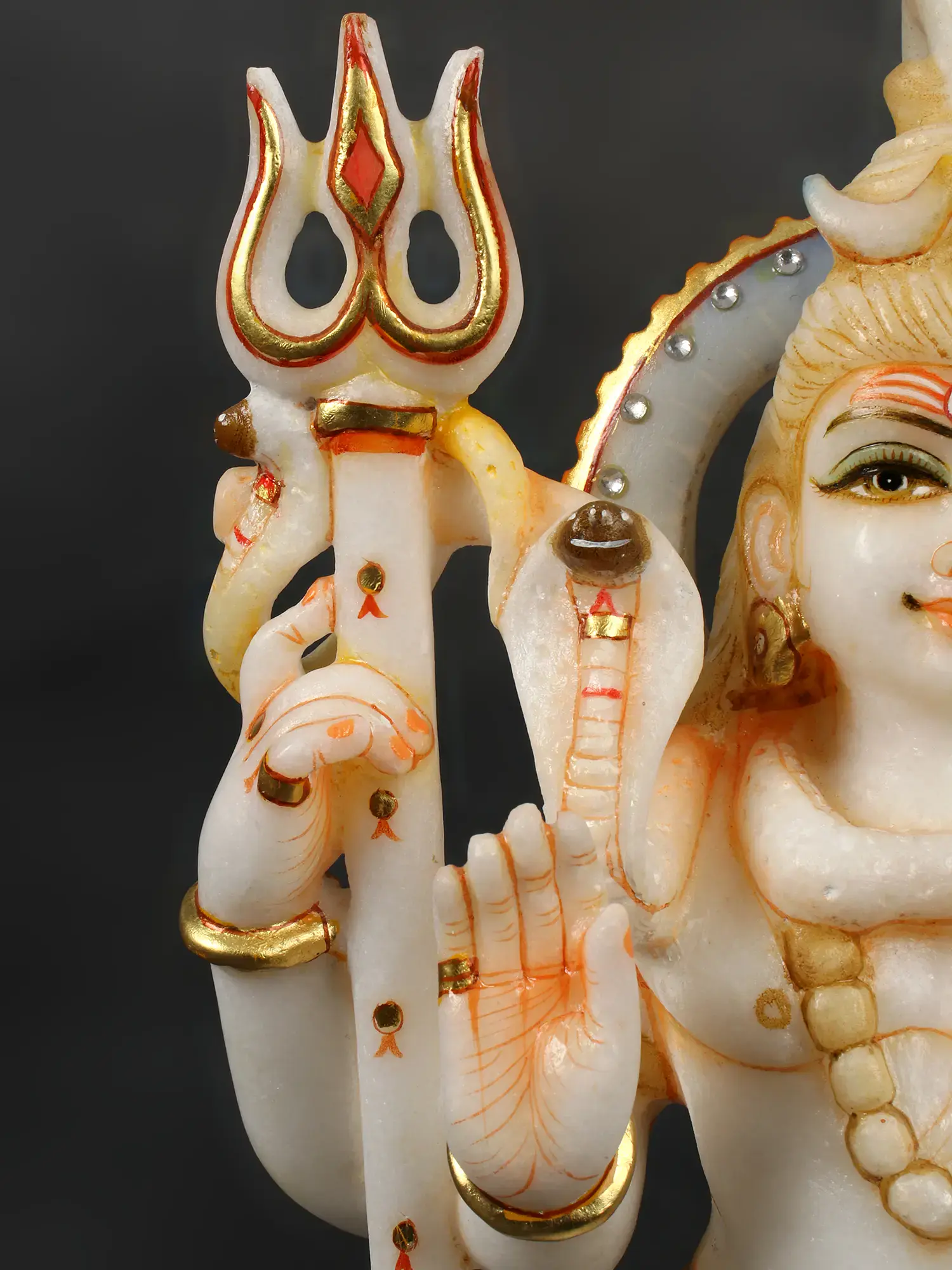 Invite the powerful and benevolent energy of Lord Shiva into your home with this exquisite white marble statue. Crafted with meticulous attention to detail, this divine representation captures the essence of the Destroyer and Transformer of the Hindu pantheon, a deity revered for his asceticism, his cosmic dance, and his role as the supreme being. The pure white marble, sourced from quarries known for their luminosity, lends an aura of celestial purity to the form. The statue portrays Shiva in his iconic, multi-armed aspect. In one hand, he gracefully holds the Trishul, the three-pronged spear symbolizing the creation, preservation, and destruction of the universe. This potent weapon represents his power to overcome ignorance and evil. In another hand, he cradles a Kapala, a skull-cup, a stark reminder of mortality and his detachment from worldly illusions. The Swastika symbol, an ancient emblem of auspiciousness and good fortune, is etched onto the Kapala, signifying the benevolent aspect of Shiva that bestows blessings and prosperity. The intricate gold accents adorning the statue, from the divine halos to the jewelry and clothing, add a regal and radiant touch, evoking the grandeur of the celestial realms.