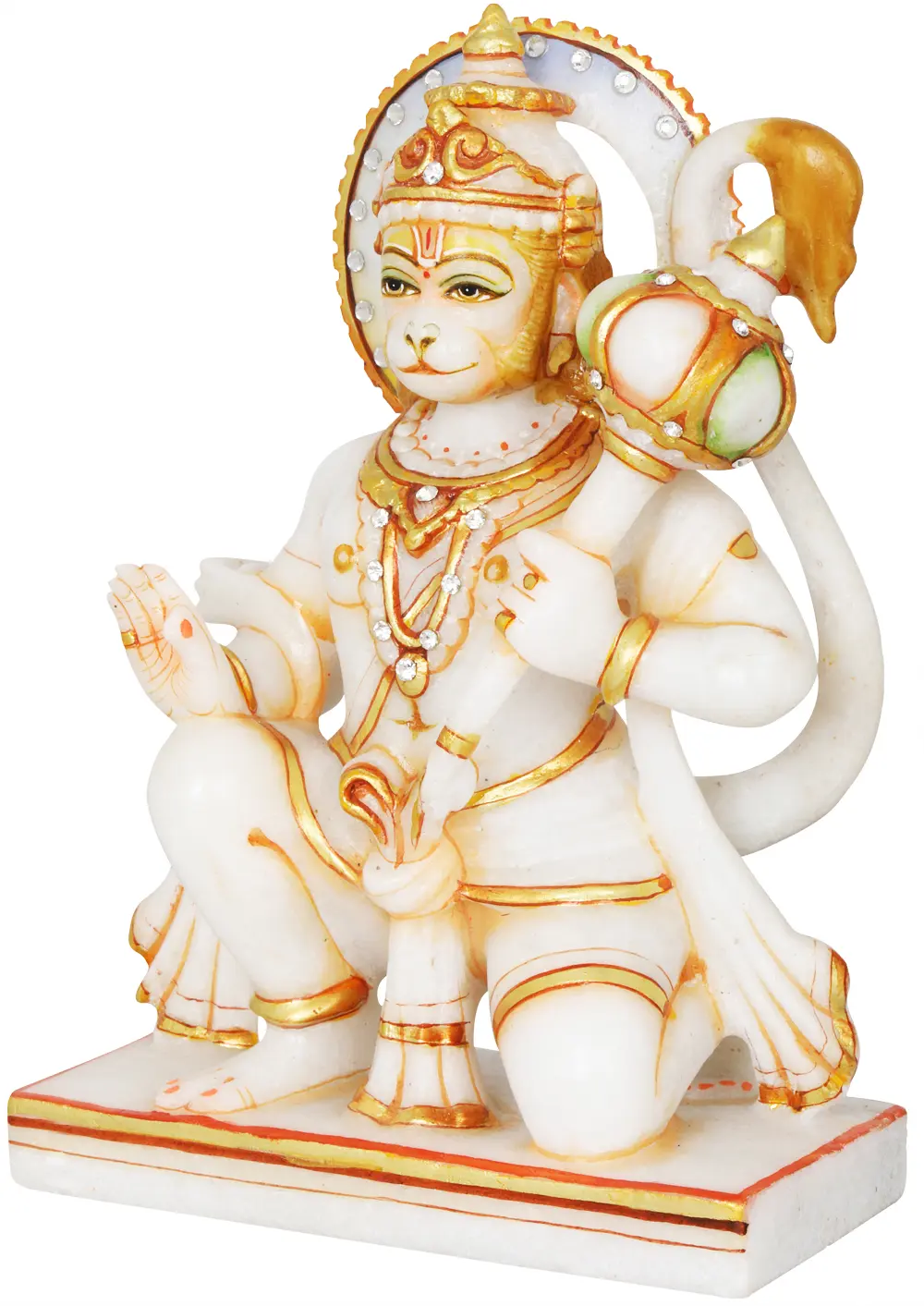 This exquisite white marble statue captures the essence of Lord Hanuman, the devoted son of Vayu and Anjani, a central figure in the epic Ramayana. Revered for his unwavering loyalty, immense strength, and profound devotion to Lord Rama, Hanuman embodies the ideals of courage, selfless service, and spiritual discipline. His likeness in marble, meticulously carved and adorned, serves as a powerful symbol for seekers of divine blessings and inner fortitude. Hanuman's story is one of extraordinary feats. From leaping across the ocean to Lanka in search of Sita, to carrying the Sanjeevani herb to save Lakshmana's life, his legendary exploits are a testament to his divine capabilities. He is often depicted as a Vanara, a celestial ape-like being, known for his intelligence, wisdom, and prowess in battle. This statue portrays him in a regal and serene posture, holding his iconic mace, the Gadha, a symbol of his power and authority. The divine aura surrounding his head signifies his elevated status and the divine grace he bestows upon his devotees.