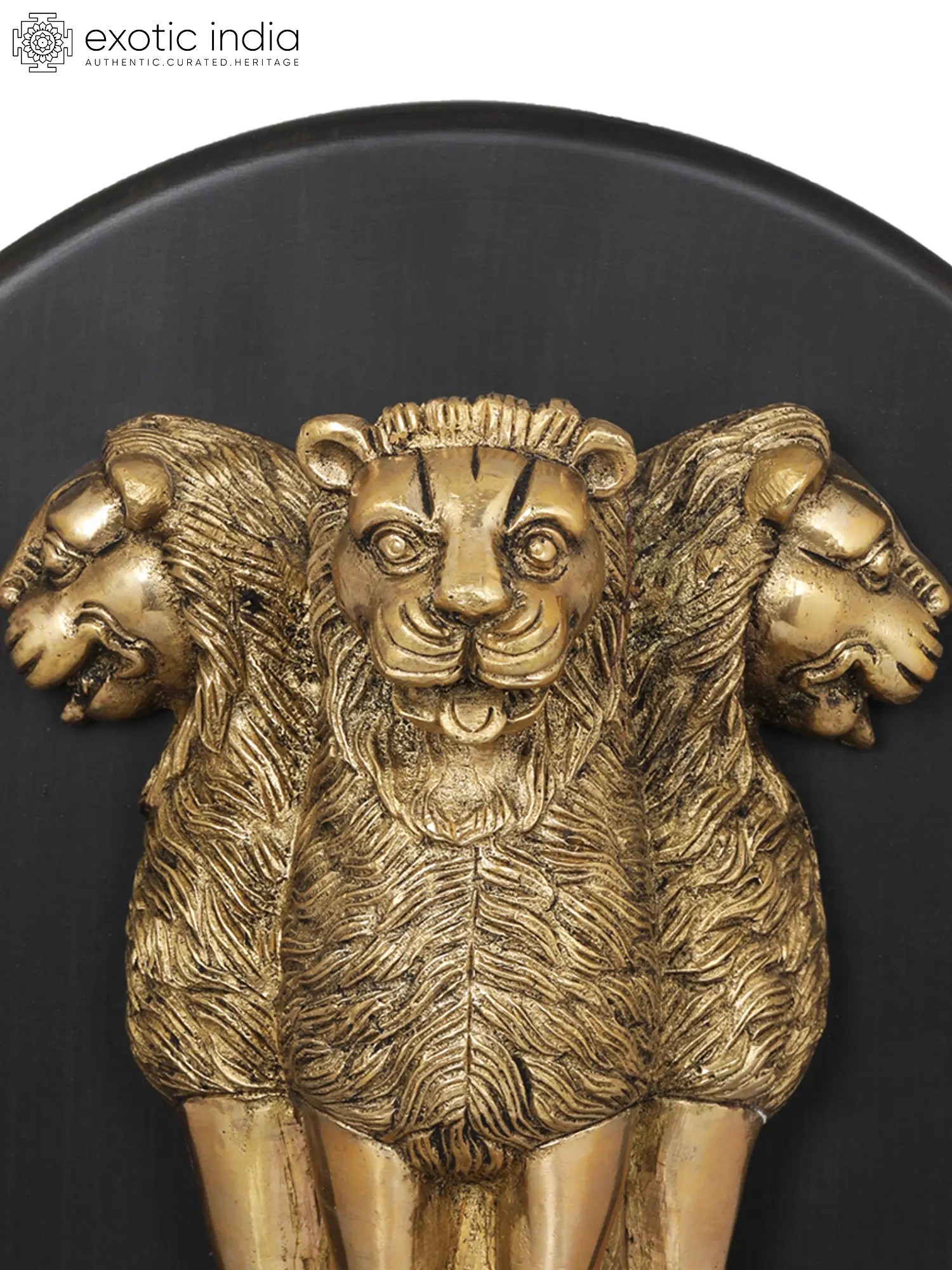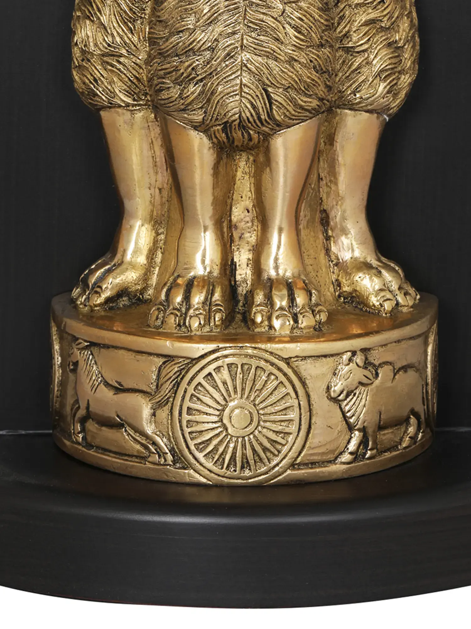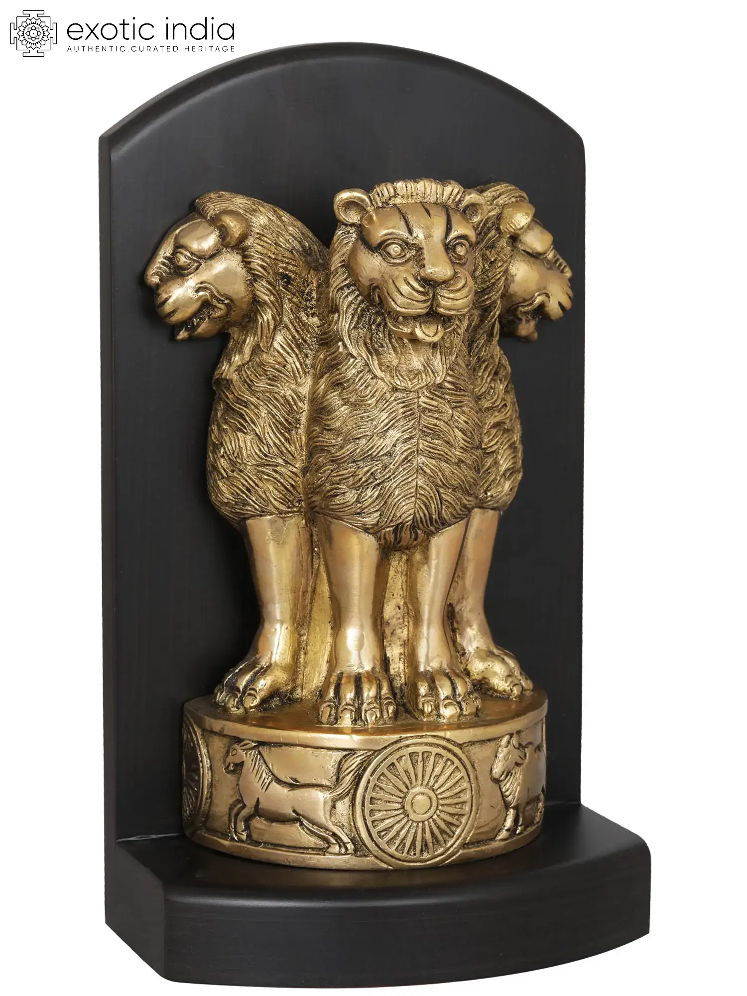 This Ashoka Stambha, a symbol of ancient Indian artistry and historical significance, is elegantly presented as a brass sculpture pasted on a wooden frame. The brass Ashoka Stambha within the frame encapsulates the iconic pillar's ornate details and symbolism. The wooden base provides a sturdy and complementary foundation, enhancing the visual appeal. This artistic fusion pays homage to Emperor Ashoka's legacy and his commitment to non-violence. As a meticulously crafted piece, this Ashoka Stambha becomes a tangible link to India's rich cultural heritage, combining metalwork finesse with the warmth of wood, making it a captivating centerpiece of historical and artistic value.