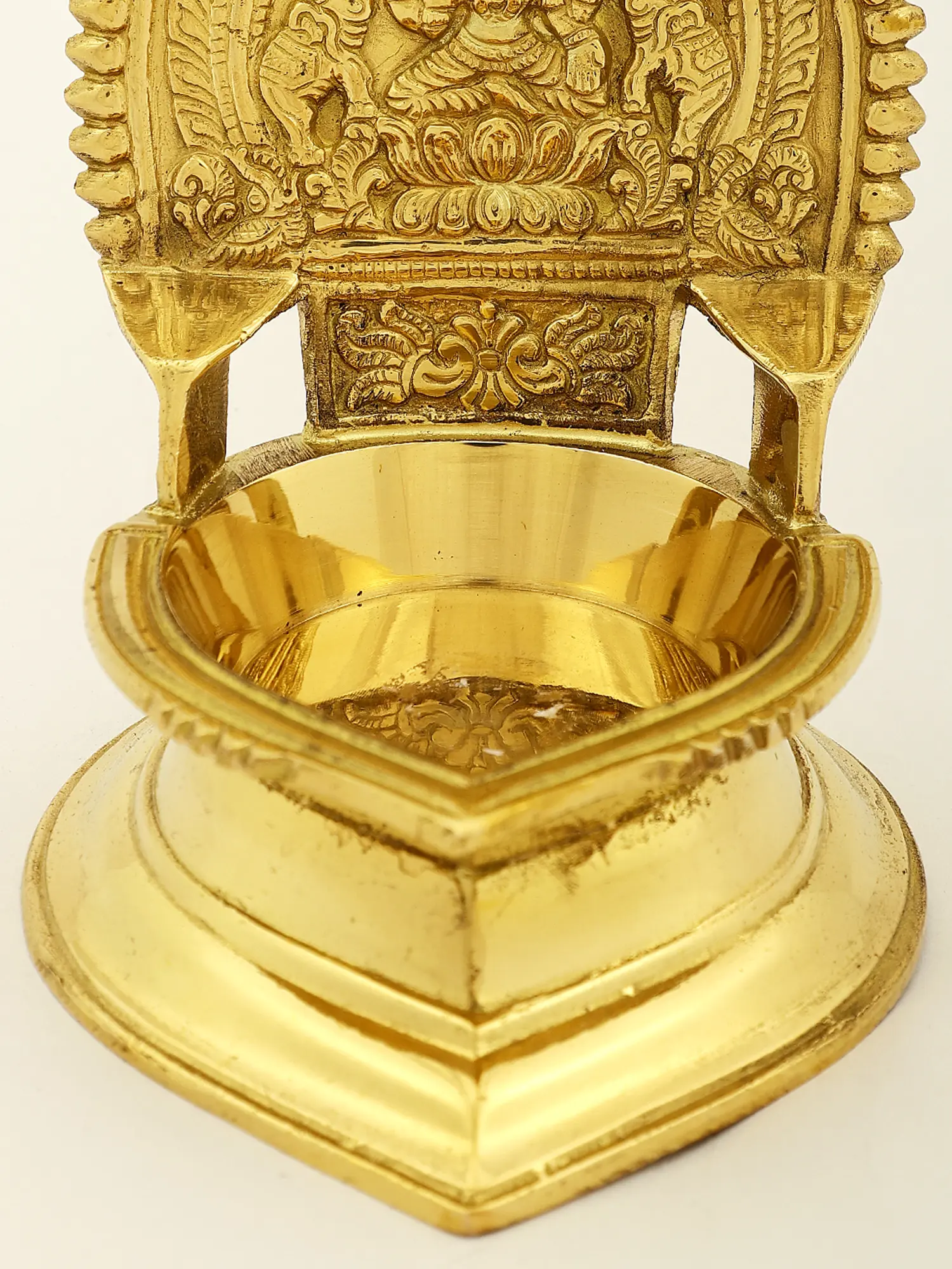 This brass lamp is a traditional Lakshmi Vilakku, with a crown depicting Goddess Gajalakshmi and a deep flat floor lamp oil basin. Goddess Gajalakshmi is the Hindu goddess who protects riches and prosperity. In this image, she is surrounded by two elephants, both of which are emblems of prosperity and fortune. The Goddess is shown with four arms, reclining in Padmaasana (lotus pose) yoga posture. She holds a lotus in each of her upper arms, while her lower hands are in the Abhaya (fearless) and Varada (divine blessings) mudras. It is thought that lighting this lamp communicates the devotees' prayers through the light of the lamp and provides the deity's blessings through warmth.