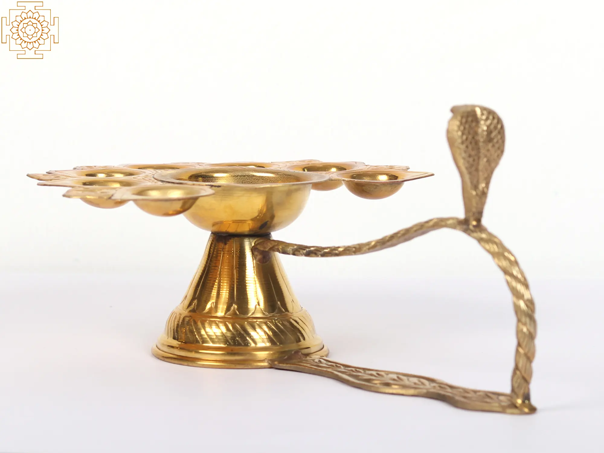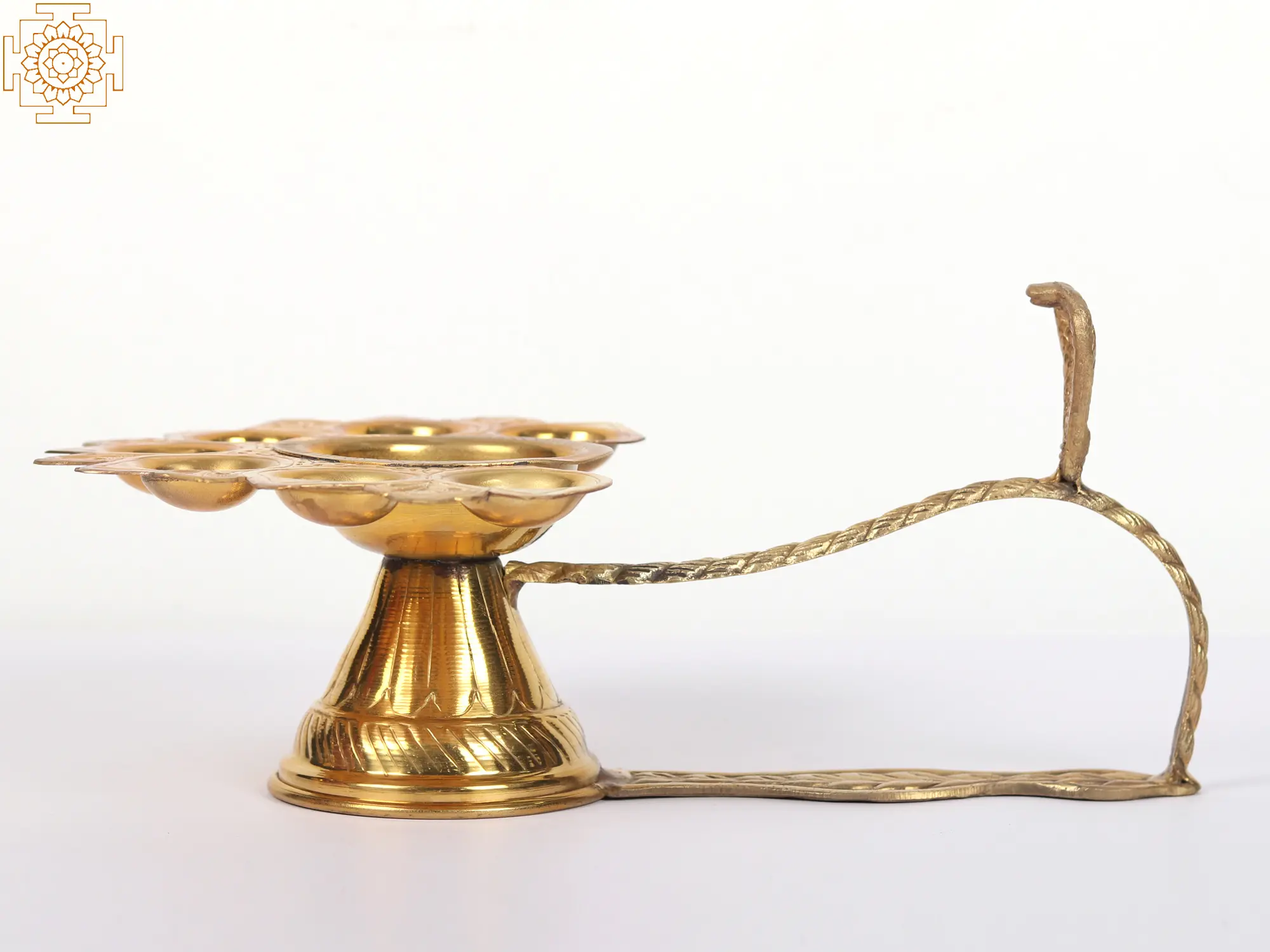 This Brass Hand-Held Panchadeepam is suitable for presenting almighty observances and performing arti. The lamp's focal point is the Naga or serpent carved at the end of the lamp's handle, which is made of beautiful brass. The image of Naag, associated with Lord Shiva on the lamp multiplies the lamp's auspiciousness. The lamp's wicks are clean, resulting in a straight but soothing flame. The wick holes have depth making it suitable for burning camphor as well. The five wicks ensure that light spreads in all five directions, allowing for total darkness eradication. You will be able to make a more pleasurable offering if you incorporate this lamp into your normal worship practices.