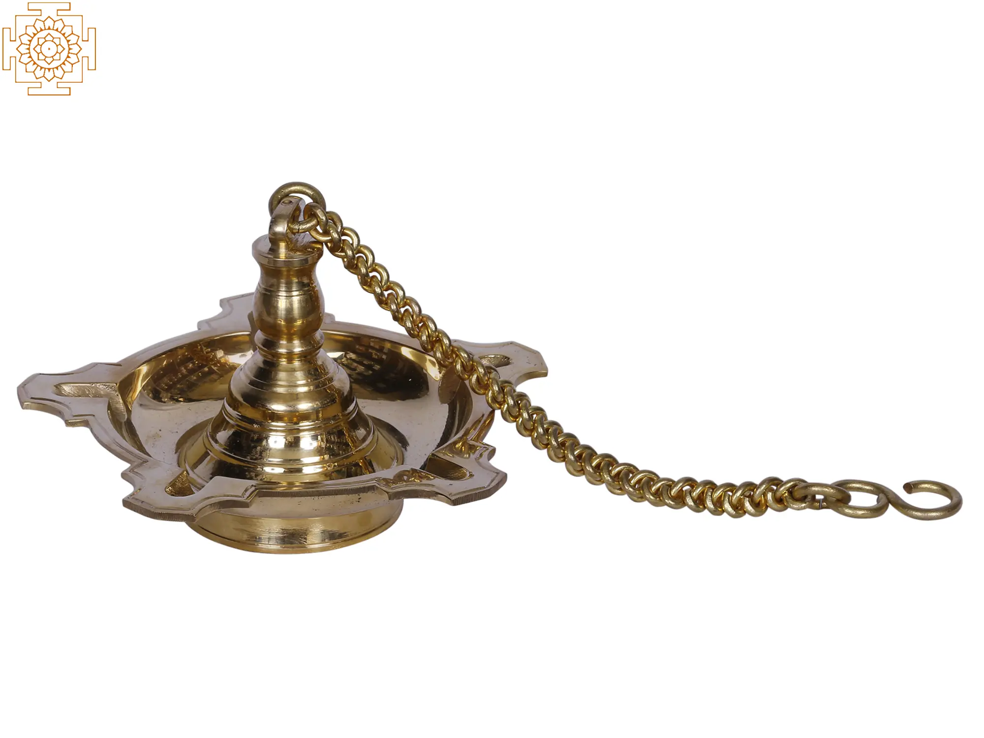 This brass hanging lamp is known as a Thooku Villaku and is intended to illuminate the land's surface. The round oil disc is usually carved with five sharp wicks. A lengthy interconnected chain with a hook secures it. These lamps are utilized for traditional lighting during festivals and are hung from the columns and beams of temple verandahs. These lamps are deemed auspicious and can be lit regardless of religious celebrations.