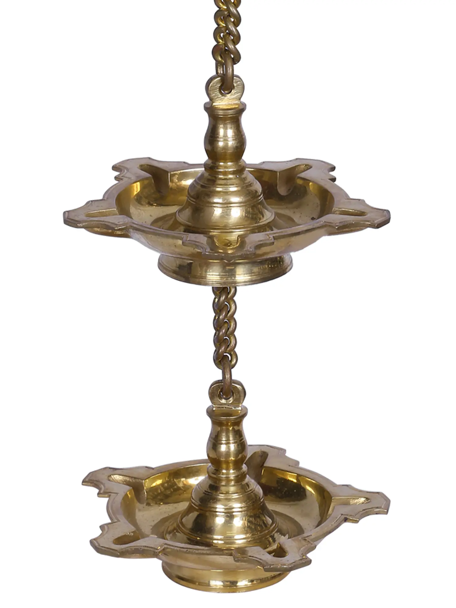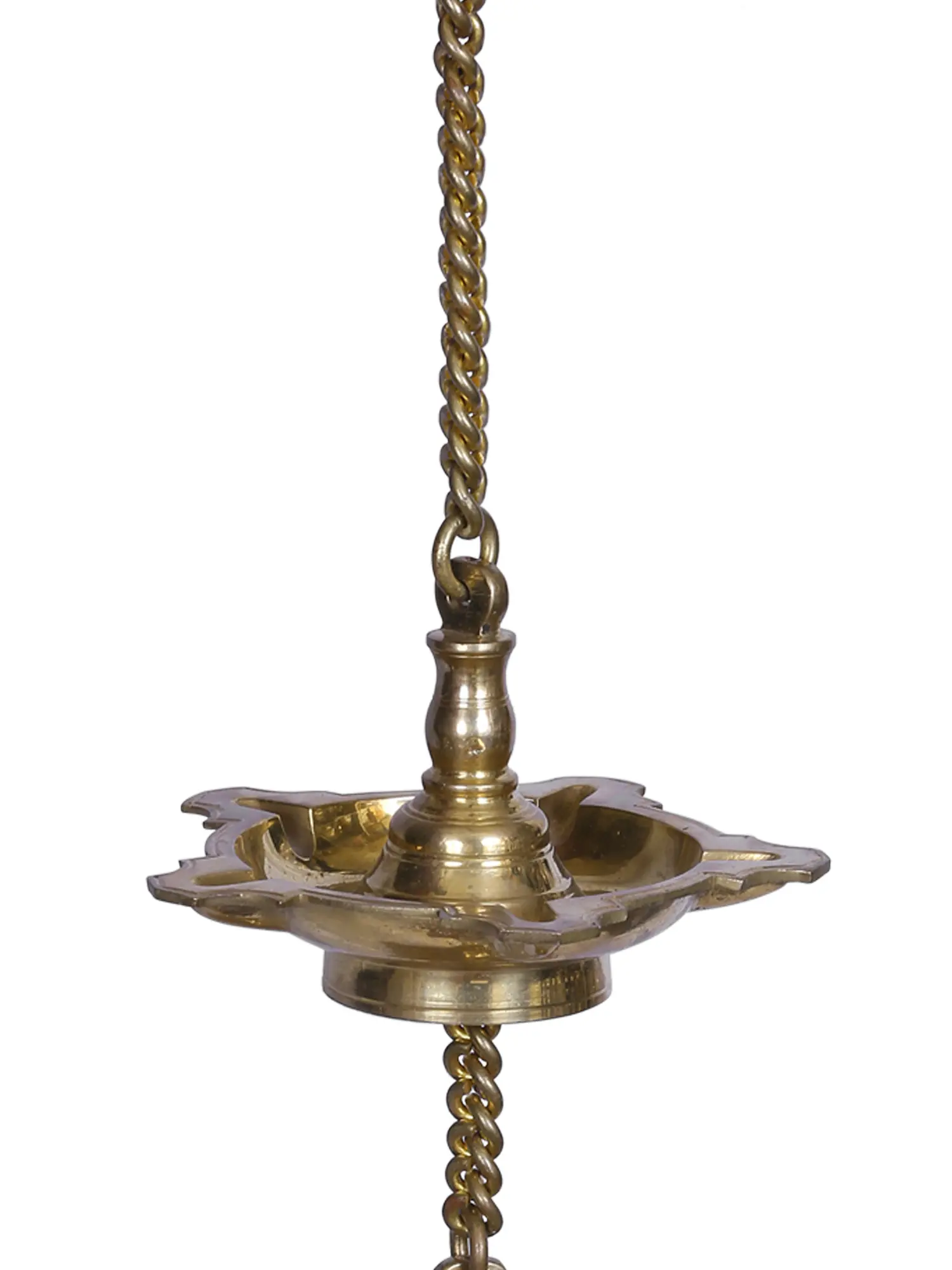 This brass hanging lamp with three layers and five wicks is a homage to Agni's sacred warmth. This lamp is made of high-quality brass and has a matt gold finish. Although it is hefty, it may be hung with a strong interlocking chain. This is a simple yet powerful way to honor the Agni and request warm blessings in return. During festivals, this light may also be utilized as a decorative item.