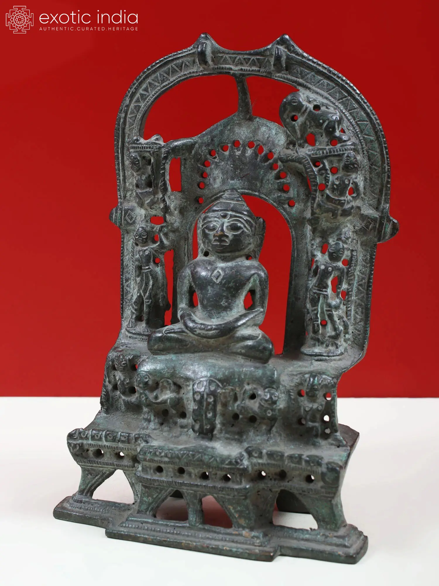 The intricate detailing on the shrine speaks to the rich artistic traditions of Indian metalwork and the deep-seated reverence for Jain Tirthankaras. The architectural elements of the arch, adorned with geometric patterns and stylized motifs, create a sense of grandeur and sacred enclosure. Flanking the central figure are smaller attendant figures, possibly representing Yakshas or Yakshinis, celestial beings who serve as protectors and attendants to the Tirthankaras in Jain cosmology. Their presence underscores the divine aura and veneration accorded to the Jina. The base of the shrine, designed with a series of perforated patterns and stylized animal motifs, adds further layers of symbolic meaning and visual interest, evoking strength and stability. The choice of brass, a material often associated with durability and auspiciousness, further enhances the object's spiritual significance and longevity. The Jain tradition reveres the Tirthankaras as spiritual guides who have achieved enlightenment and shown the path to liberation. The 24 Tirthankaras, including Rishabhanatha, the first, and Mahavira, the last, are central figures in Jain worship. This shrine, by capturing the essence of a Jina in a state of deep meditation, offers a visual conduit for devotees to connect with these spiritual ideals. The presence of the Jina is believed to bless the space and its inhabitants with peace, prosperity, and spiritual growth. This piece is not merely a decorative item but a sacred artifact, designed to inspire contemplation and foster a connection to the timeless teachings of Jainism. Its compact size makes it an ideal addition to a personal altar, a study, or any space where a touch of spiritual elegance is desired.