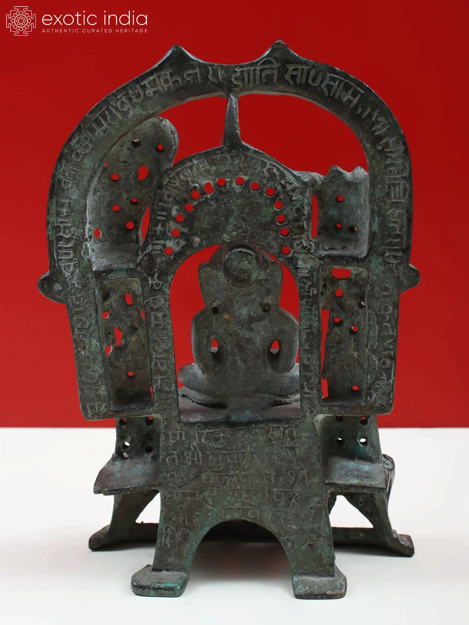 This exquisite brass shrine embodies the profound peace and spiritual serenity central to Jainism. Crafted with meticulous detail, the centerpiece features a Jina, seated in the meditative lotus posture (Padmasana). The Jina's tranquil gaze and composed expression are hallmarks of spiritual attainment, symbolizing the liberation from worldly attachments and the attainment of omniscience. The subtle diamond-shaped mark on the chest is often a symbol of purity and spiritual enlightenment in Jain iconography. The entire composition is framed by an ornate arch, reminiscent of temple architecture, suggesting the sacred space within which the divine resides.