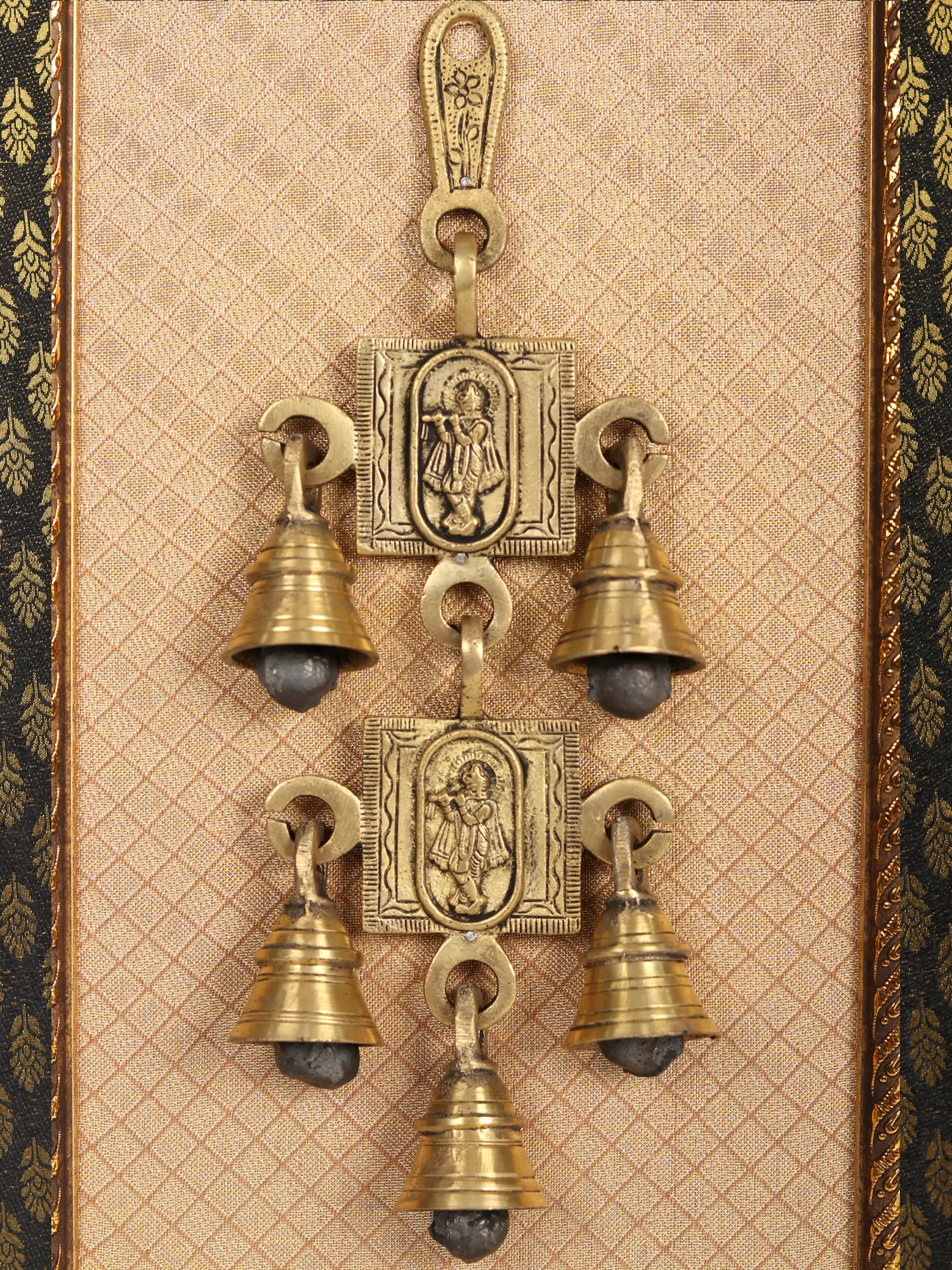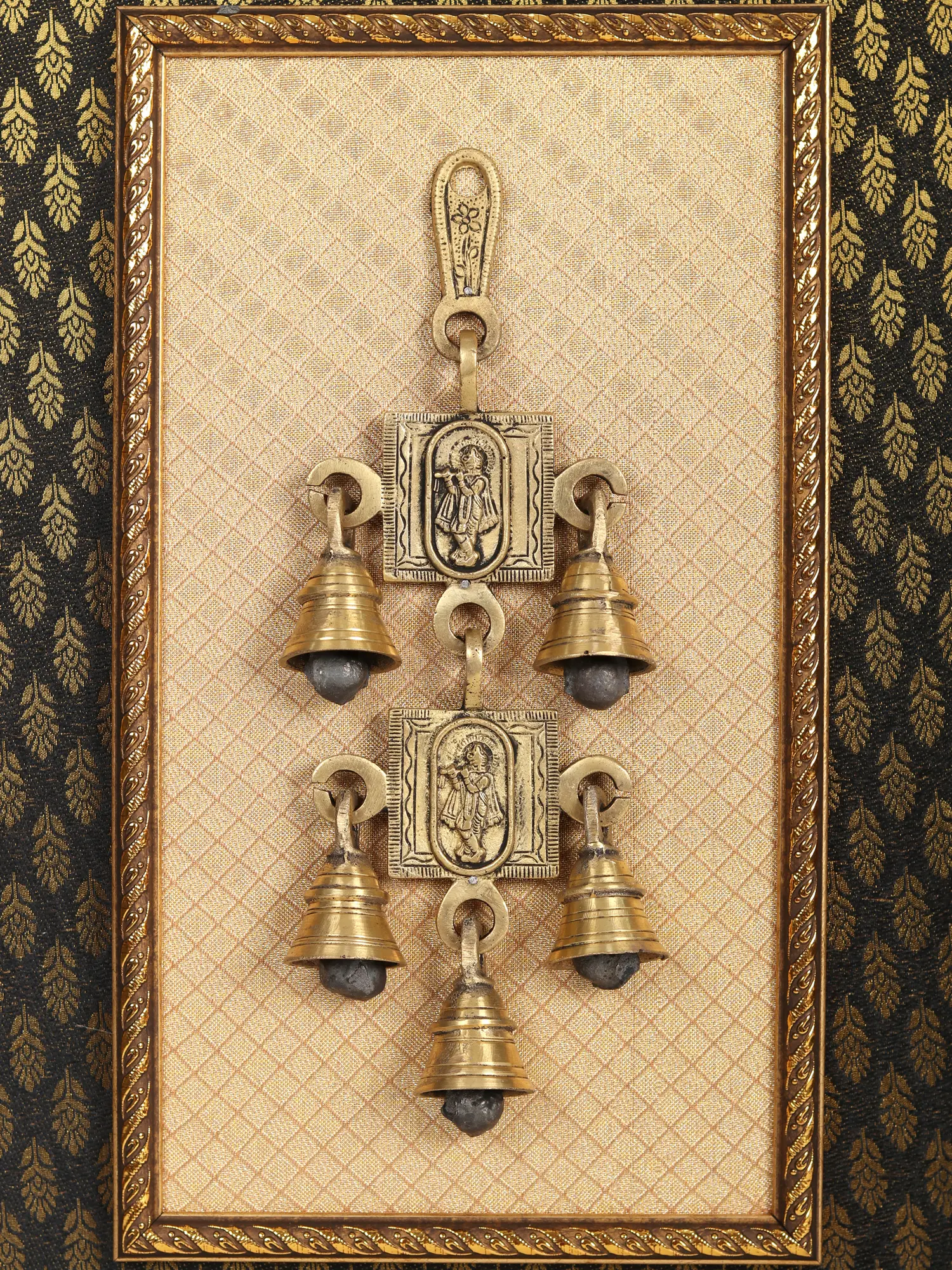It is said that you become Krishna if you truly love him. Meera the revered saint lost herself to Krishna as she loved him beyond limits. This Krishna wall hanging brings the unstoppable love of Krishna and Krishna to your home. The addition of five melodious bells adds a musical element, creating a soothing ambiance. Encased within a wooden frame, adorned with a black printed cloth background, it creates a striking contrast that further enhances its aesthetic appeal. This wall hanging serves as a captivating spiritual and decorative piece, infusing any space with the divine presence of Lord Krishna.