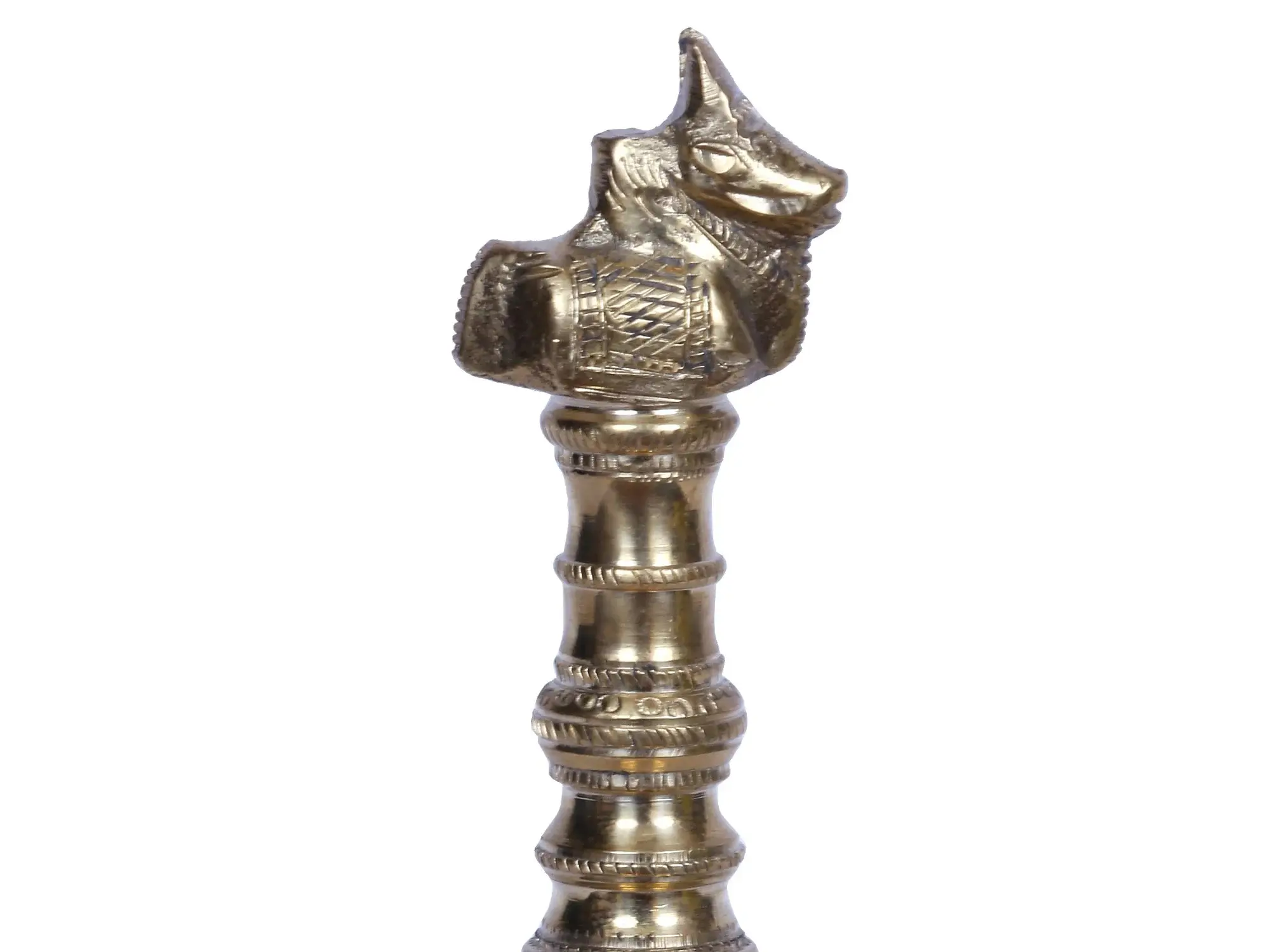 Embrace the sacred sounds of devotion with this exquisitely crafted Brass Nandi Handheld Bell. This bell is more than just an instrument; it's a conduit to the divine, designed to enhance your spiritual practices and bring a sense of peace and serenity to your home. The traditional design, featuring a finely detailed Nandi bull as the handle, evokes a deep connection to ancient Indian traditions and their rich mythological heritage.