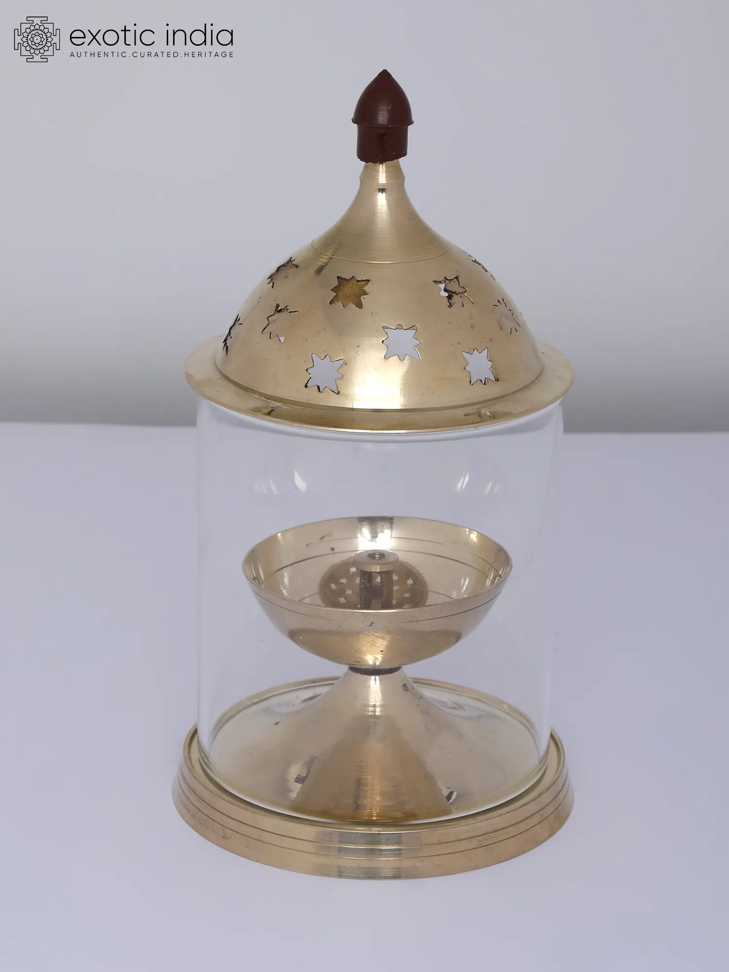 An Akahnda Diya is a light that stays burning for a long period. This brass Akhanda Diya has a glass cage that allows it to stay lighted all night or for a longer period of time by blocking the flow of air. The Diya with the main structure of the oil container, the elongated nozzle and the wick hole, is a typical instrument for worship. This Diya, designed to accompany heavenly rites, plays a vital part during festivals like as Navratri and Akahnda Jyot. This Diya's royal appearance makes it even more appealing and ideal for a personal worship place.