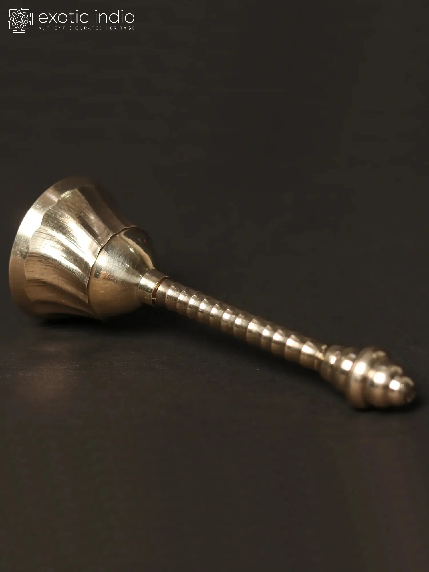 This brass puja bell boasts a wavy-textured handle and a small, intricately designed head. Its simplicity exudes elegance. In Hindu rituals, ringing the bell signifies the invitation of the divine, dispelling negative energies and awakening spiritual awareness. Its melodious chime resonates with the sacred, creating an atmosphere of reverence and focus.