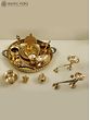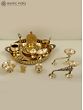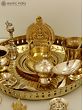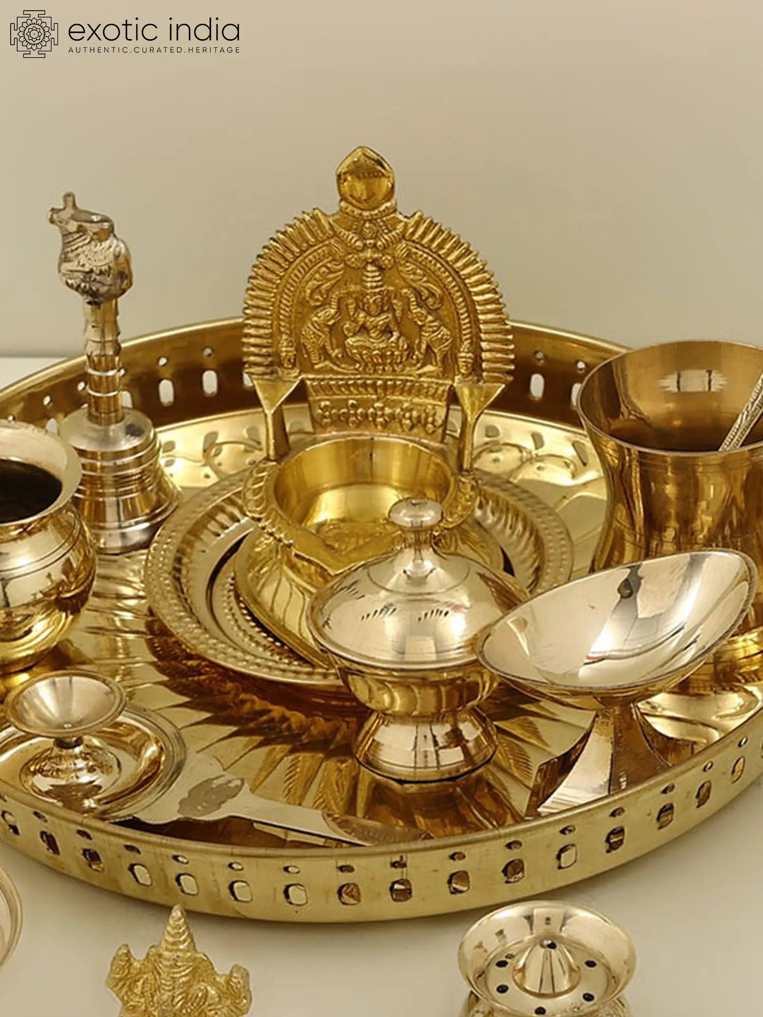 A Puja Thali is a ceremonial plate that contains materials used to make specific offerings to deities on special occasions. There are several varieties of Puja Thalis made up of ceremonial artifacts. This brass Puja Thali is a collection of lovely brass things such as a Panchapatra (Panchamrita container) used for offering Panchamrita, a Pali (spoon), and a Lota (a pitcher) used for presenting Gangajal. There is a Dhoop Dhaan that is used to make smoke by burning coconut husk. A single Camphor aarti lamp is used to provide the light of burning camphor. The little Thali may be used to store cut fruits or to house the miniature Ganesha figurine and perform Abhishek. Gajalakshmi Vilakku is another item placed on the plate to offer light to the lamp.