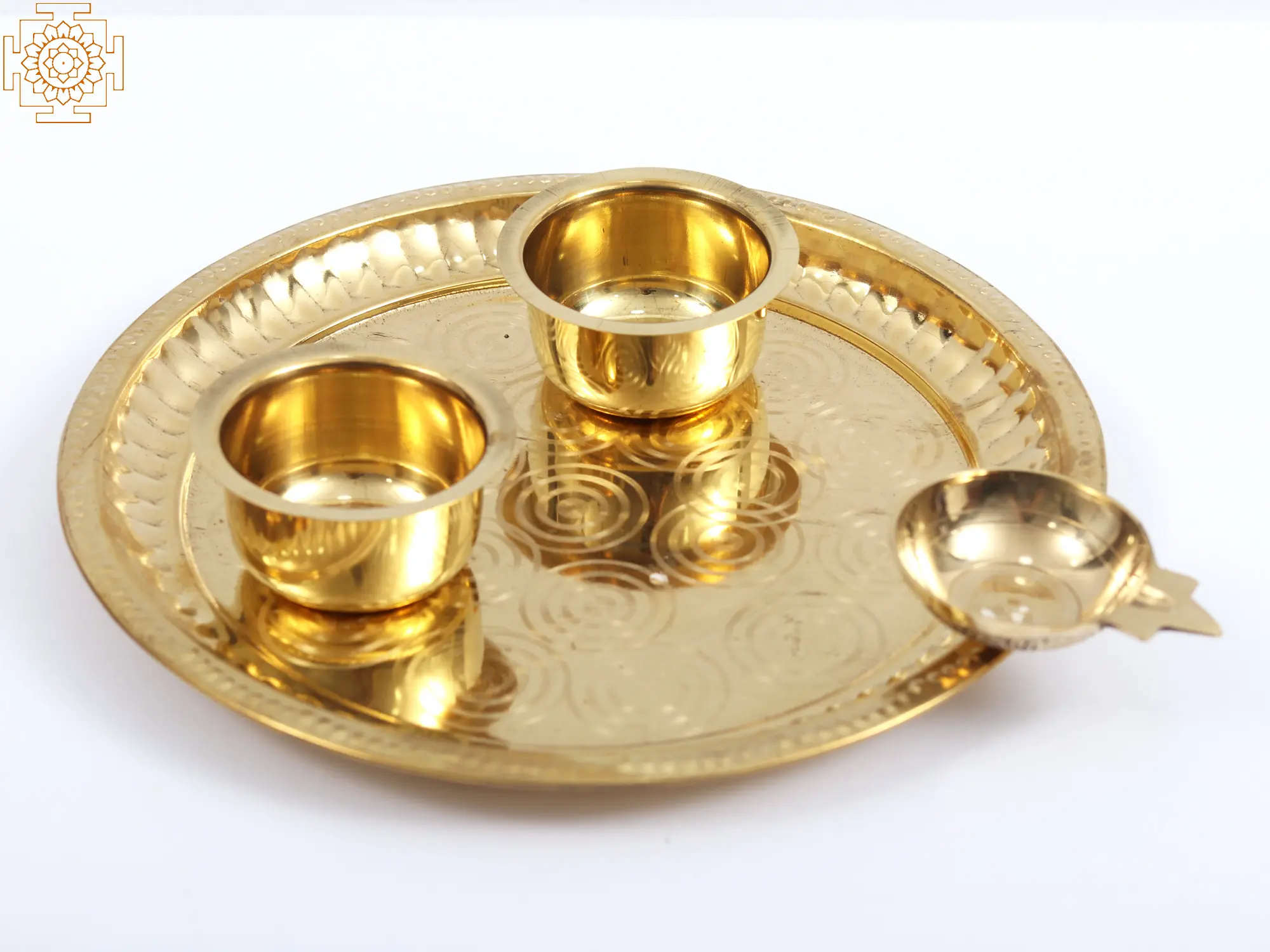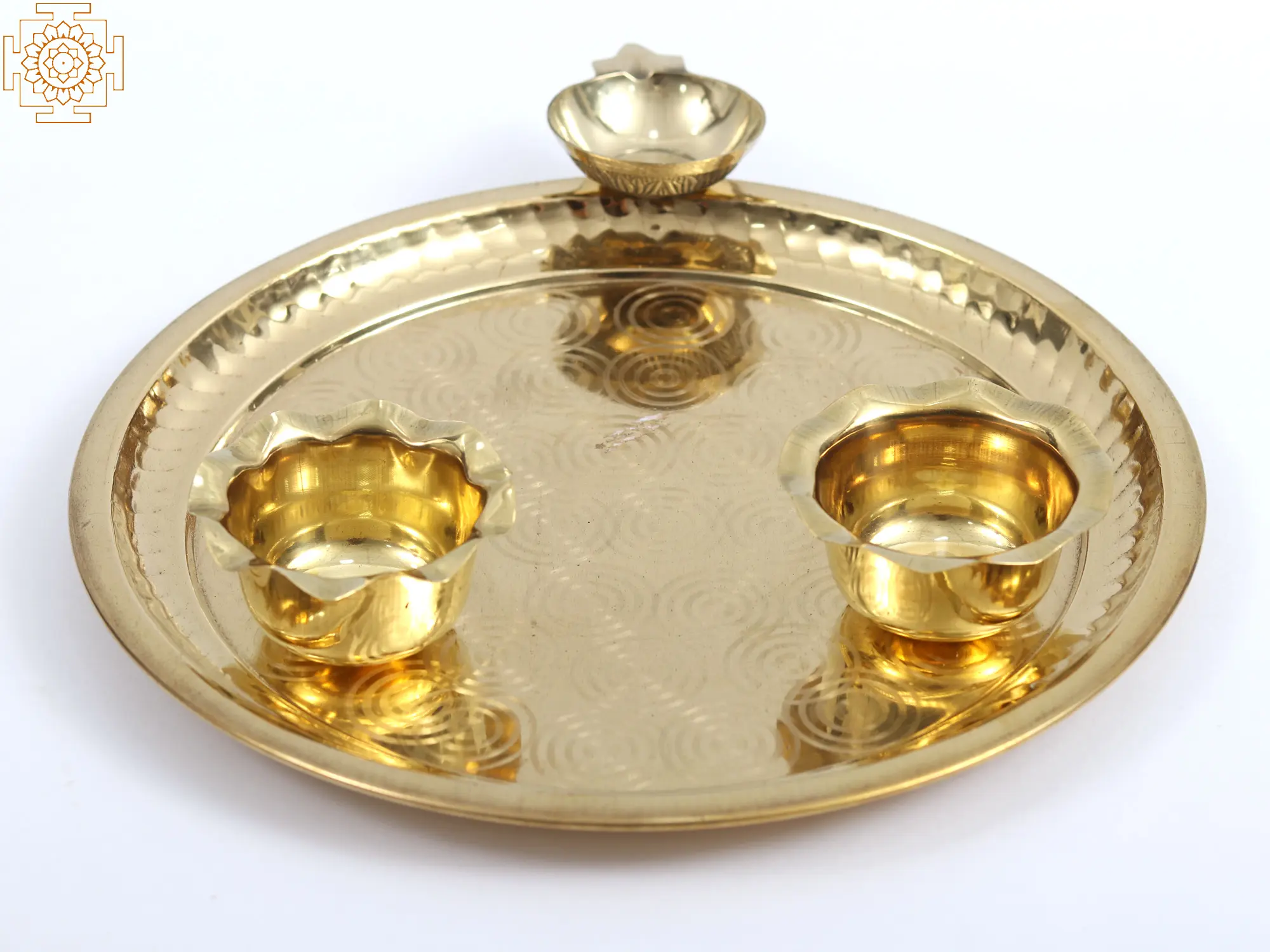 This Puja set comes with a Thaali (plate), two water holders and a beautiful Diya in the centre, the perfect combination for your daily Puja needs. Crafted with pure brass, this Thali set brings purity and sacredness in your ritual experience.