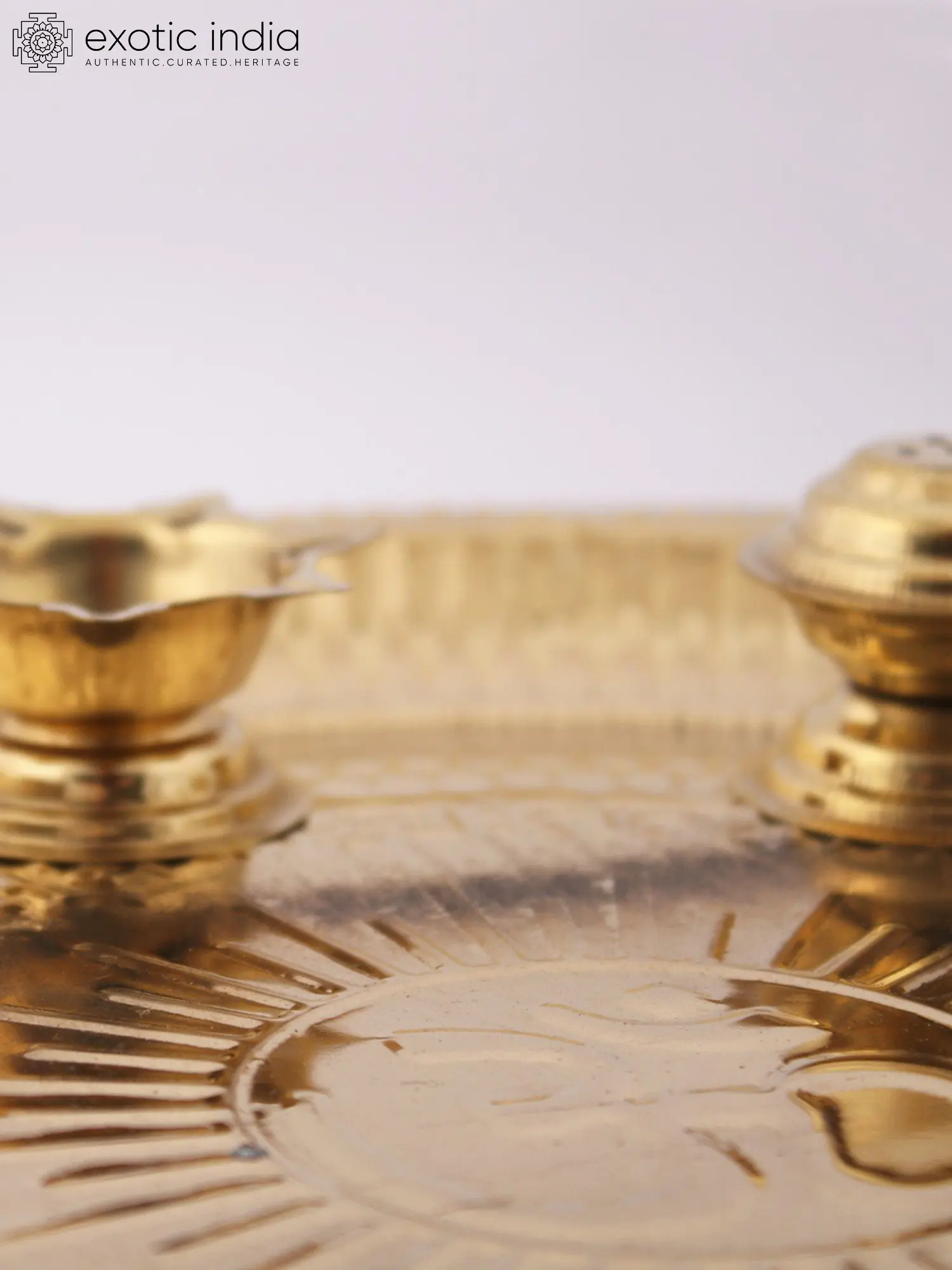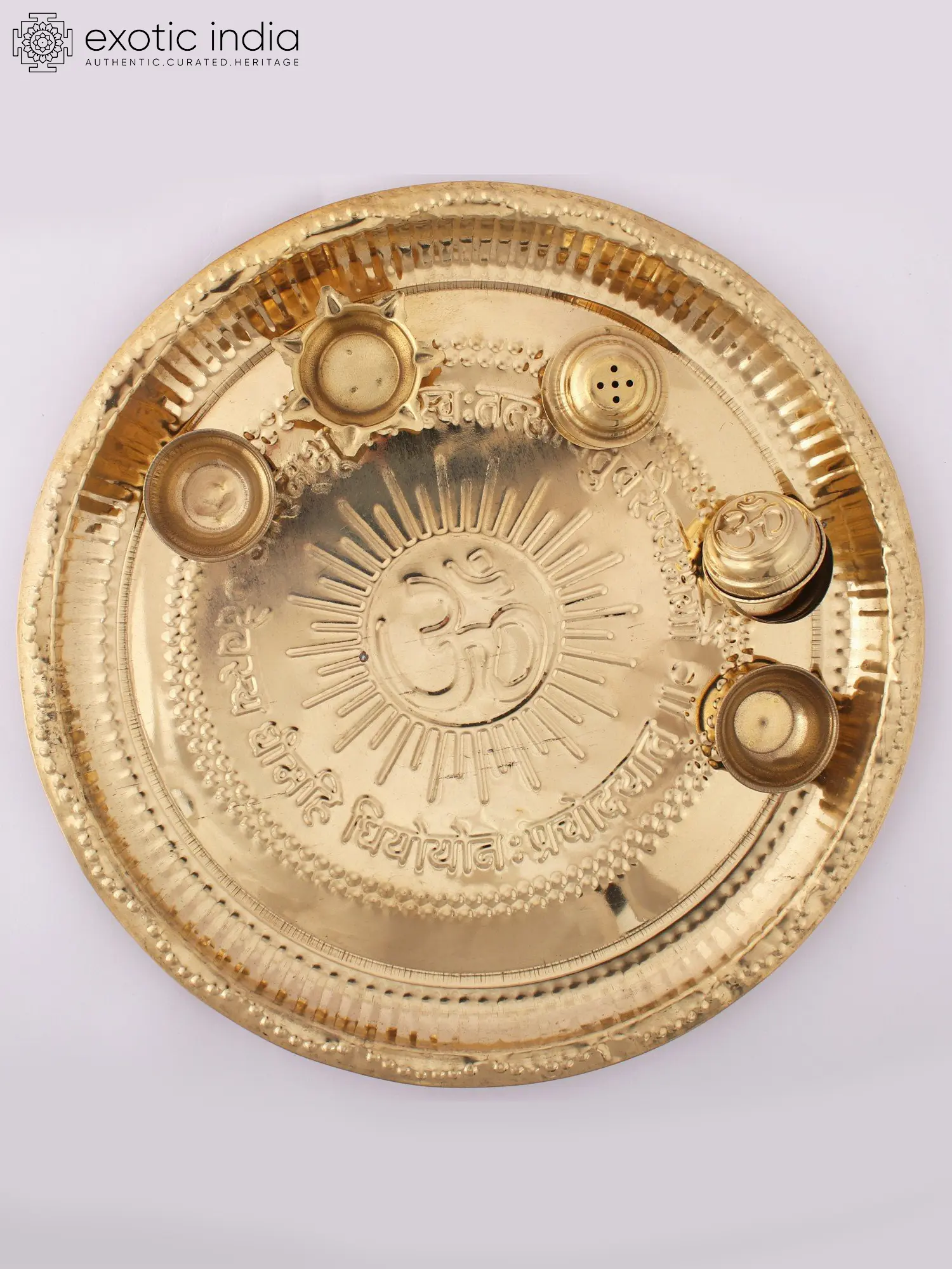 Many ritual objects are blessed with the symbol of Om to increase their sacredness. This lovely brass Puja Thali with an Om symbol at the center is a practical ritual device that includes two Pancha Pradeepams (five-wicked lights) and two basins for storing Kumkum and uncooked rice for Tilak (the holy practice of applying a Kumkum mark to the forehead), one incense stand, and one prasadam container. The Thali features elevated corners that enable a firm grip. This form of Thali has been used for a long time and aids in rituals associated with welcoming guests during ceremonies.