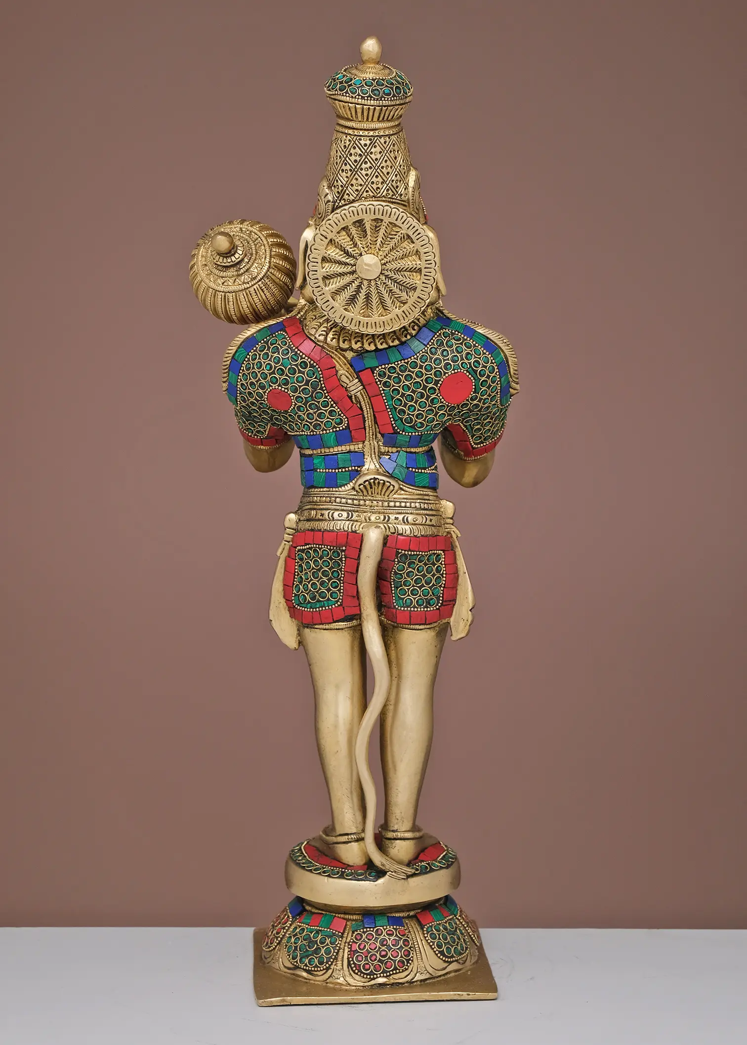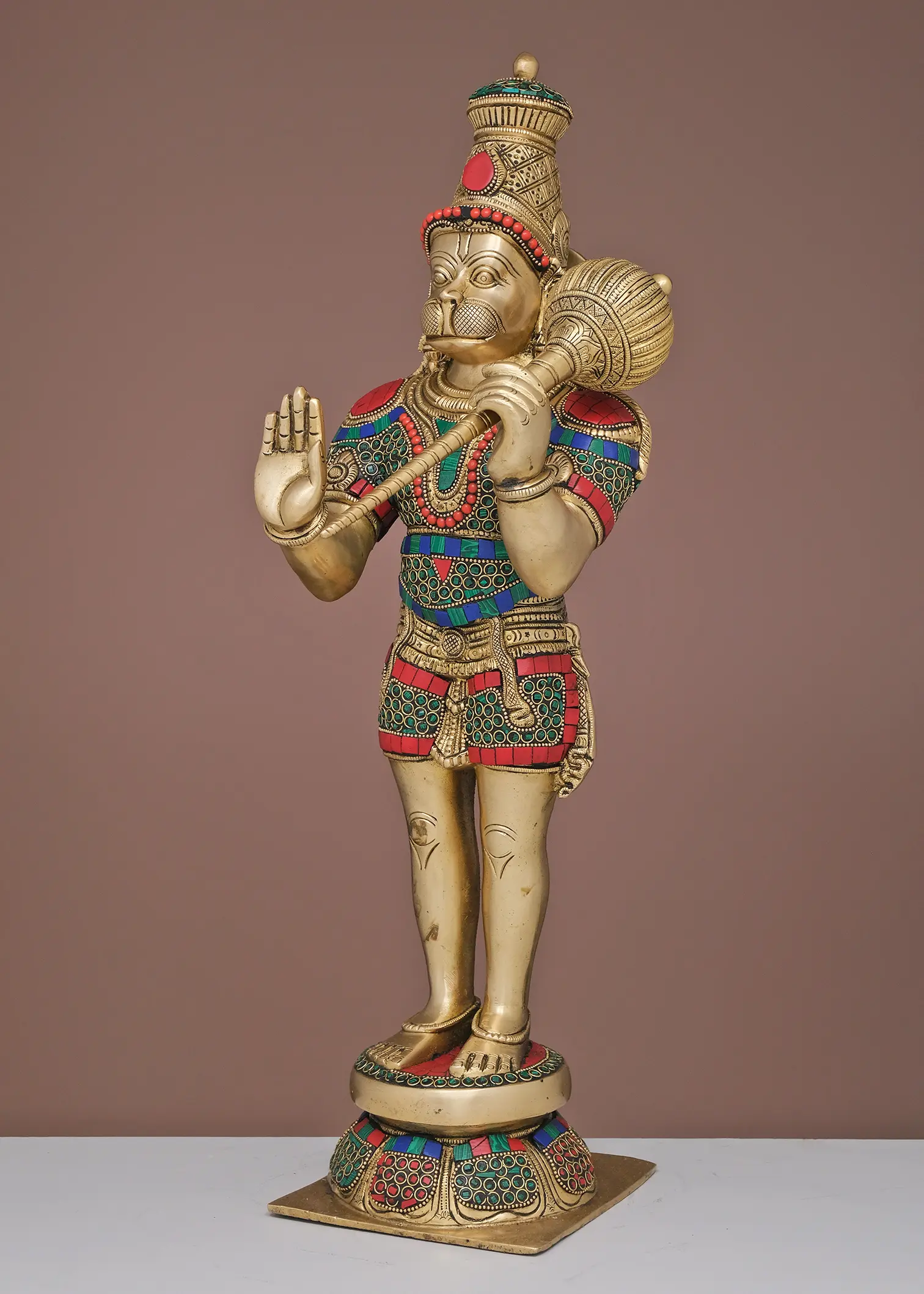 Cloaked in regal attire, adorned with traditional jewellery and a “Karanda Mukut” adorning his brow, Hanuman, “the remover of all sorrows and hurdles”, exudes a majestic aura. This divine artwork, crafted in brass and embellished with intricate inlay work, signifies the embodiment of unwavering devotion, strength, and divine protection, inspiring a deep sense of faith and reverence in the hearts of those who behold it.