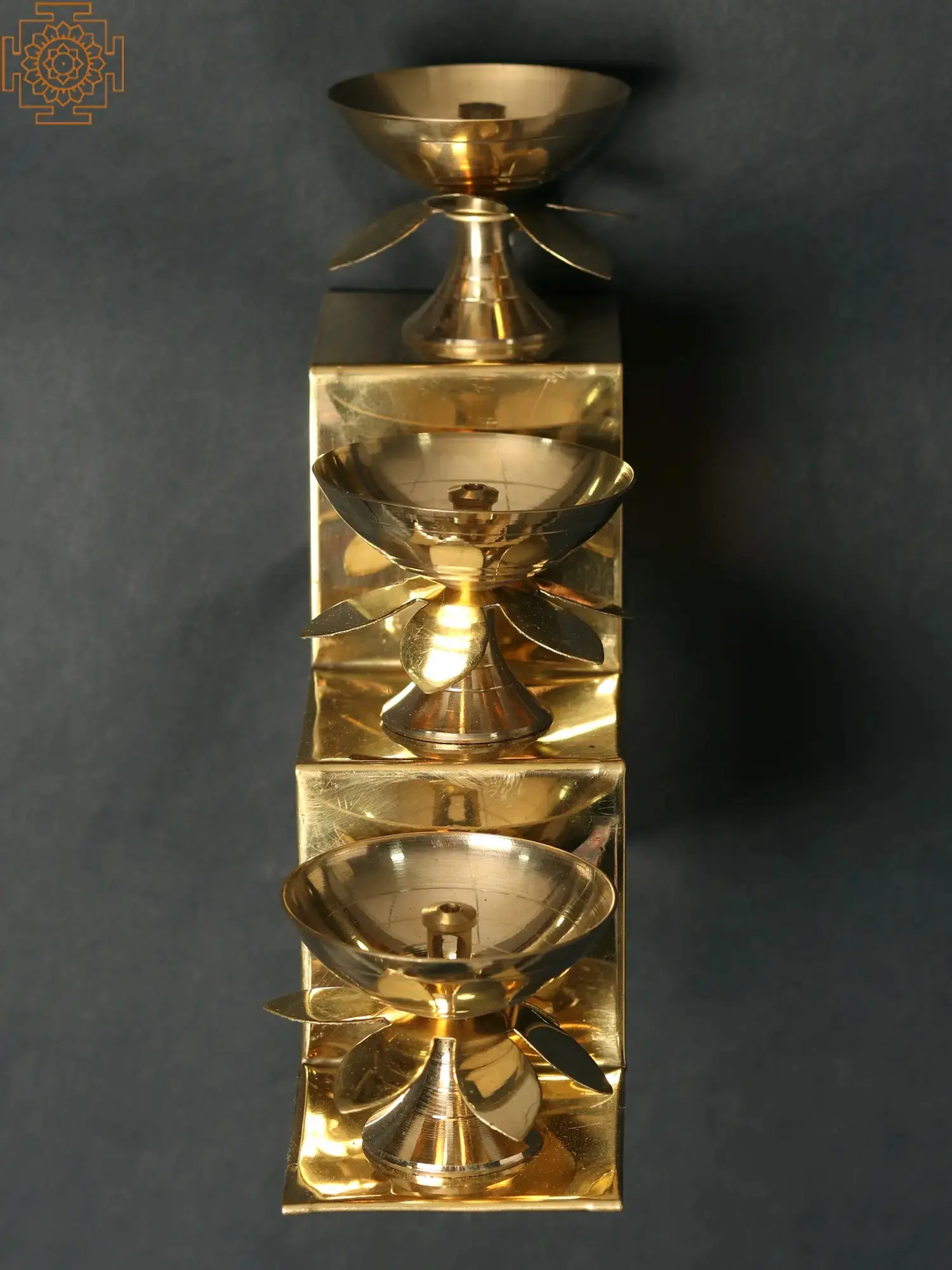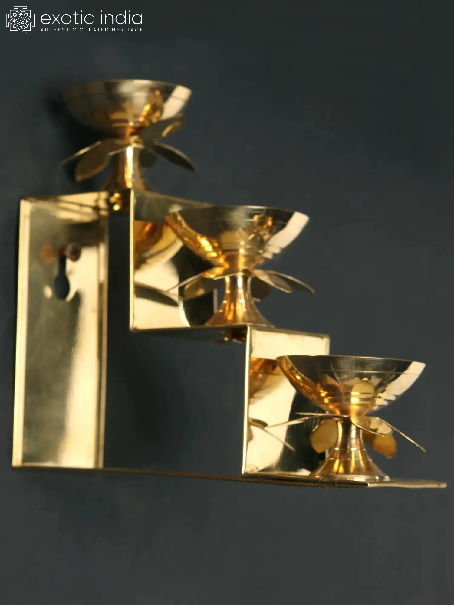 This Brass Set of Three Lamps on Steps is a lovely wall hanging that represents the three phases of faith. Each of the three steps on the wall hanging has three lamps attached to it. Lamps illuminate the three stages of Astha (faith), Arpan (dedication), and Upalabdhi (achievement). The lamps affixed here are Atma Diyas, which have a nozzle-like wick that represents the atma burning to keep the body alive. The brass lotus petals signify wisdom. When lighted, the item becomes associated with soul illumination, crossing the three phases to become one with the Parmatma.
