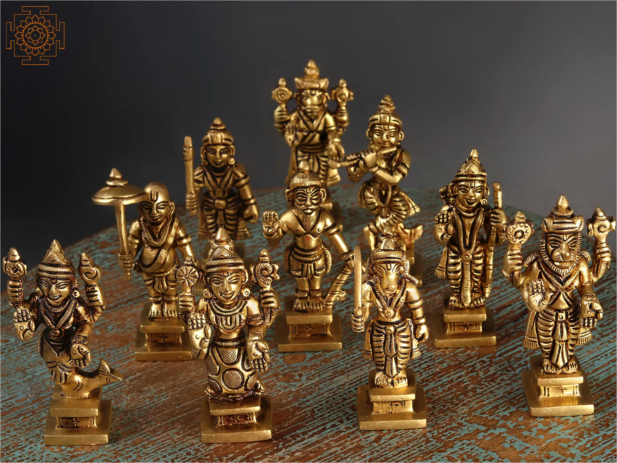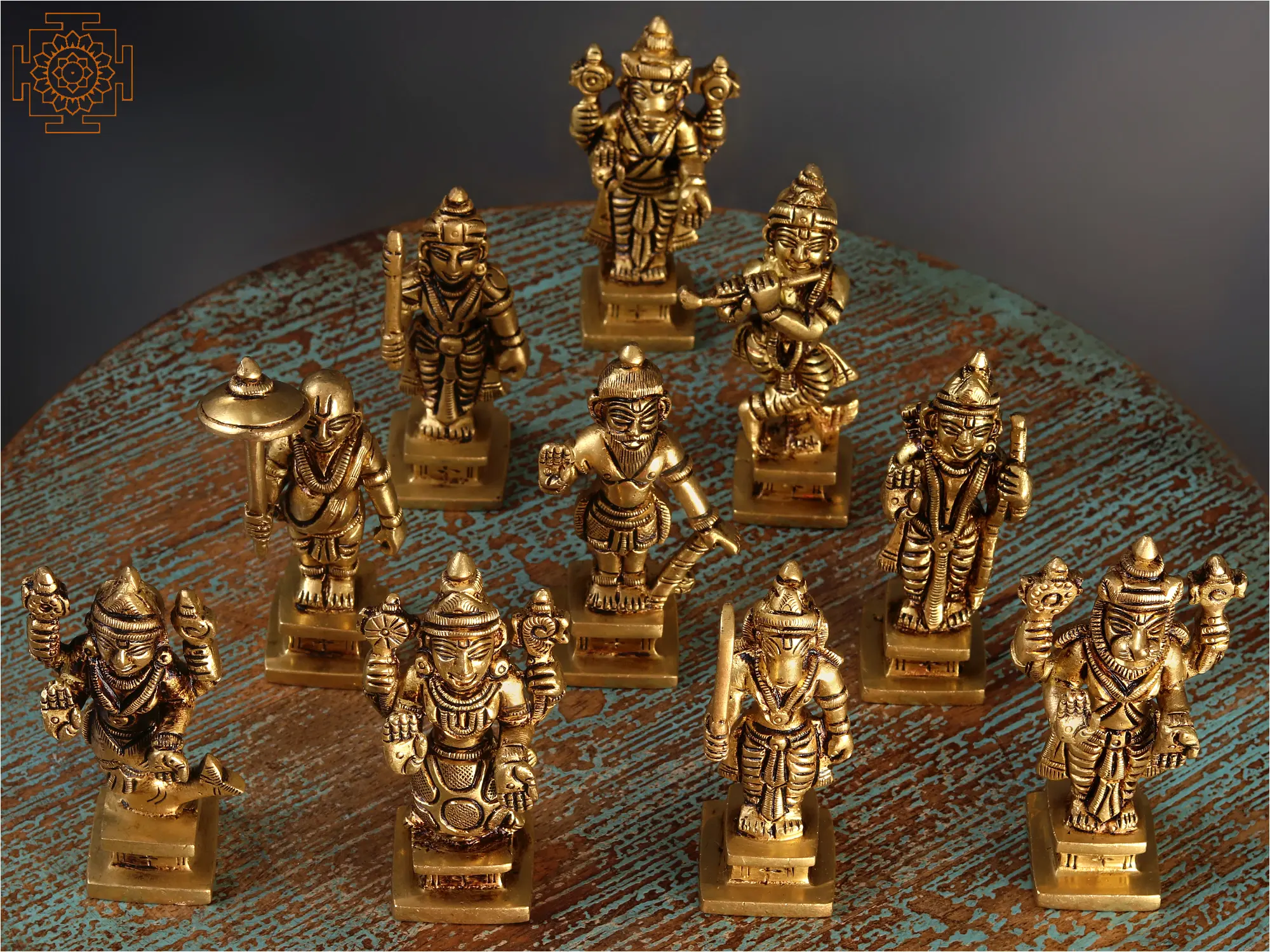 This Brass Dashavatara Set depicts the ten primary incarnations of Lord Vishnu, known as the Dashavatara, in Hindu mythology. Each avatar represents a different aspect of Lord Vishnu's divine manifestations and their roles in preserving dharma (righteousness) and restoring cosmic order. Bringing you Lord Vishnu's cosmic manifestations, showcasing the divine principle of preservation and the timeless teachings of dharma and righteousness.
