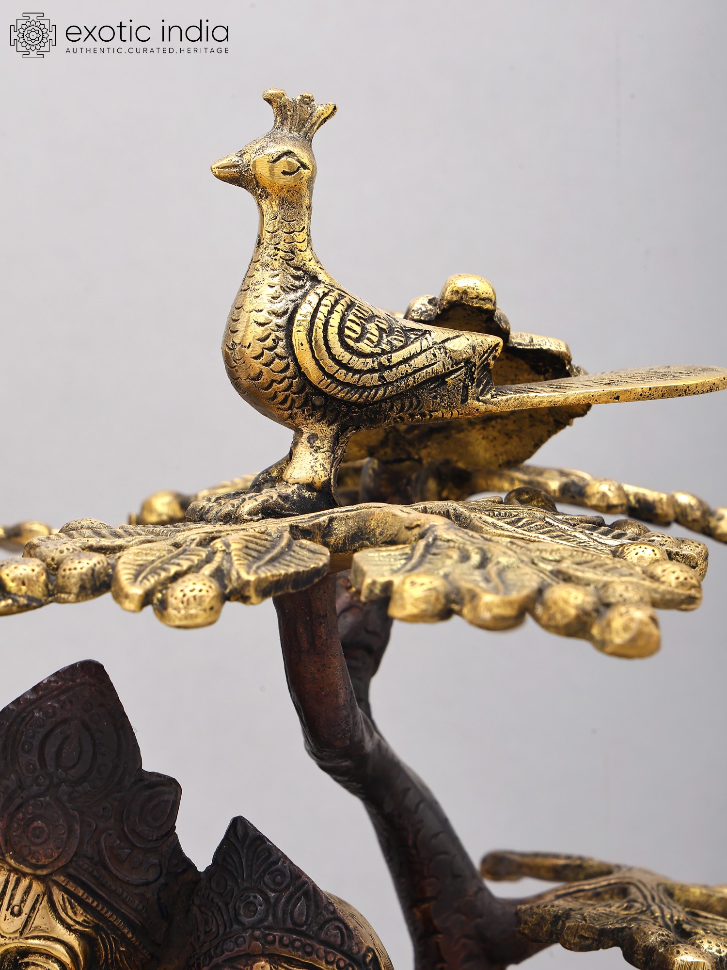 Features a regal Kadamba tree with peacocks perched on its branches, adding natural beauty.