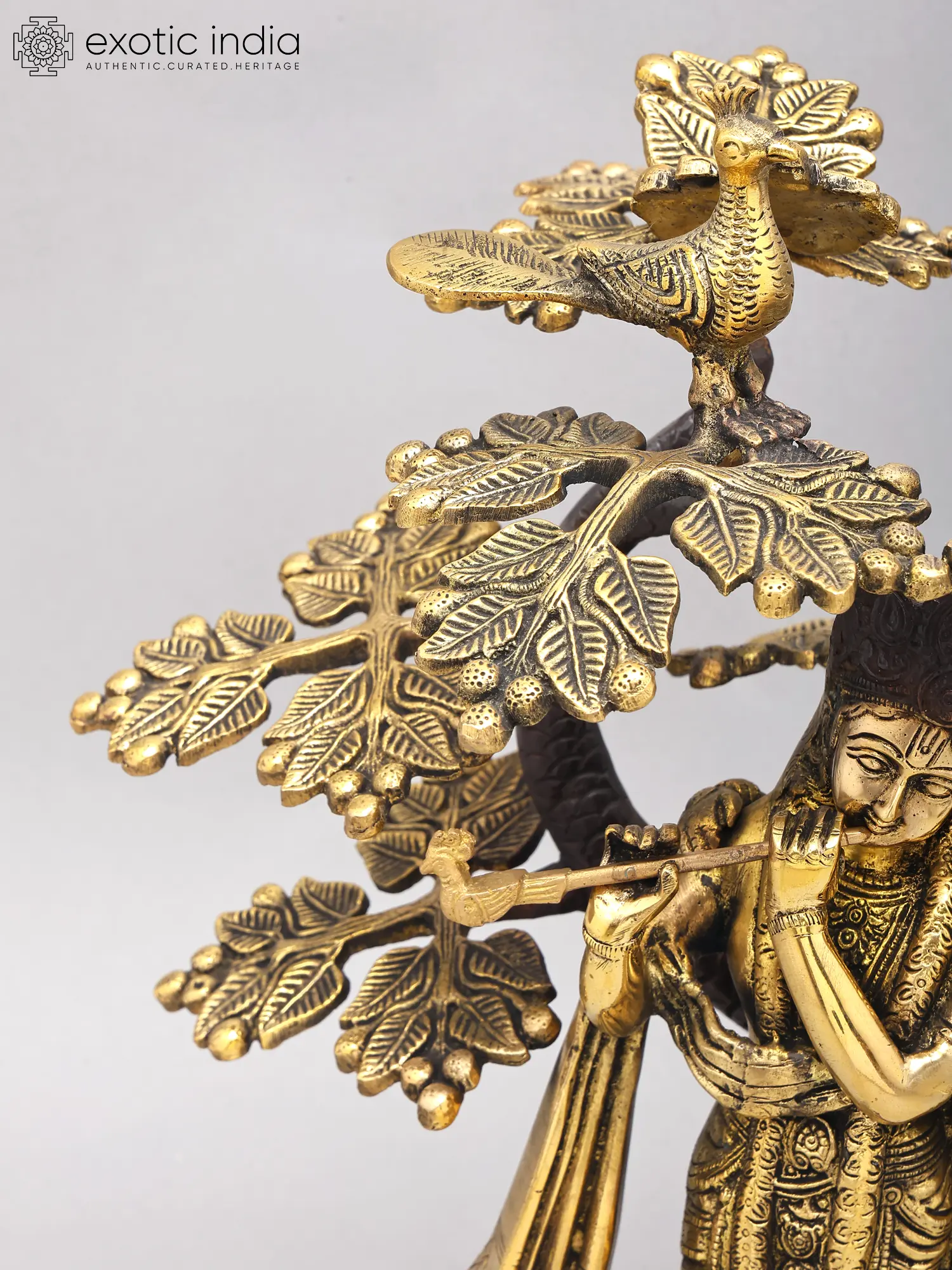Standing eighteen inches tall, this representation is a harmonious ensemble of figures and nature. You’ll appreciate the intricate detailing of the richly adorned attire, the gentle embrace, and the iconic flute held by Krishna, poised to play. The majestic Kadamba tree provides a symbolic canopy, adorned with exquisitely rendered peacocks, their plumage detailed with remarkable precision, adding a vibrant flourish to the scene.