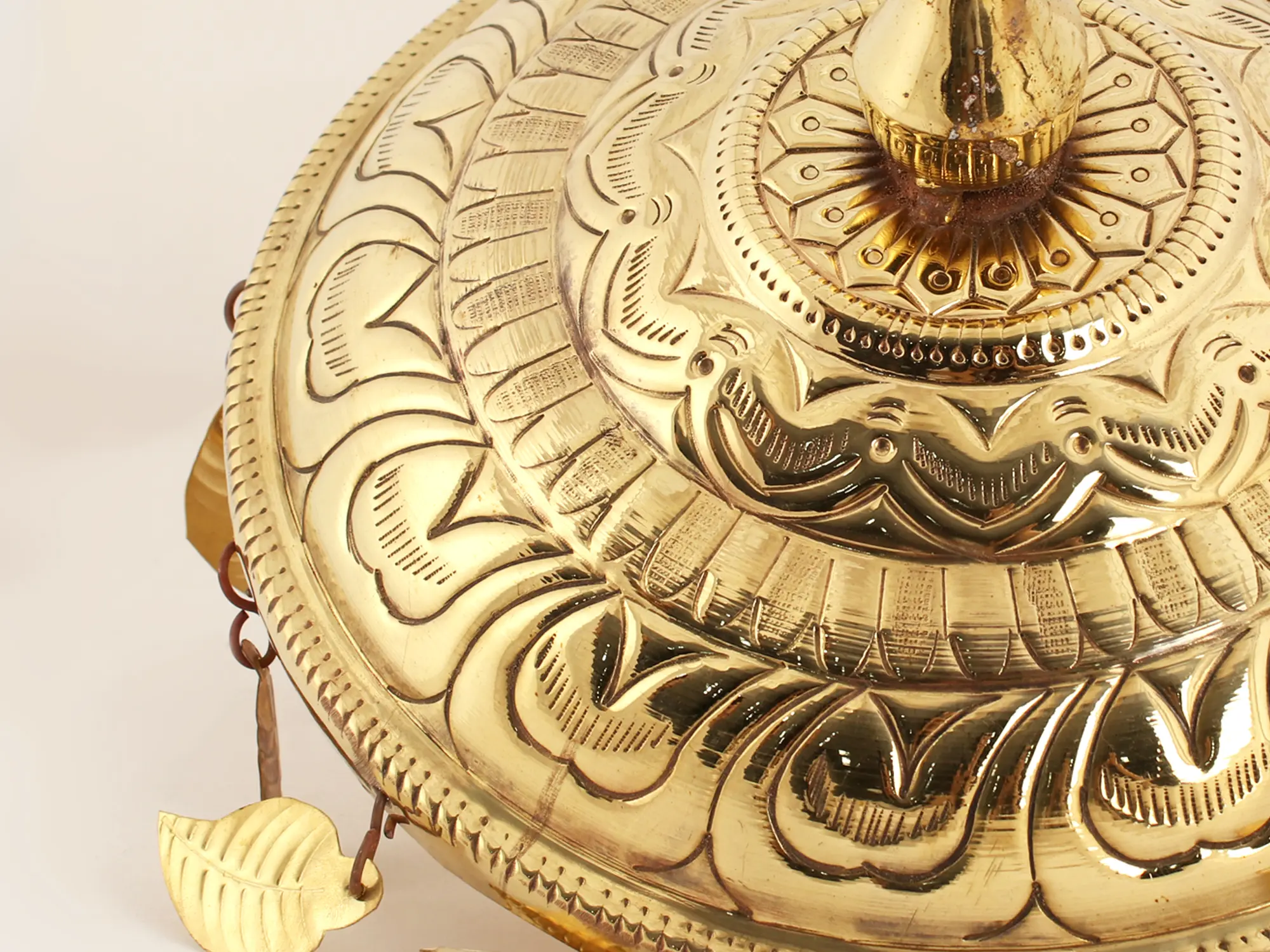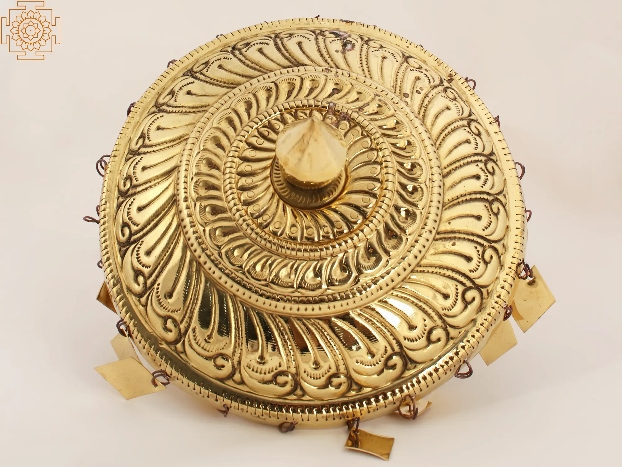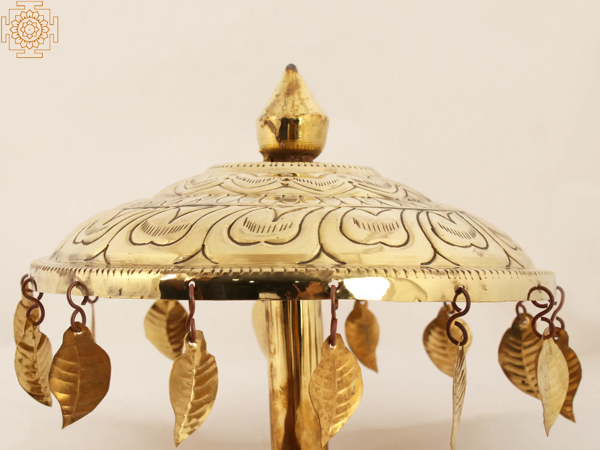 This little brass umbrella for deities is a religious artifact with elaborate flower petal carvings on its body, a Kalash at the top, and a small handle. Its baroque appearance is enhanced by the addition of little square brass confetti to its corners. This umbrella is utilized in Hindu rituals to represent protection, auspiciousness, and devotion, notably during deity processions or temple celebrations. It is an essential aspect of religious traditions, evoking blessings and holiness during religious ceremonies and worship.