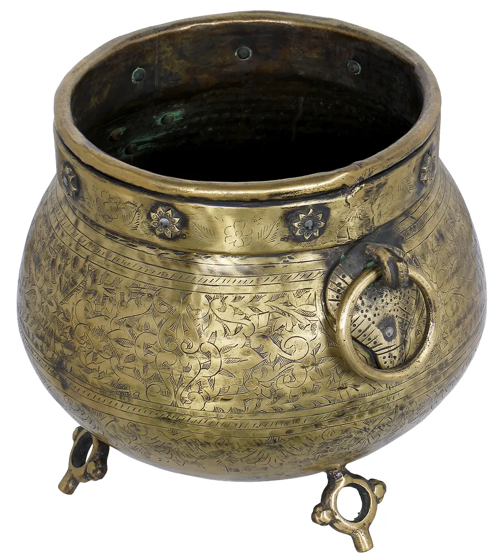 This exquisite brass vessel is more than just an object; it is a testament to the rich tapestry of artistry and culture that has endured for centuries. Crafted from lustrous brass, its surface gleams with an aged patina, hinting at stories whispered through generations. The intricate floral and foliate motifs etched across its expansive body speak of a deep connection to nature, a common theme in artistic expressions across many ancient civilizations. The craftsmanship displayed is truly remarkable. Each delicate line of the engraved patterns, from the subtle floral borders near the rim to the more elaborate swirling vines that embrace the vessel's curvature, showcases the skill of the artisan. The sturdy, decorative handles, formed into elegant loops, suggest practicality and a heritage of fine metalwork, designed for both utility and aesthetic appeal. Supported by three beautifully sculpted legs, this piece possesses a grounded presence, as if it has been carefully placed to bestow its blessings upon its surroundings.