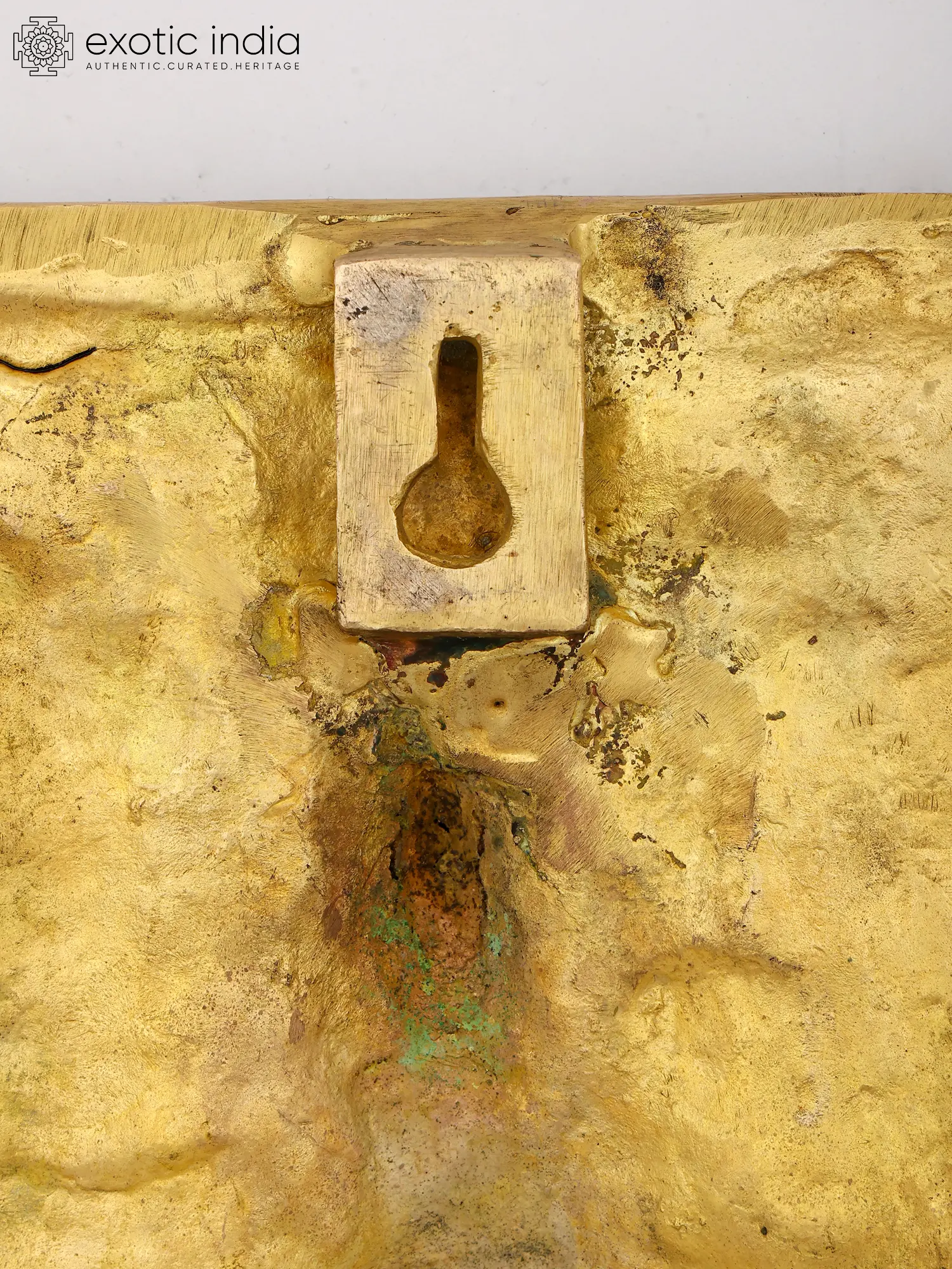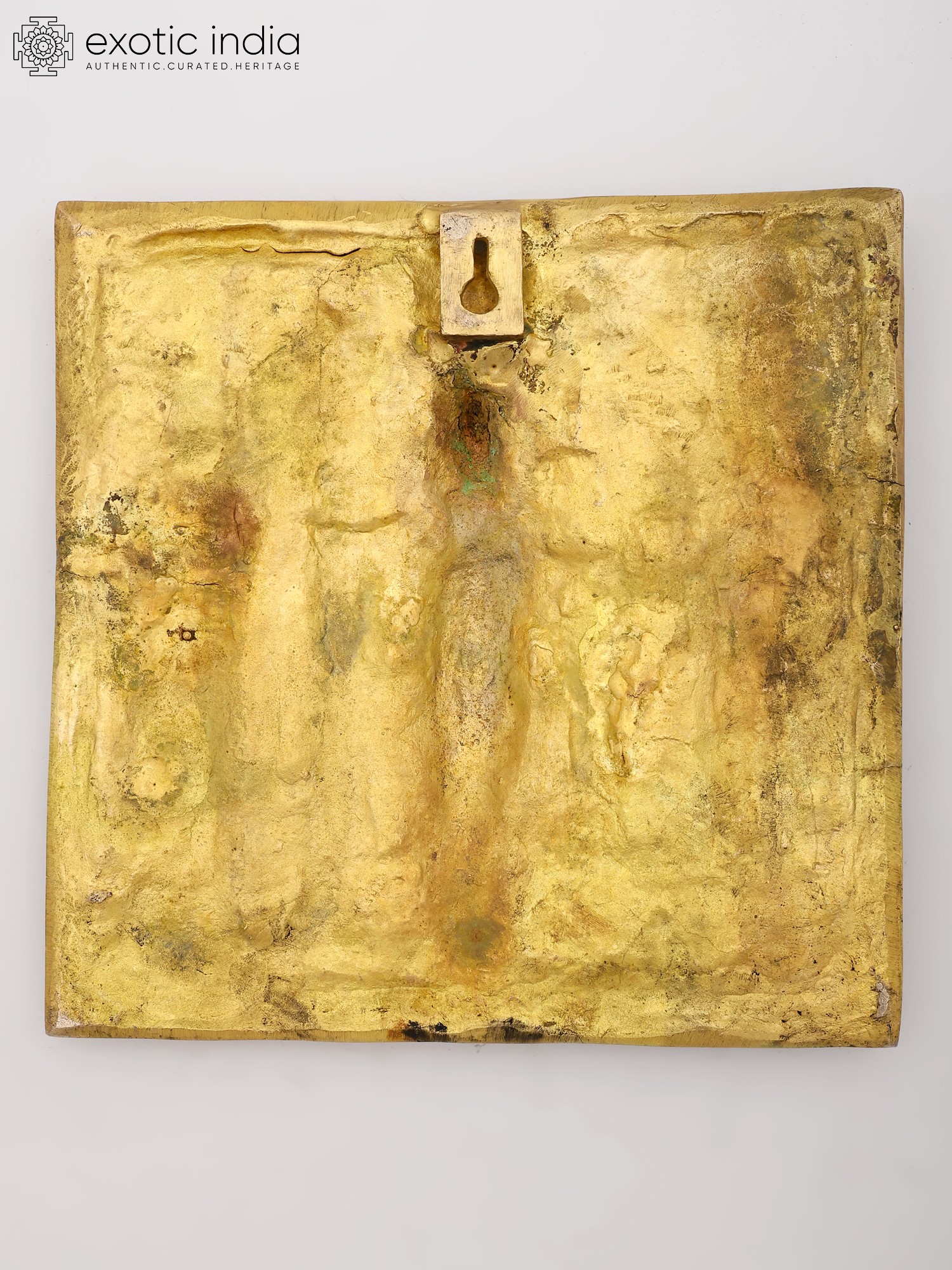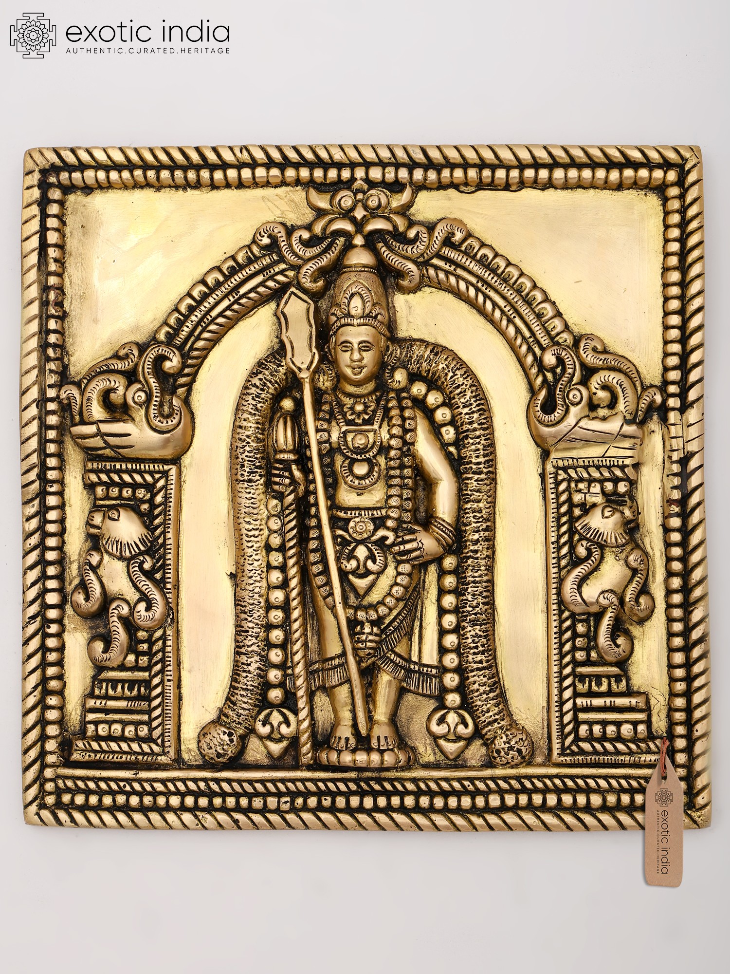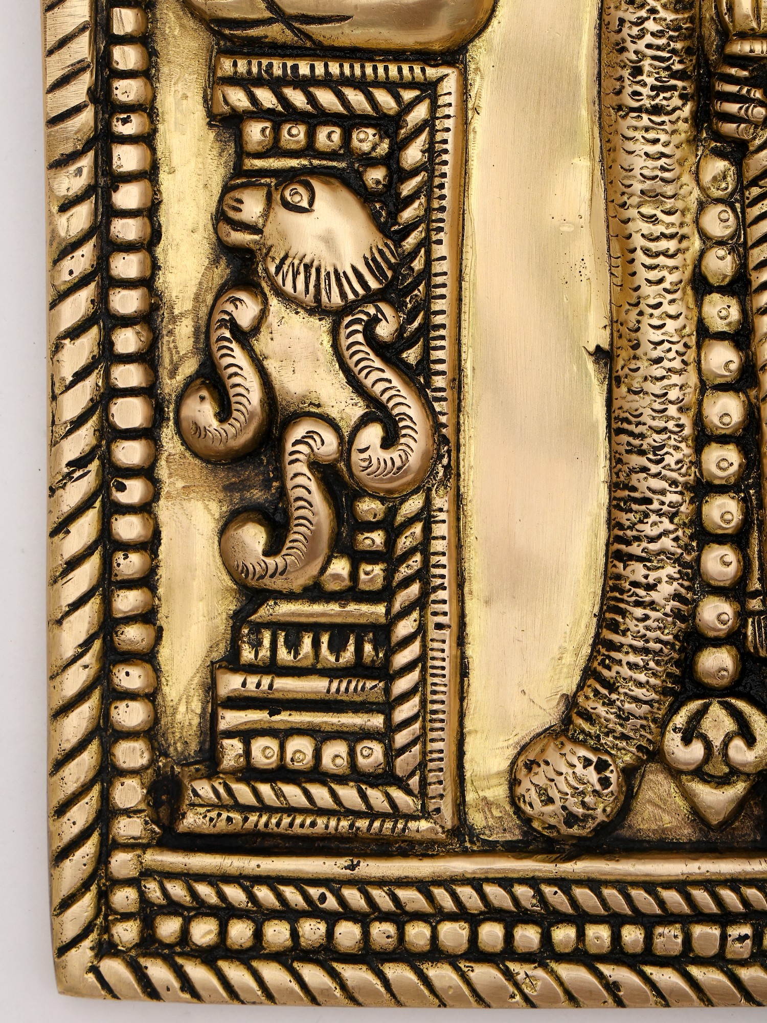Measuring 11 inches in height and width, this wall hanging presents a balanced and striking composition. The central figure is rendered with serene dignity, adorned with symbolic ornaments that tell a story of divine power and grace. The surrounding architectural elements, including ornate pillars and a richly decorated archway, frame the deity beautifully, creating a sense of sacred space. The detailed relief work, including the textured border and the finely rendered mythological creatures adorning the pillars, adds a captivating dimension that draws you into its narrative.