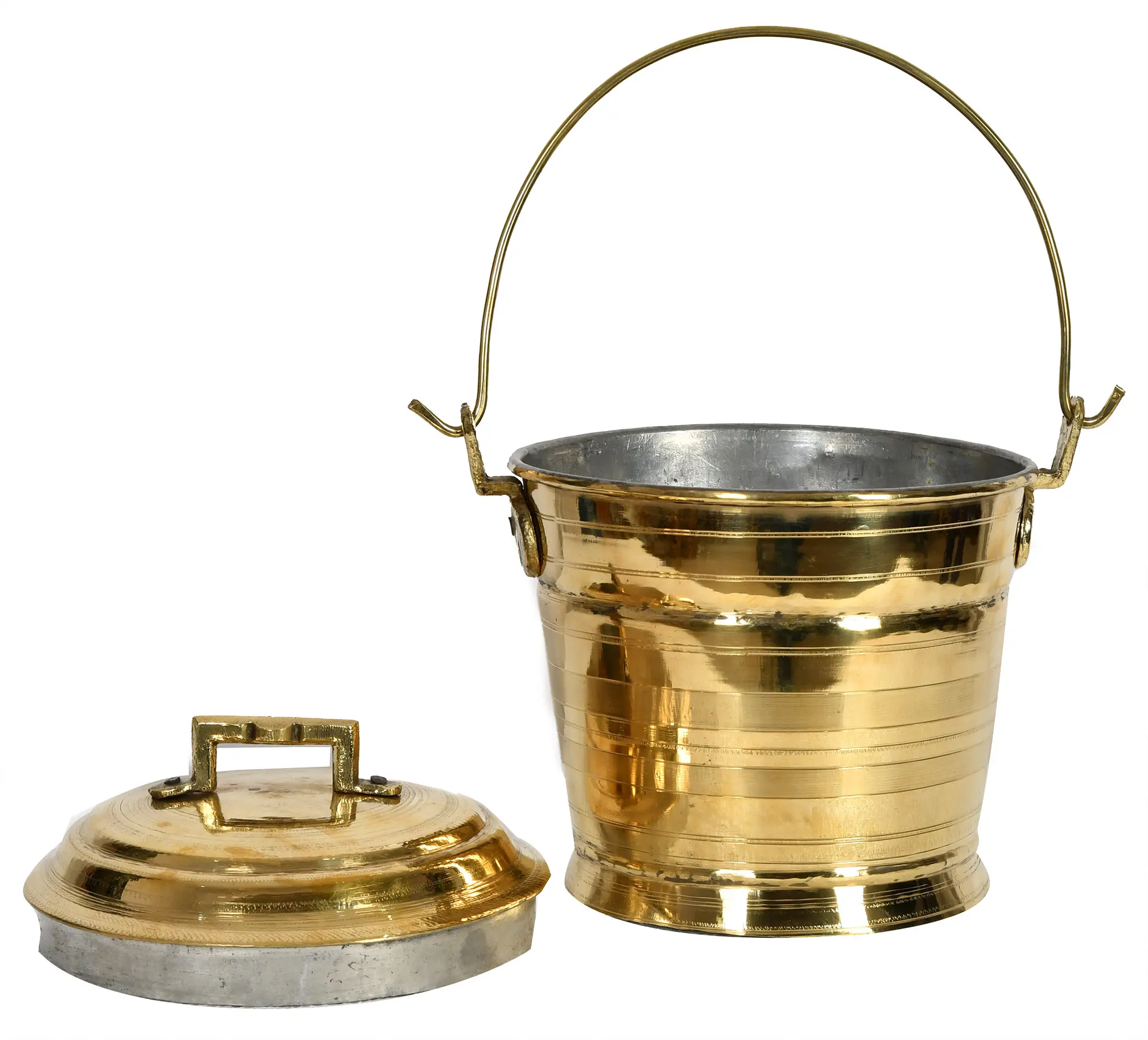 This exquisite brass bucket, with its accompanying lid and sturdy handle, is more than just a vessel; it is a timeless symbol of devotion and community spirit. Crafted from lustrous brass, it echoes the sacred tradition of distributing *prashadam*, the blessed food offered to deities and then shared amongst devotees. This practice, deeply rooted in Hindu culture, signifies the transference of divine grace and the fostering of unity. The craftsmanship of this bucket speaks volumes. The smooth, polished surface gleams with a warm, inviting glow, a testament to the skill of the artisans who brought it to life. The elegantly curved handle, designed for comfortable carrying, suggests the act of sharing, of moving amongst fellow devotees or family members to offer a taste of spiritual nourishment. The intricately designed lid not only preserves the sanctity and freshness of the *prashadam* but also adds an element of anticipation and reverence to the offering. The subtle, concentric patterns etched onto the lid and the ribbed texture of the bucket’s body are reminiscent of ancient Indian motifs, adding to its heirloom quality.