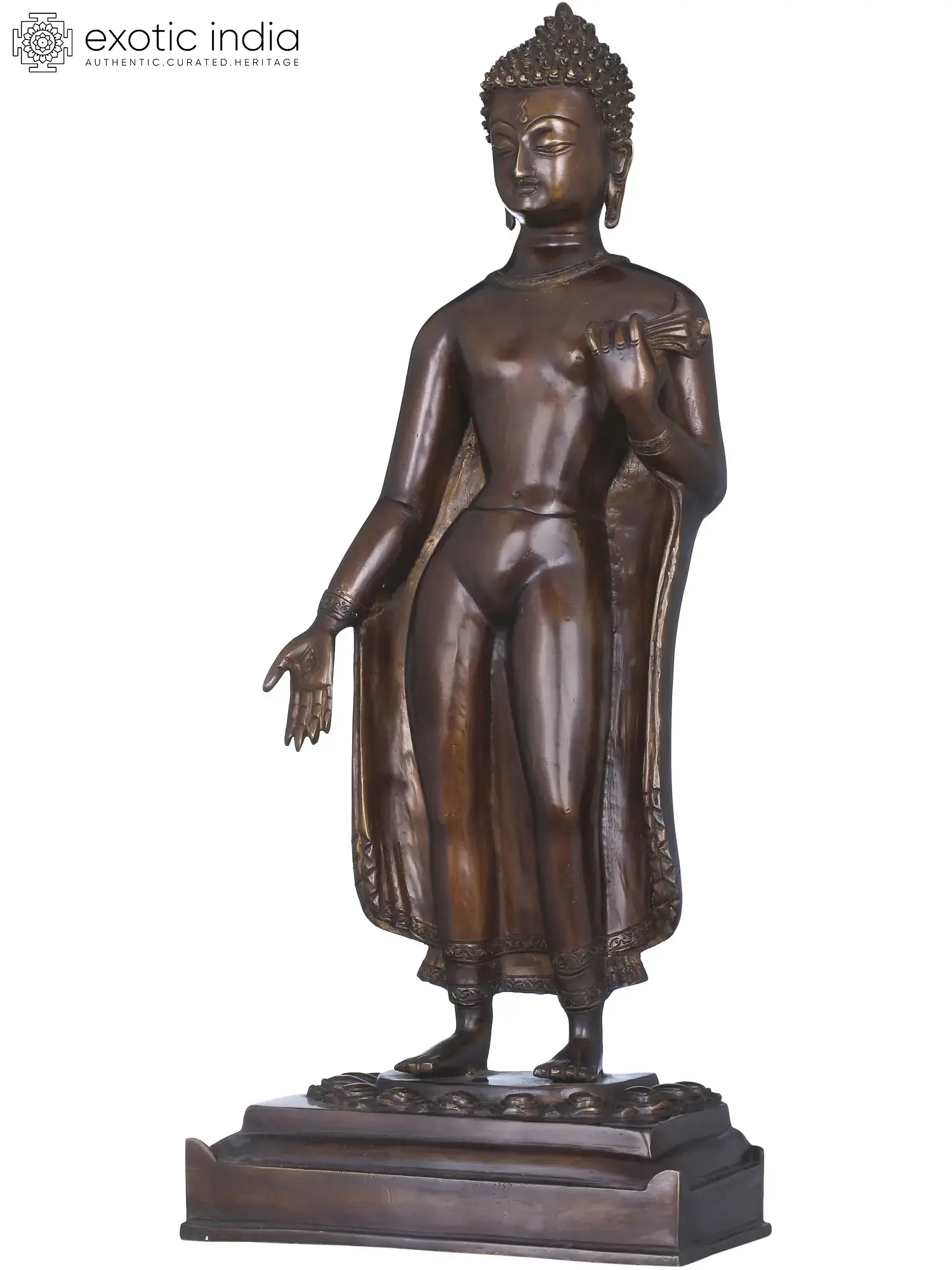 This slightly swaying image of the Buddha, with a mildly smiling face and elongated earlobes, stands with the right hand lowered in the Varada (wish-granting) mudra and the left holding the folds of his monastic robe. Tiny snail-like curls make up his hair, topped with the cranial protuberance known as ‘ushinsha’, symbolising highest wisdom.