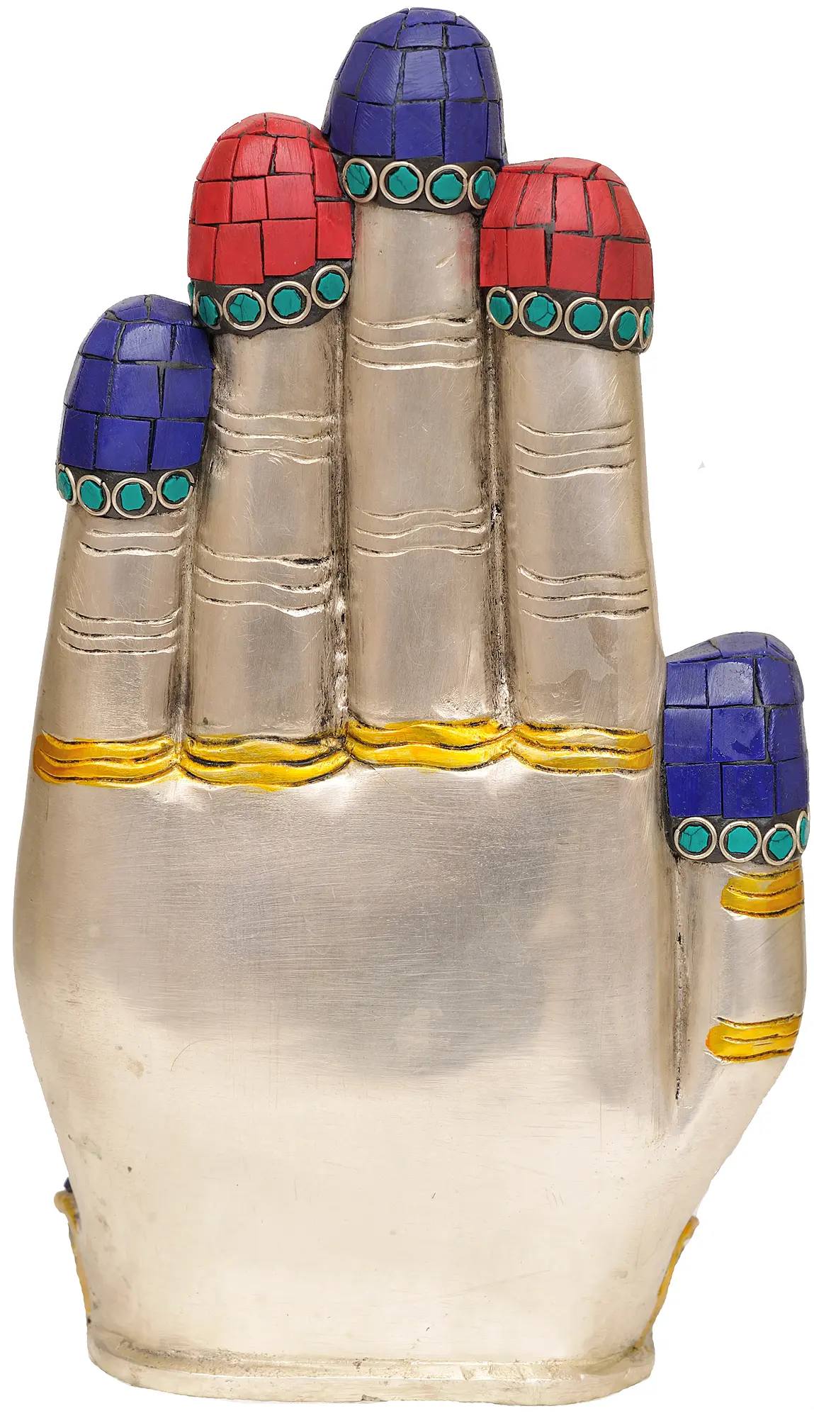 The backdrop of the statue is formed by the monumental representation of a hand, a powerful symbol in Buddhist iconography. The hand of Buddha signifies his omnipresence and his ability to touch and transform all aspects of life. In some traditions, the five fingers are said to represent the five wisdoms or the five elements, all brought under the benevolent gaze of the enlightened mind. The vibrant inlay work that adorns the fingers, rendered in alternating shades of deep blue and passionate red, further enhances the mystical aura of the piece. This sacred imagery, deeply rooted in ancient traditions, is brought to life with meticulous detail, making this statue not just an object of devotion but also a breathtaking work of art. It serves as a constant reminder of the Buddha's presence and his compassionate embrace of the world, bringing a sense of sacredness and tranquility to any space it graces.