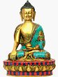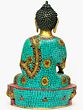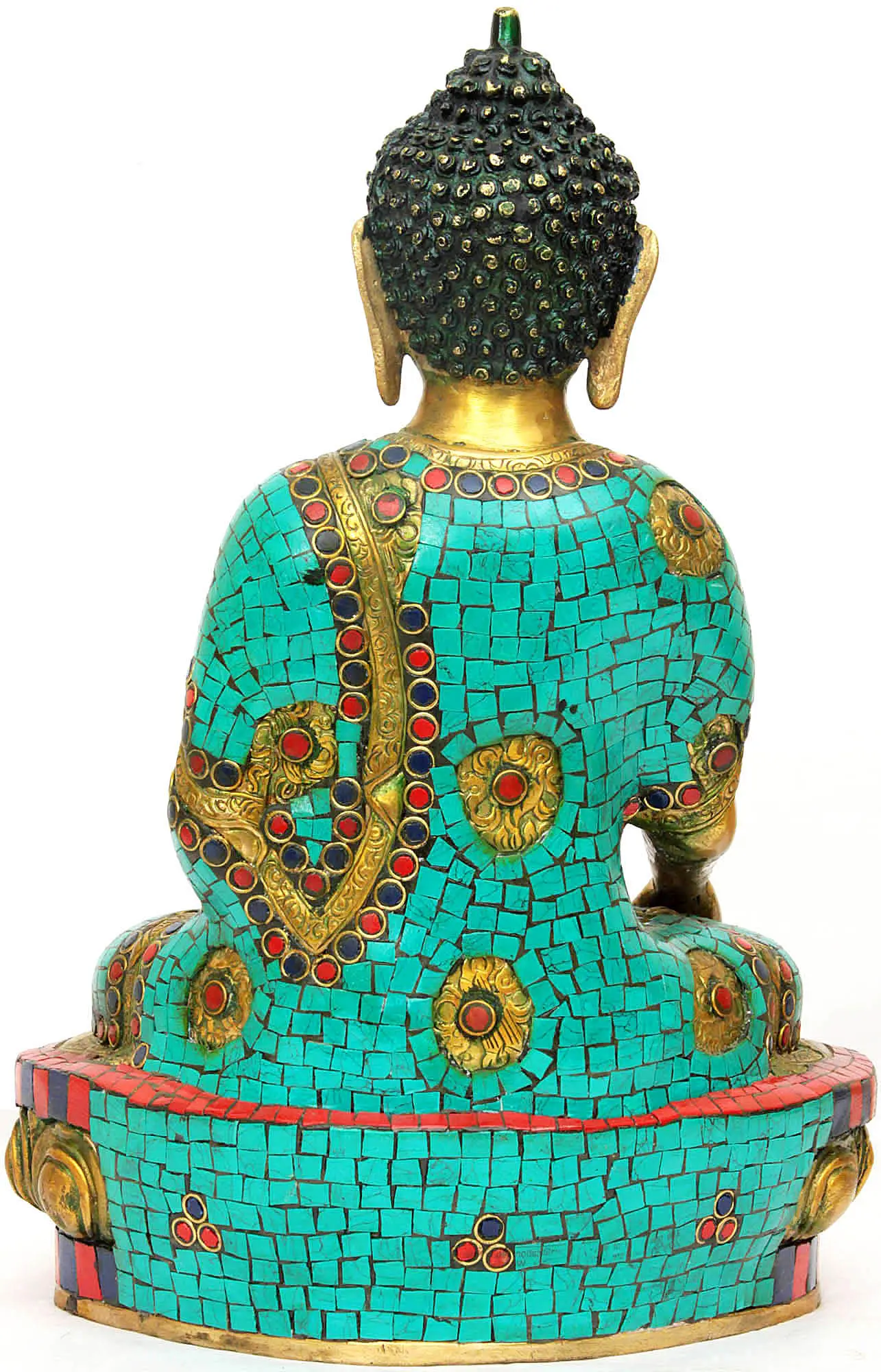 The casting of the sculpture in brass allows for intricate detailing, evident in the folds of the robes and the serene expression on the face. The use of brass imparts a sense of permanence and reverence, befitting the subject. Further embellishment in mosaic designs adds depth and color to the figure. The design of the robes and lotus base exemplify the skill of the artisan. This piece serves not only as a beautiful work of art but also as a powerful reminder of the Buddha's journey to enlightenment, the victory over Mara, and the potential for all beings to achieve liberation from suffering. It is a tangible representation of faith and a source of inspiration for spiritual seekers. This figure would be perfect for any meditation room, yoga studio, or any place where you seek to increase the sense of inner peace and enlightenment.