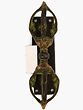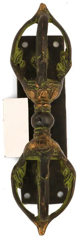 Crafted from robust brass, this door handle boasts a vintage aesthetic that speaks of timeless elegance. The patina and subtle green accents evoke a sense of history, as if this piece has weathered centuries, gathering stories and wisdom. The meticulous detailing on the Dorje motif is a delight to behold, showcasing skilled craftsmanship that honors traditional artistic techniques. The substantial feel of the brass ensures its durability, making it a reliable and enduring addition to any door. Its design is both striking and inviting, promising to be a conversation starter and a focal point of your home's interior design.