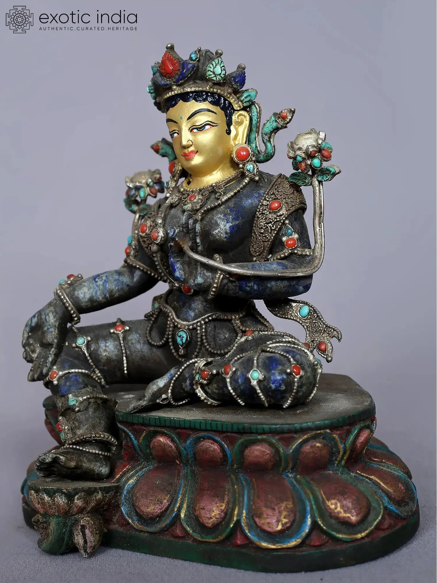 The sculptor has achieved a mystical antiquated appearance in this Nepalese statue of Green Tara, reminding us of her epithet- Shyama Tara or the dark Tara. The aesthetic artwork has been modeled from a carefully selected mother rock, which enshrines a beautiful blue stone inside its dark outer cover. The goddess has been adorned masterfully with exquisite turquoise, lapis lazuli, and coral along with silver. A golden slip on Tara’s visage enlightens the artwork, instilling in it a stunning beauty.