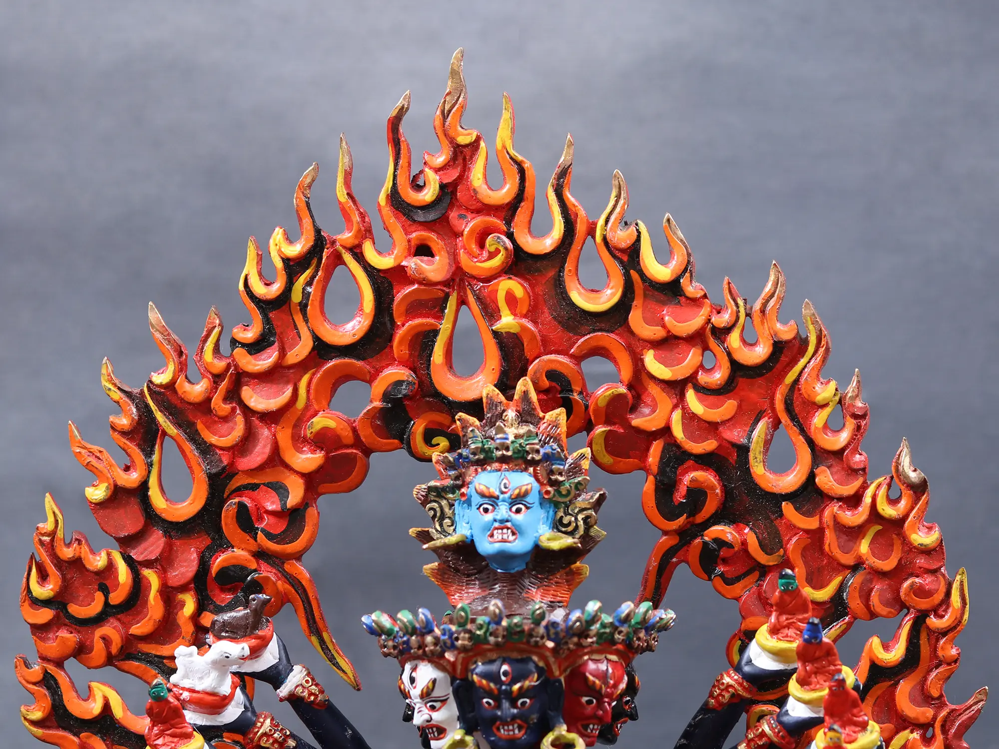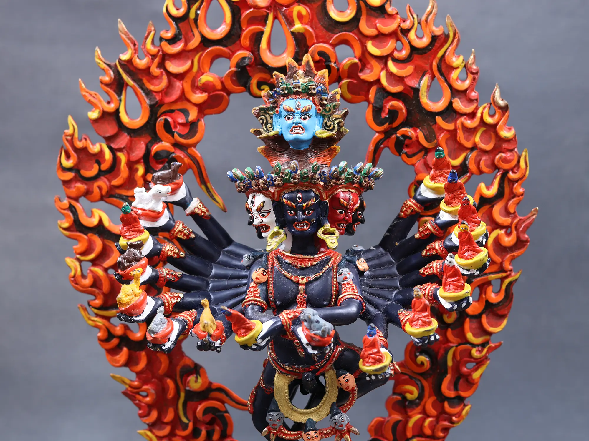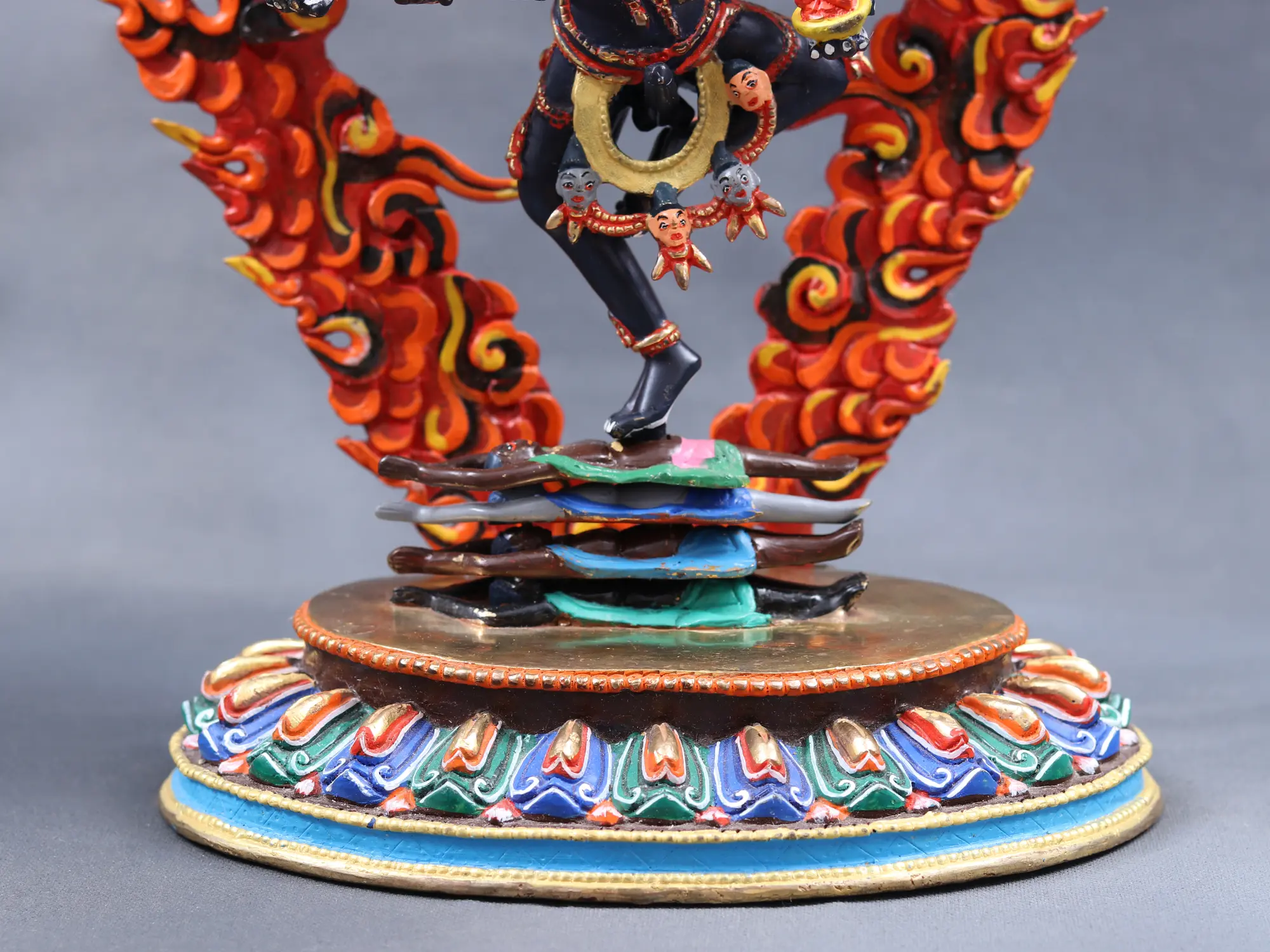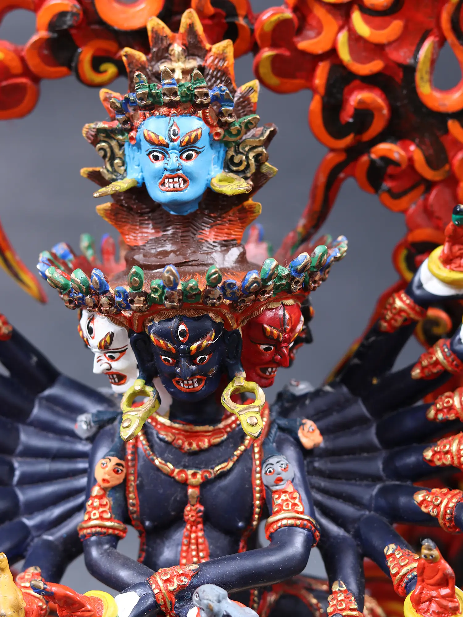 Hevajra or Heruka in Vajrayana Buddhism is an aspect of Buddha Akshobhya, a powerful guardian deity and a ferocious protector of all beings. In this stunning copper statue from Nepal, Hevajra is presented in his Tantric seven-faced and sixteen-armed form, with a blue body, dancing on four corpses. His striking dancing pose matches the riveting pose of the Buddhist deity Vajravarahi.