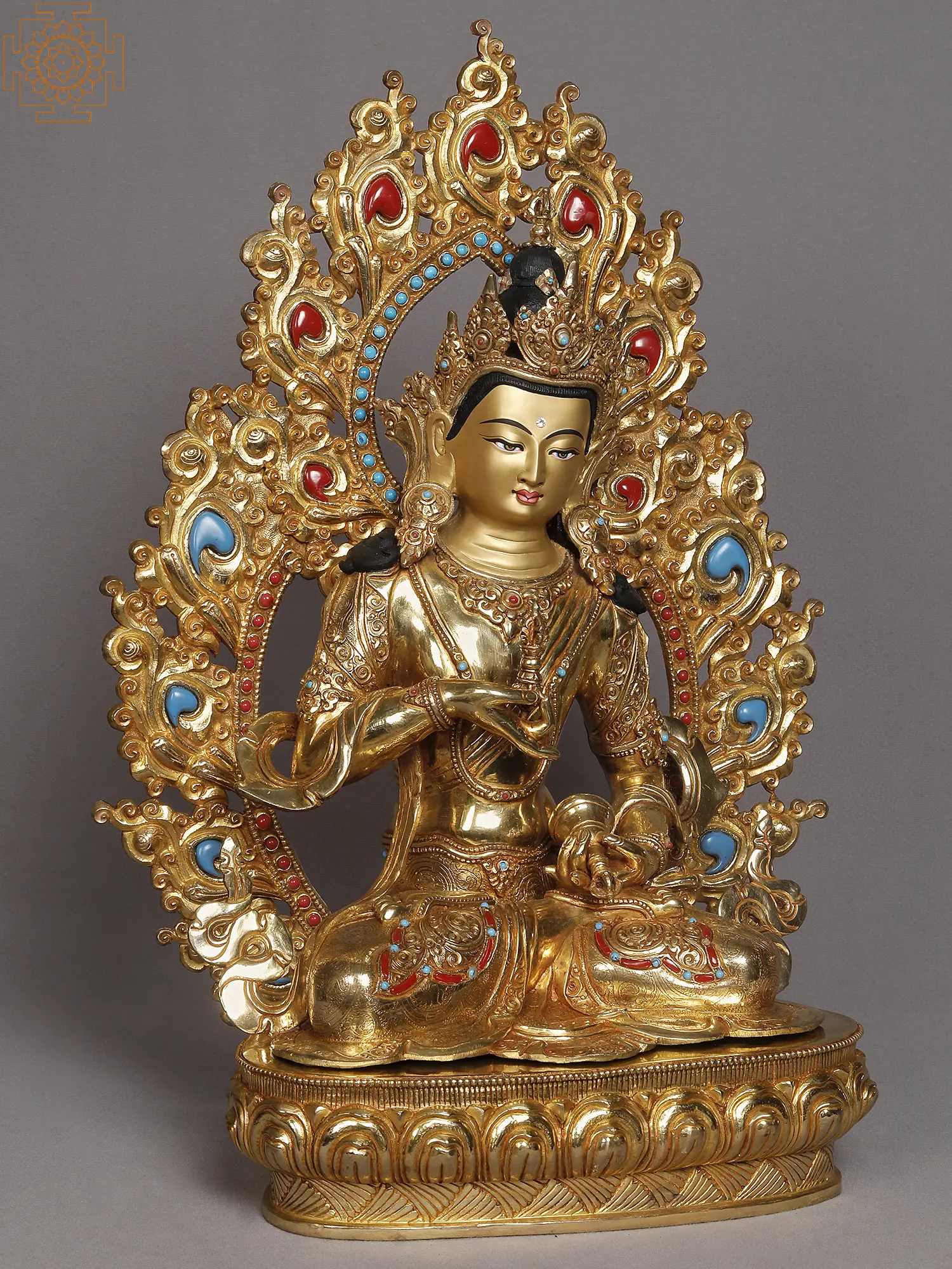 What divine beauty the enlightened state must carry? As an answer to this complex question, the Buddhist embodiment of supreme wisdom and enlightenment, Bodhisattva Vajrasattva is visualized in a princely form in this Nepalese statue made from copper and gold. A golden aureole in the shape of blossoming vines with coral and turquoise outlines the youthful Bodhisattva, seated on a lotus throne. The physicality of Vajrasattva is such that he appears to be gently leaning forward, carrying a paternal attitude and the willingness to bestow the ultimate wealth of wisdom on his followers.