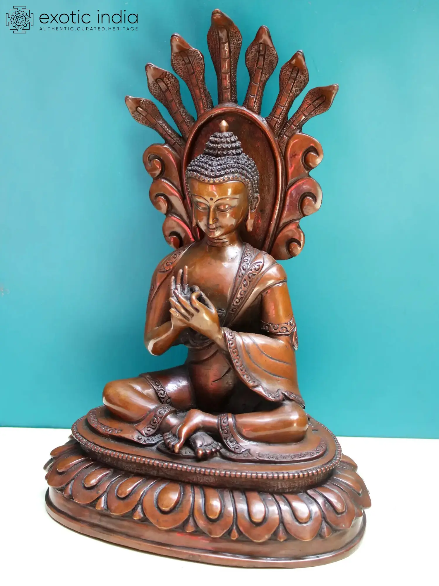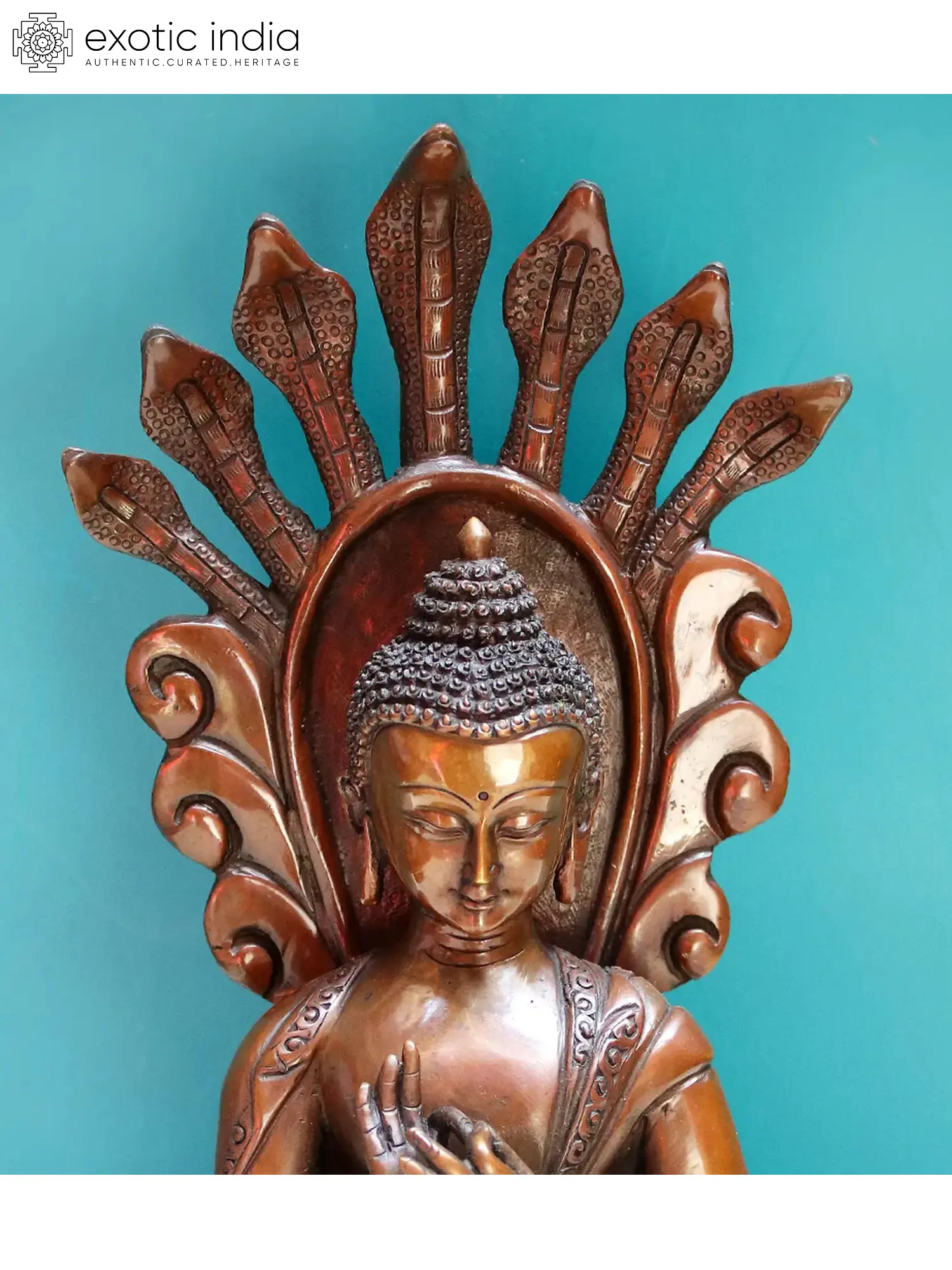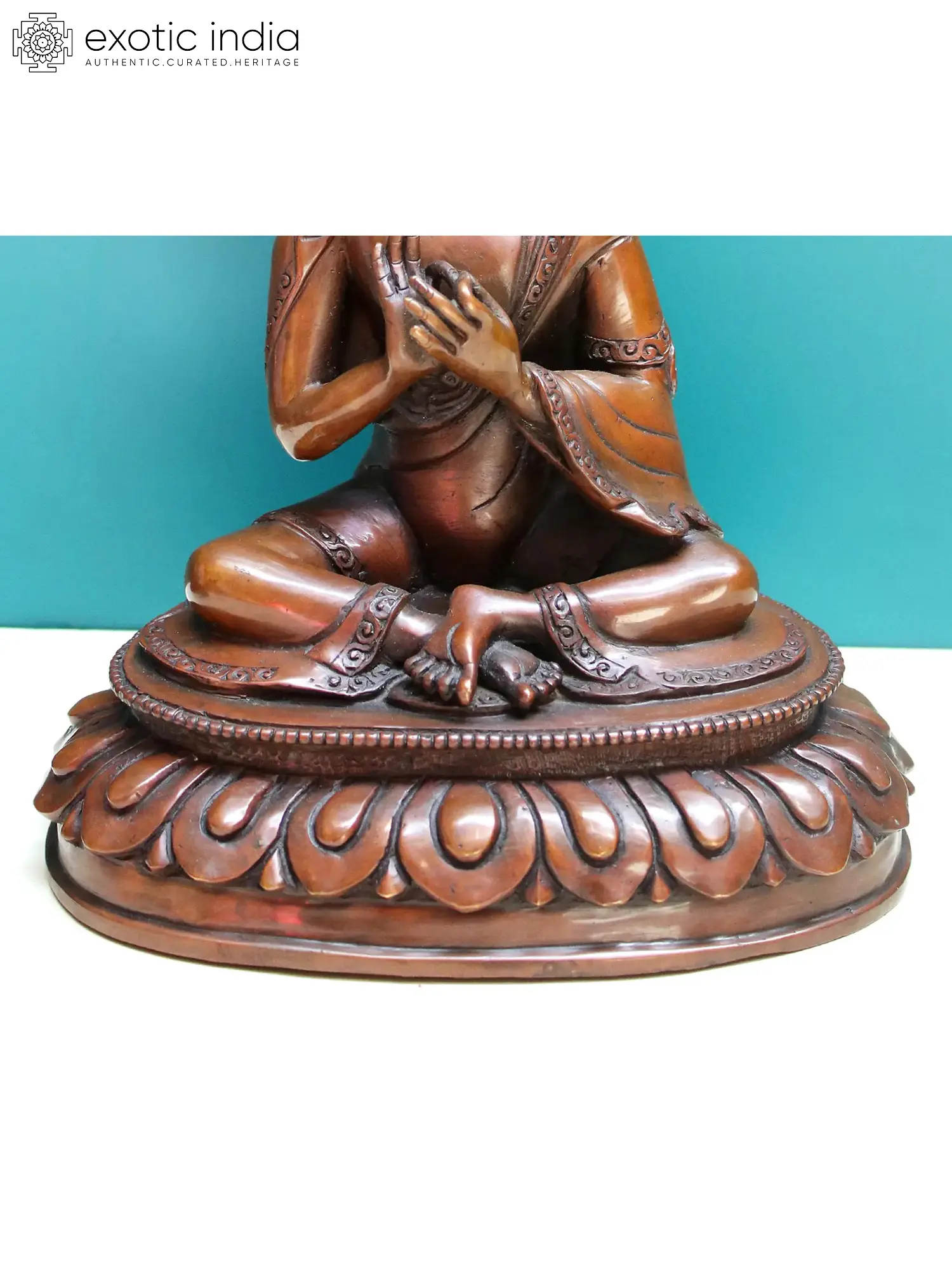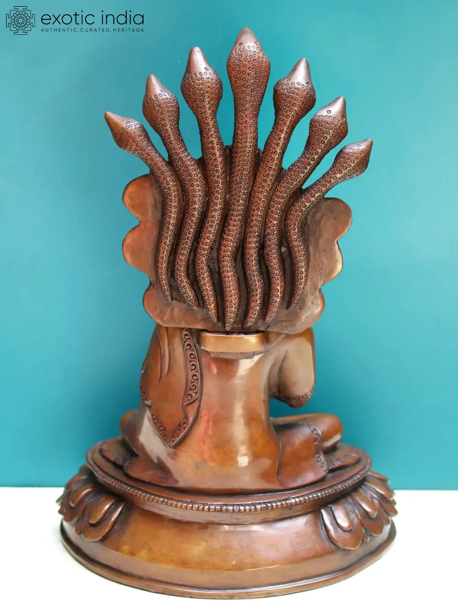 Nagarjuna in ancient traditions of Buddhism is the master proponent of the Madhyamika sect, based on Buddha’s philosophy of the Middle Path or Madhyama Maarga. This statue from Nepal, made with copper, presents the master Nagarjuna enthroned on a beautiful inverted lotus throne, shaded by seven Naga or serpents. According to the legends related to his life, Nagarjuna was able to enter the Nagaloka or the realm of serpents, and found the knowledge the Buddha had entrusted with them. Acquiring the pure wisdom from the serpents, he came to be known as Naga (serpent), and Arjuna (noble).