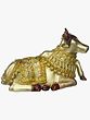 Invite the auspicious presence of Nandi, the sacred bull and devoted vahana (vehicle) of Lord Shiva, into your home with this exquisite brass statue. Nandi, revered for his unwavering loyalty, strength, and devotion, is depicted here in a posture of serene contemplation, embodying peace and stability. Crafted from high-quality brass, this sculpture showcases intricate detailing, from the ornate ornamentation adorning his divine form to the tranquil expression on his face. The rich golden sheen of the brass is enhanced by subtle touches of deep red on the horns and hooves, adding a regal depth to the piece.