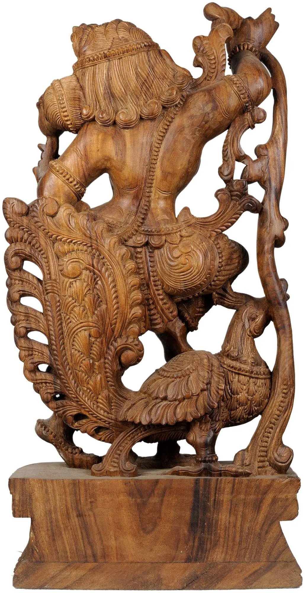 Every curve and detail of this carving has been meticulously rendered, reflecting the skill and dedication of South Indian artisans. The wood, likely sourced locally, has been expertly shaped to capture the Apsara's dynamic pose and serene expression. Notice the intricate details in her jewelry, her flowing garments, and the ornate designs that adorn her form. The swan, her vahana (vehicle), is also finely sculpted, its feathers meticulously detailed, reflecting the creature's association with purity, beauty, and grace. The base of the sculpture is also ornate and carefully carved, reminiscent of South Indian temple architecture. The choice of wood adds warmth and richness to the piece, enhancing its timeless appeal.