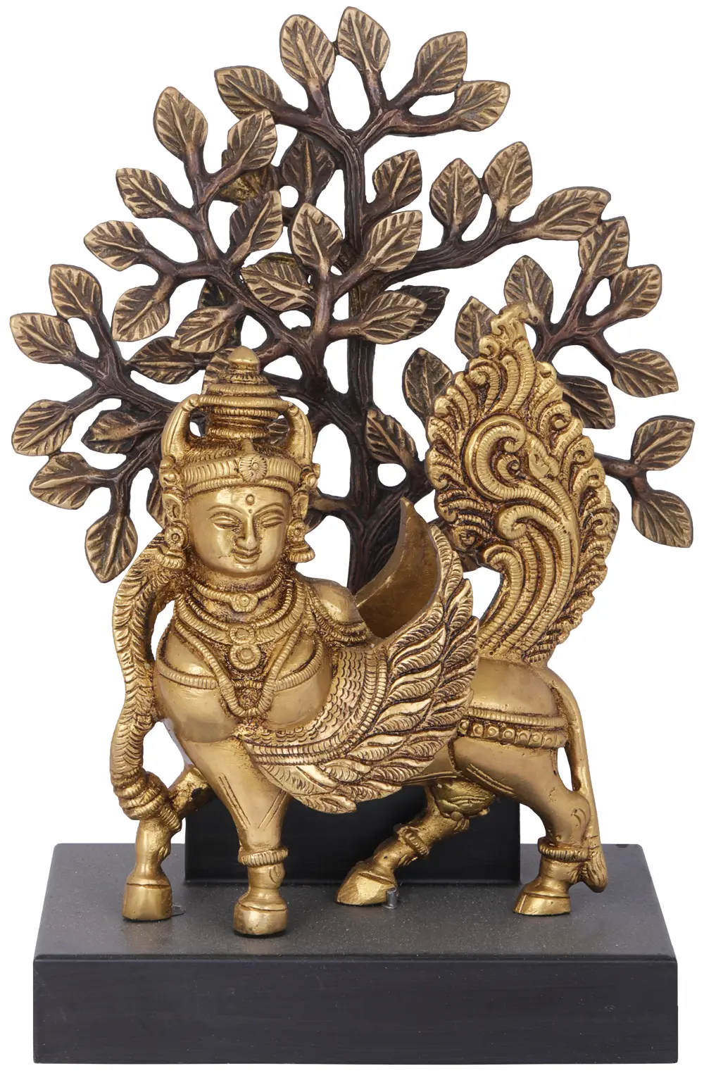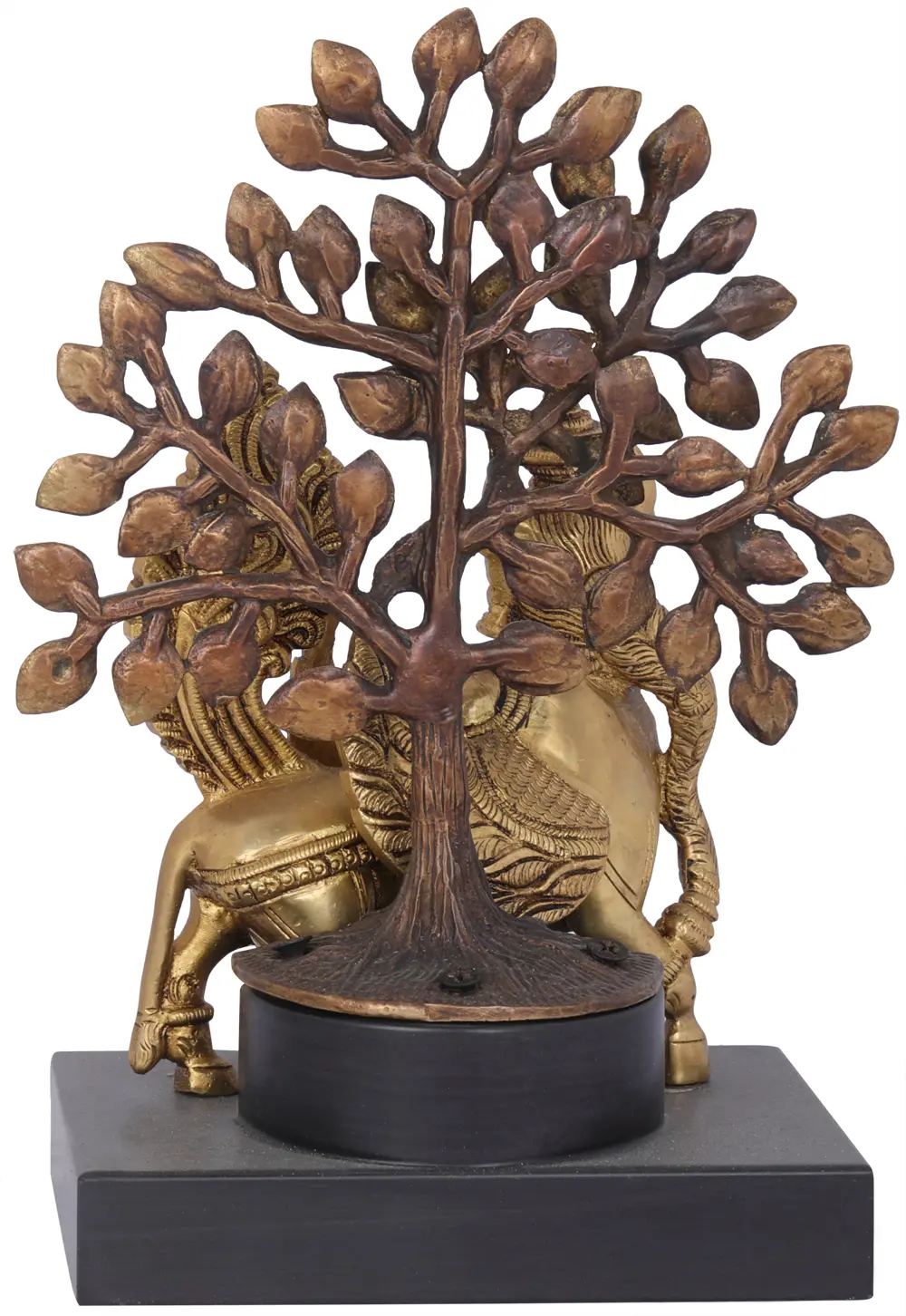 This exquisite brass and wood statue captures the essence of Kamadhenu, the mythical wish-granting cow, a divine entity revered in Hindu mythology for her ability to fulfill all desires. Kamadhenu is not merely a cow; she is the mother of all bovines, a celestial being born from the churning of the cosmic ocean, Samudra Manthan. Her presence signifies prosperity, nourishment, and the benevolent abundance of the universe. The artistry of this sculpture is a testament to skilled craftsmanship. The intricate details of Kamadhenu’s form are brought to life in gleaming brass, from the gentle curve of her bovine body to the serene expression on her human-like face. The inclusion of majestic wings suggests her divine, otherworldly nature, capable of soaring beyond mortal realms. Adorned with elaborate jewelry and a regal headdress, she embodies grace and power. The stylized depiction of a flourishing tree behind her further amplifies her symbolism as a source of life, sustenance, and eternal growth, mirroring the life-giving qualities attributed to Kamadhenu herself. The juxtaposition of the polished brass with the dark, rich wood of the base creates a visually striking contrast, elevating the statue as a significant decorative piece and a focal point of spiritual contemplation.
