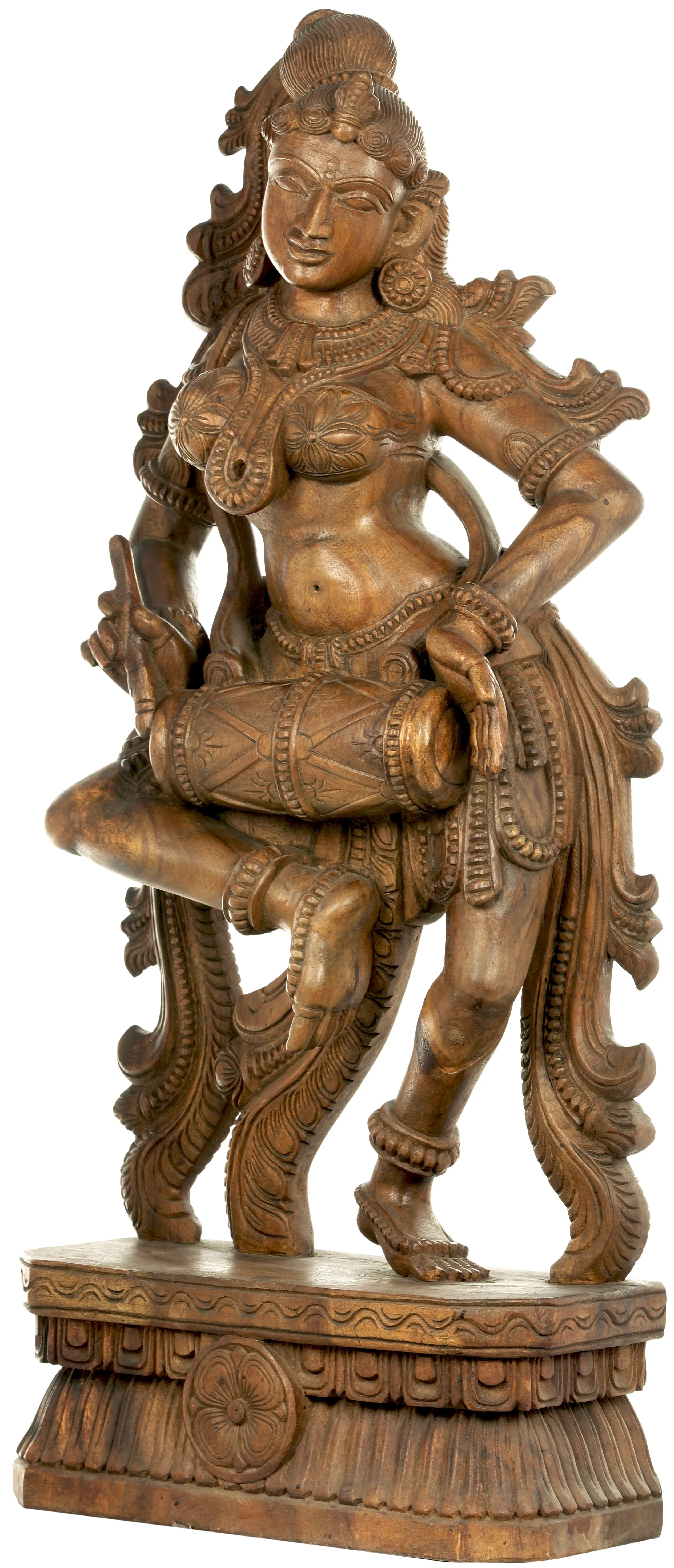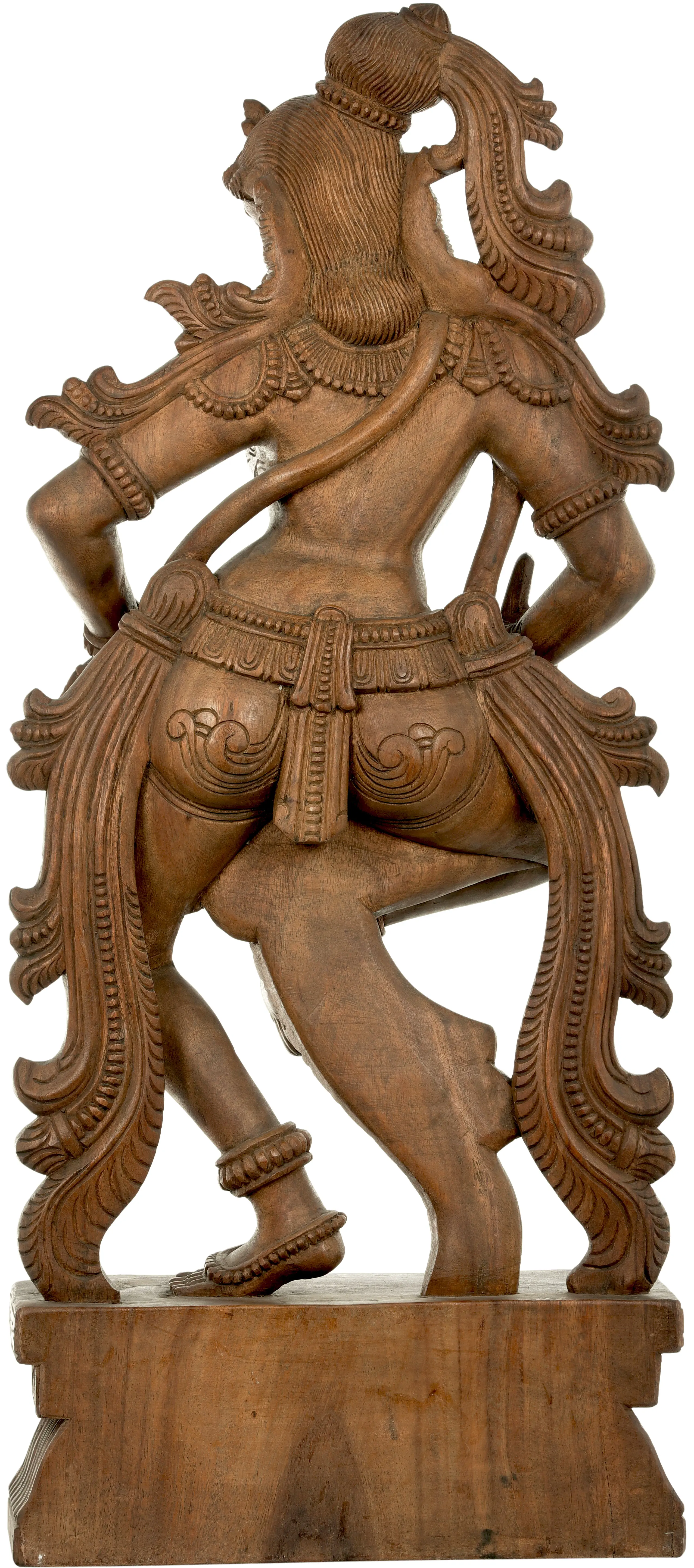 This exquisite wooden carving transports the viewer into the vibrant world of South Indian temple art. Depicting a celestial figure in a dynamic dance posture, it embodies the artistry and spiritual devotion that characterizes traditional craftsmanship from the region. Each curve and contour has been meticulously sculpted, revealing the skill of the artisan and the rich cultural heritage it represents. The figure, adorned with intricate jewelry and flowing garments, appears alive with movement, as if caught in a moment of divine ecstasy.