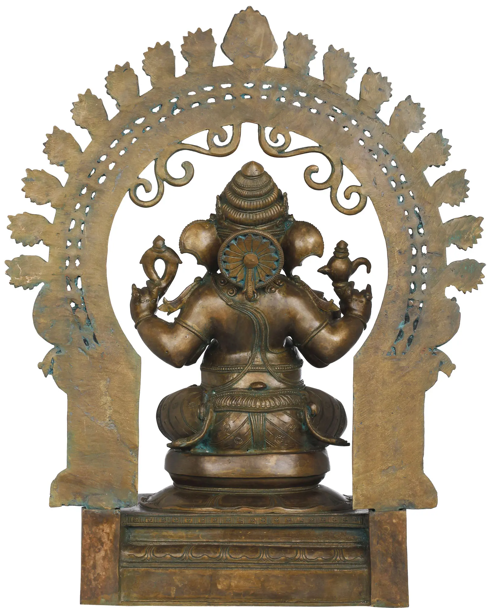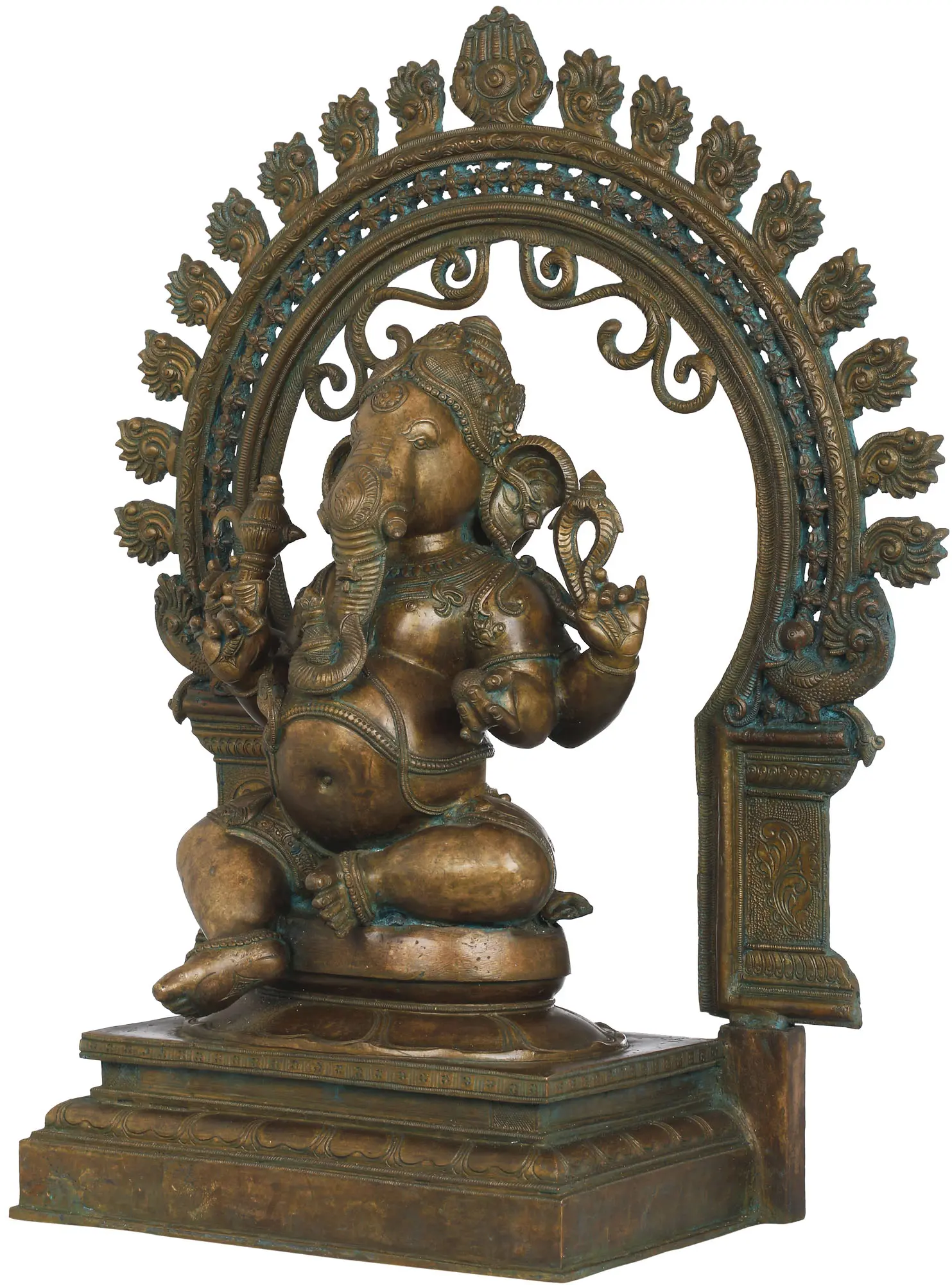 Each detail of this bronze masterpiece speaks of the legacy of Swamimalai artisans. The Lost-Wax casting technique, passed down through generations, ensures an exquisite finish and intricate detailing that brings the deity to life. Observe the delicate ornamentation on his attire, the serene expression on his face, and the symbolic objects held in his four hands. One hand often holds a modak (a sweet dumpling, his favorite), another a lotus flower, and the other two are in abhaya mudra (gesture of blessing and protection) and varada mudra (gesture of granting boons). The elaborate arched prabhamandal (aura) behind him, adorned with celestial motifs, further elevates the grandeur of this artwork, symbolizing the divine cosmic energy surrounding the deity. This statue is not merely an idol; it is a testament to the enduring artistic heritage of India and a powerful conduit for spiritual connection. Place it in your living room, meditation space, or office to imbue your surroundings with an atmosphere of peace, prosperity, and divine grace.