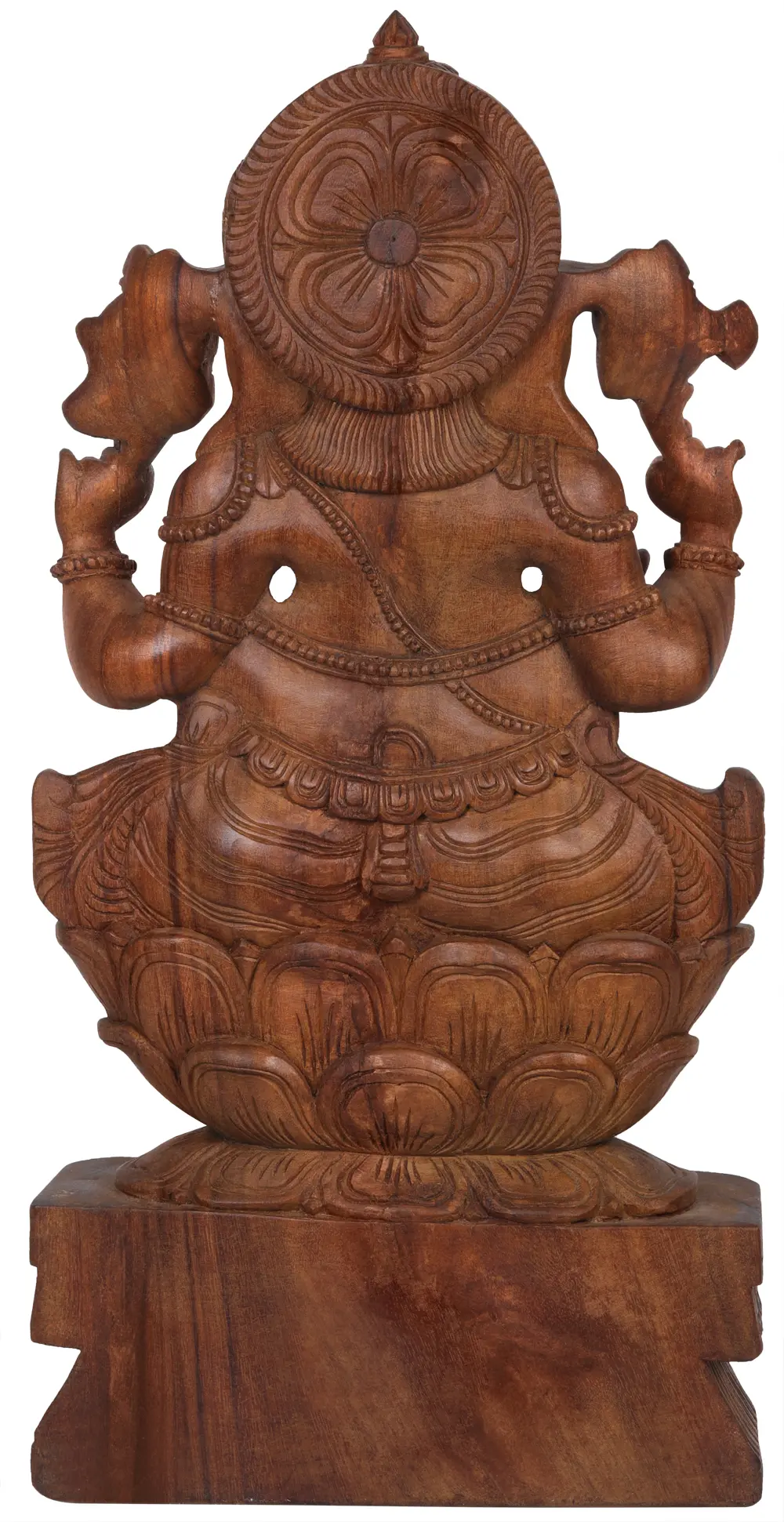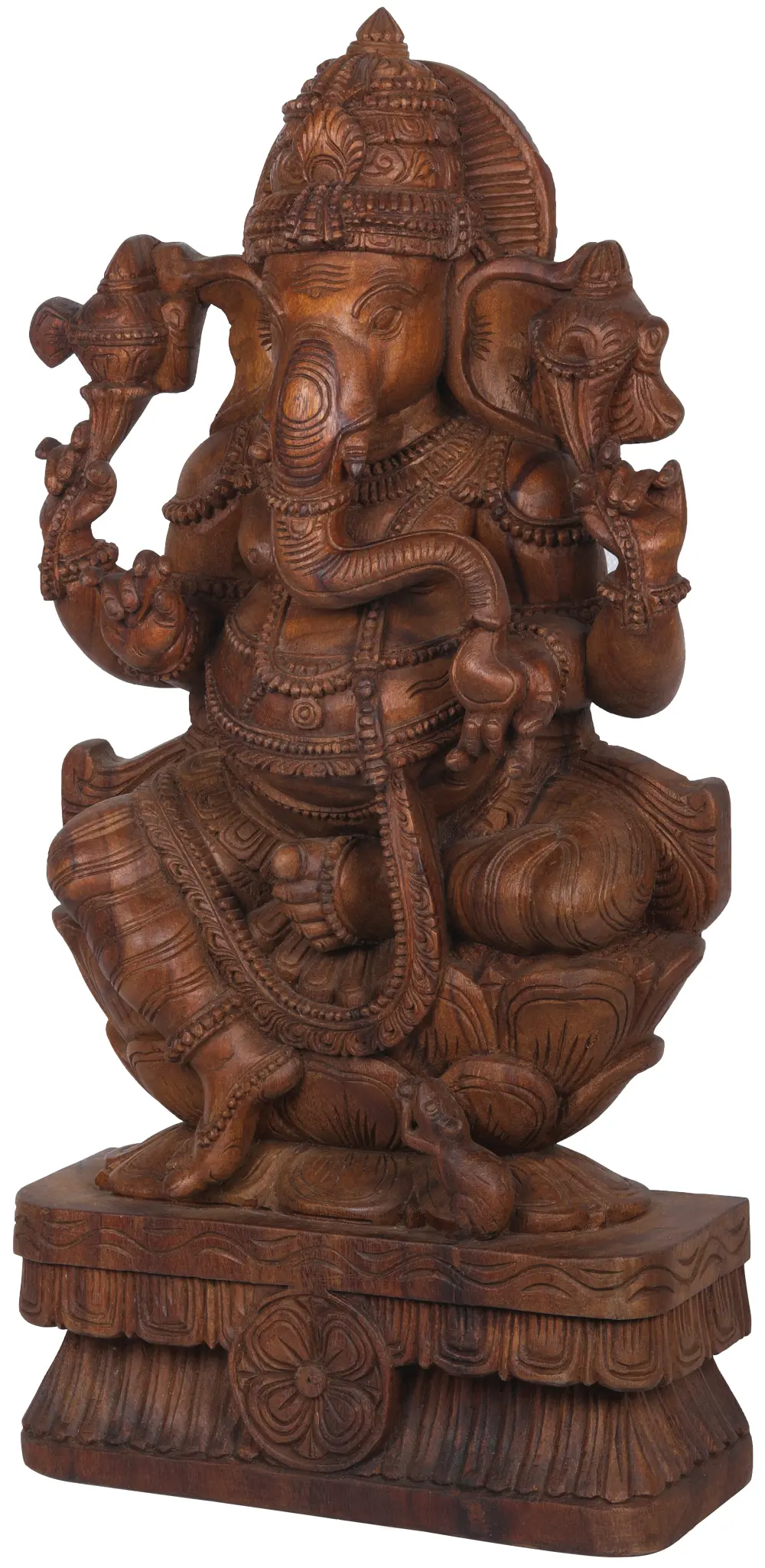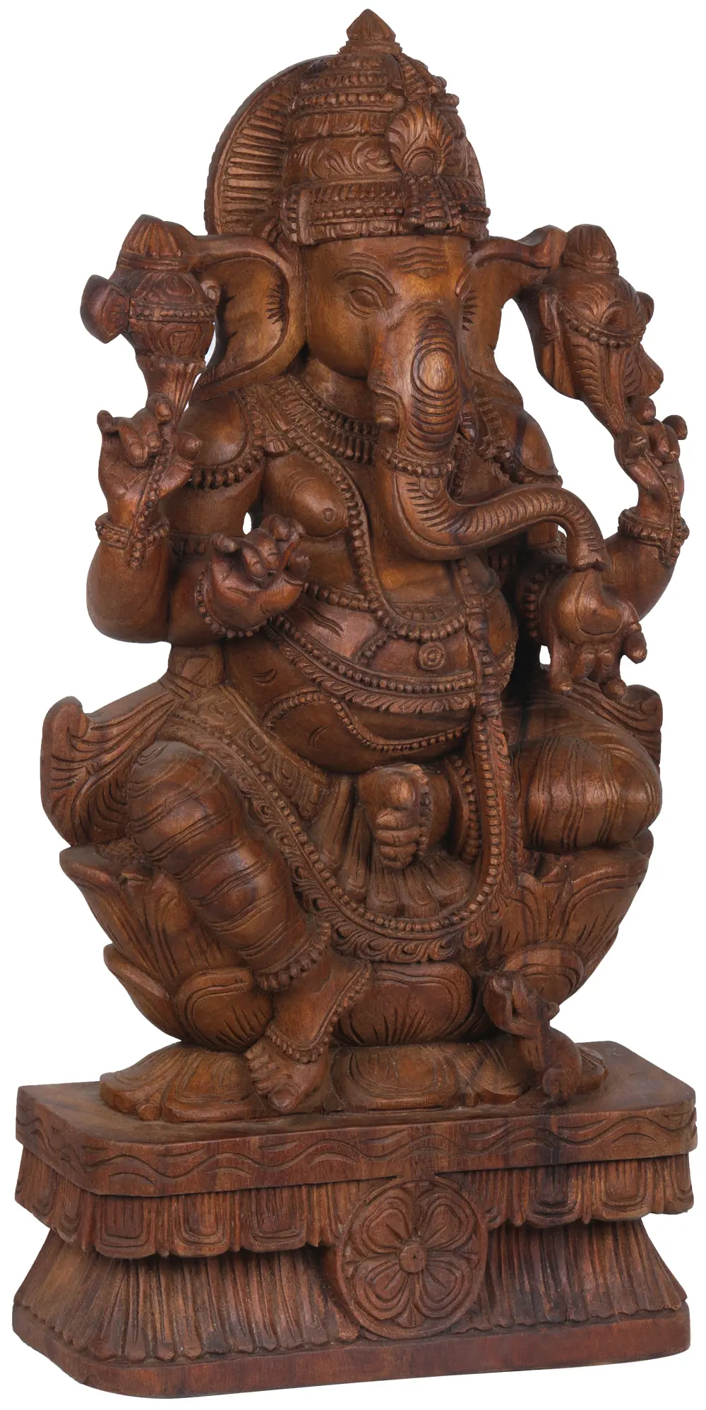 Immerse your sacred space in the benevolent aura of Lord Ganesha, the remover of obstacles and the patron of arts and sciences, with this magnificent South Indian temple wood carving. Each intricate detail, from the gentle curve of his trunk to the serene expression on his face, is a testament to the skilled hands of master artisans. Seated serenely upon a blossoming lotus, a symbol of purity and spiritual enlightenment, this Chaturbhuja (four-armed) representation embodies divine grace and auspicious beginnings. The rich, warm tones of the wood lend a timeless quality to this piece, making it a captivating centerpiece for any home, temple, or meditation room. ––––––––––––––––––