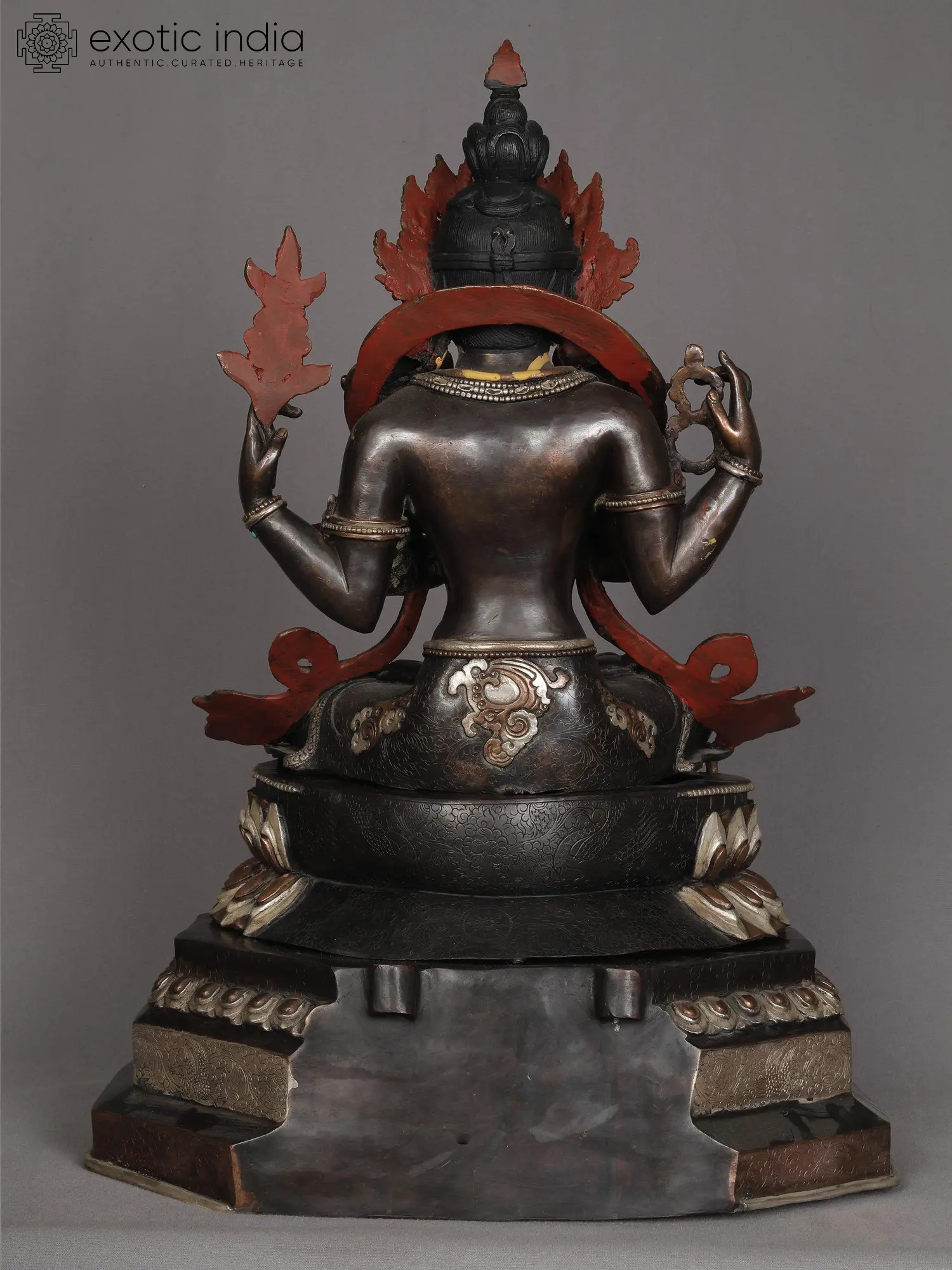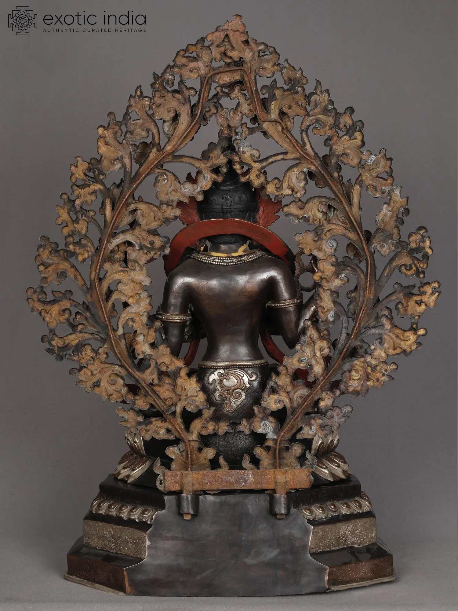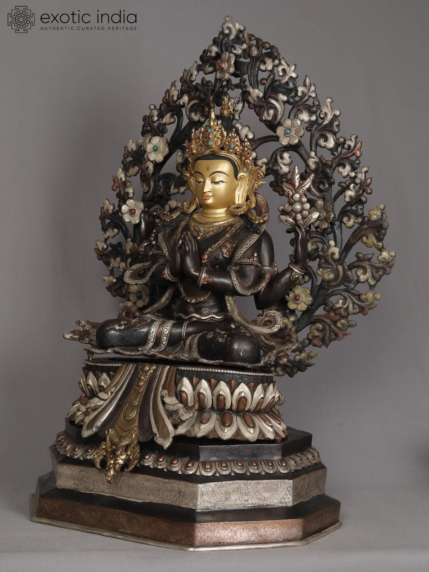 A deep aesthetic quality is instilled by the use of dark metallic tones in this copper and gold statue from Nepal, which depicts Bodhisattva Avalokiteshvara or Chenrezig enthroned of a beautiful lotus and haloed by a blossoming tree which symbolizes origin and growth of auspiciousness. The use of coral and turquoise in the statue endows it with a regal appeal. Brilliantly ornamented and attired in refined garments, the four-armed Chenrezig glows as if from within, a feature that becomes enhanced due to the contrast of his golden countenance with the rest of the composition.