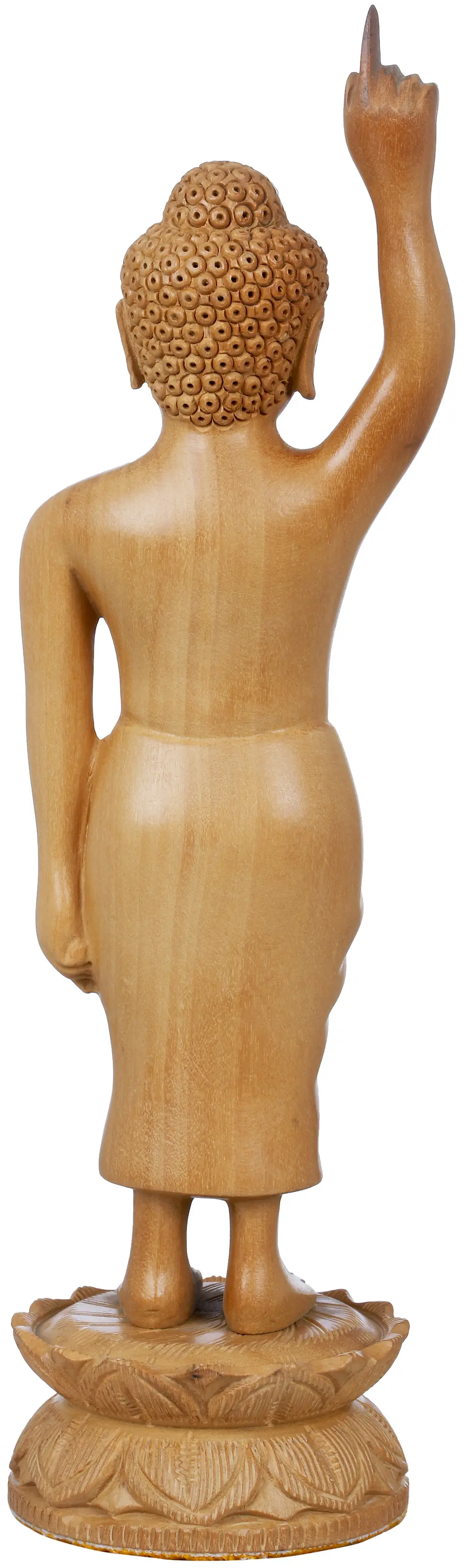 This Wooden Statue is an homage to the image of the Child Buddha or Siddharth whore soon after his birth summoned the sky and earth. According to legends, Gautam Buddha or Siddhartha took seven steps shortly after birth. He has one arm outstretched, pointing to the sky, and the other pointing towards the ground. Then, without assistance, the infant walked seven steps in the direction of each of the cardinal points and declared in a clear voice: "I will have no more births to endure, for this is my final body."