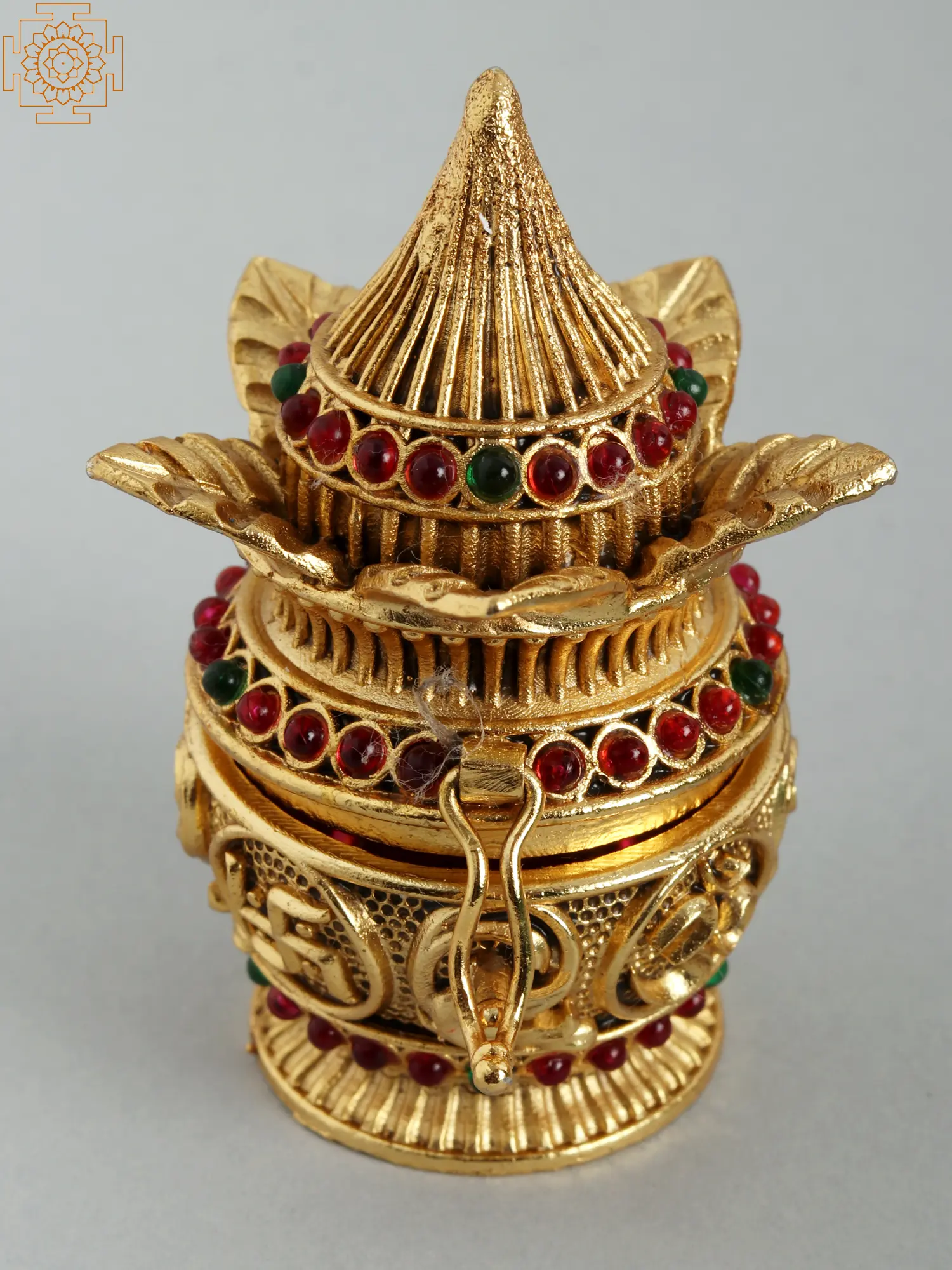 The artistry of this kalasha is truly captivating. Crafted from superfine brass, it displays intricate detailing that speaks of skilled hands and a deep understanding of traditional motifs. The prominent inclusion of the Swastik, a symbol universally recognized as representing good luck, prosperity, and well-being, immediately imbues the piece with positive energy. The sacred syllable "Om," the primordial sound of creation and the essence of the universe, further elevates its spiritual value, making it a powerful focal point for meditation and prayer. The base of the kalasha is decorated with a delicate border, housing vibrant red and green stones that catch the light, adding a touch of regal elegance. The hinged lid, designed to resemble a tiered crown or a stylized coconut, is similarly embellished, culminating in a shimmering, textured peak.
