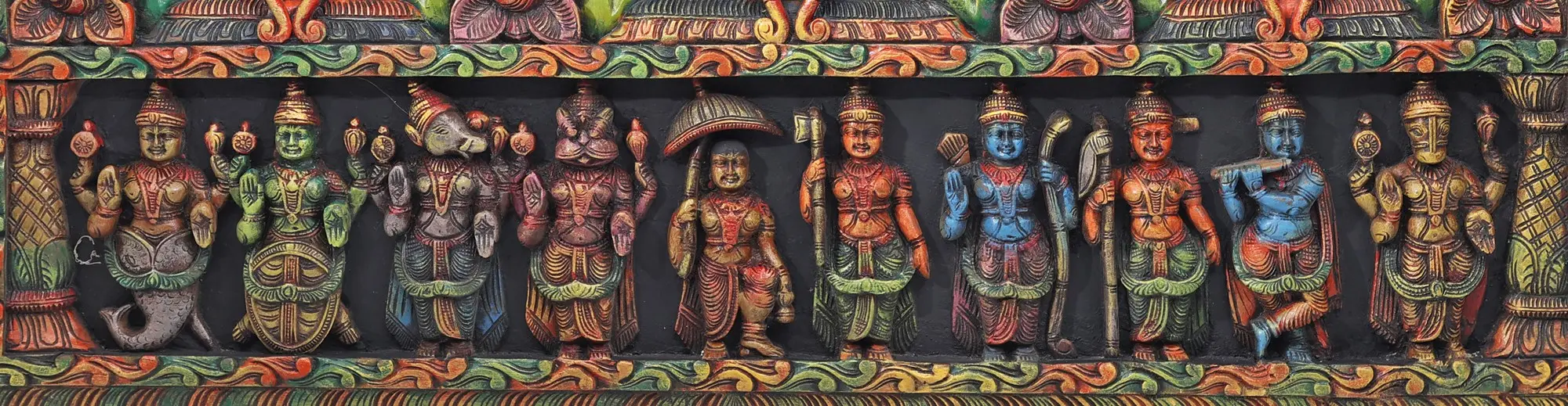 This exquisitely carved wooden panel brings to life the divine ten avatars of Lord Vishnu, a central figure in Hindu cosmology. Each form represents a specific epoch, demonstrating Vishnu's cyclical descent to Earth to restore dharma, uphold righteousness, and protect the universe from chaos and evil. The vibrant colors and intricate details of this artwork offer a captivating glimpse into these epic narratives, making it a striking centerpiece for any sacred space or a unique conversation starter for your home decor.