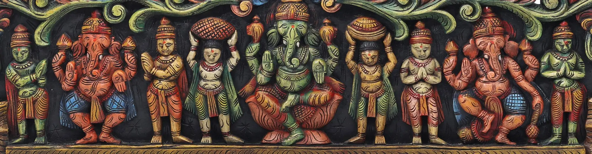 The Colorful Three Ganesha Wall Hanging is a vibrant masterpiece that is also a testament to the magnificent crafts of Thamampatti. Handcrafted with meticulous attention to detail, it features three intricately designed Ganesha figures, each adorned with a spectrum of lively hues. The dynamic colors breathe life into the wall hanging, creating a visually captivating and spiritually uplifting ensemble. The varied postures of the Ganesha figures convey a sense of dynamism and grace. This colorful trio not only serves as a decorative accent but also radiates a positive aura, infusing the space with the auspicious and joyous presence of Lord Ganesha, symbolizing wisdom, prosperity, and success.