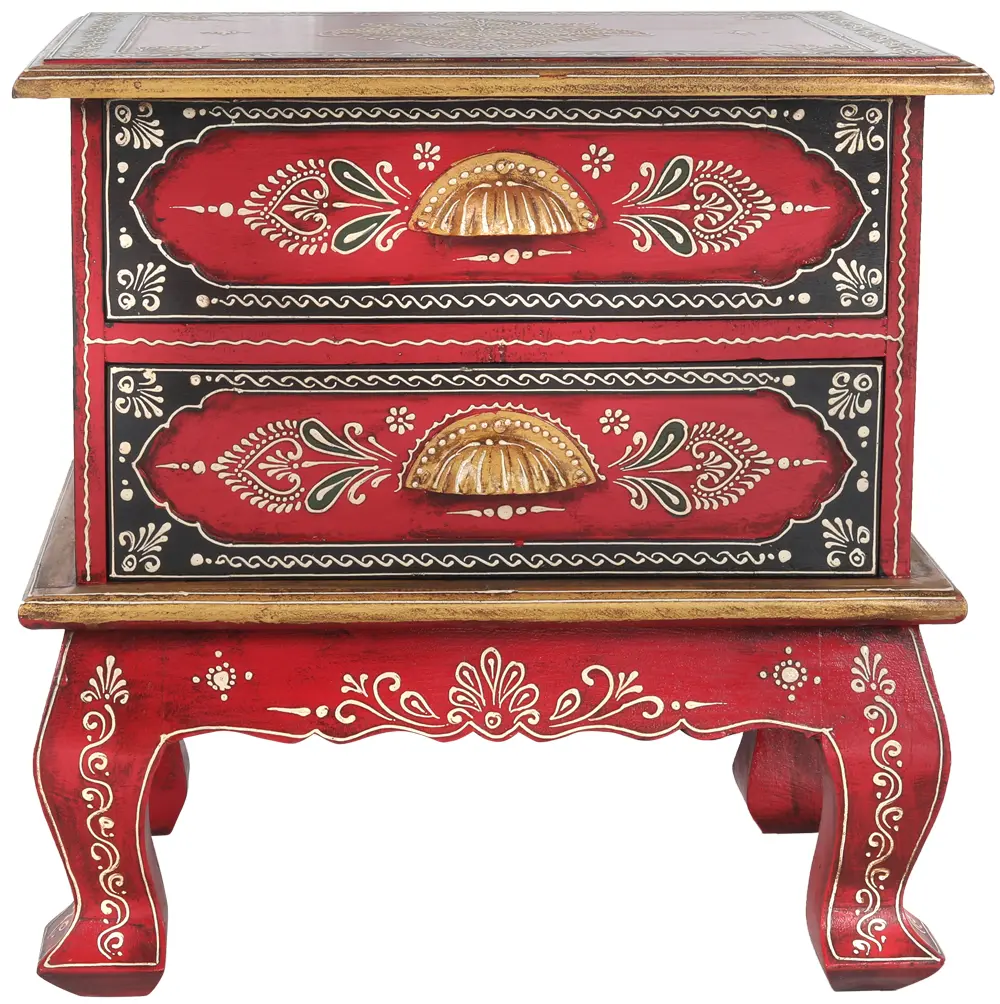 This exquisite wooden table is a testament to the rich artistic heritage of India, a land where art and spirituality are intricately woven into the fabric of daily life. Inspired by the divine aesthetics often found in the depiction of Hindu gods and goddesses, each element of this piece evokes a sense of reverence and beauty. The vibrant red hue, a color often associated with auspiciousness, power, and passion in Hindu culture, serves as the striking backdrop for an intricate dance of patterns. The artistry extends beyond mere color, delving into a narrative of traditional motifs. The detailed designs, rendered in contrasting black, white, and gold, are reminiscent of the traditional Kalamkari art, a painstaking process of hand-painting or block-printing textiles. These patterns, with their flowing lines and stylized floral and paisley elements, tell silent stories, much like the epics that have been passed down through generations. The paisley motif, in particular, has deep cultural significance, often symbolizing life, fertility, and a spiritual journey, echoing the divine narratives found in Hindu mythology.