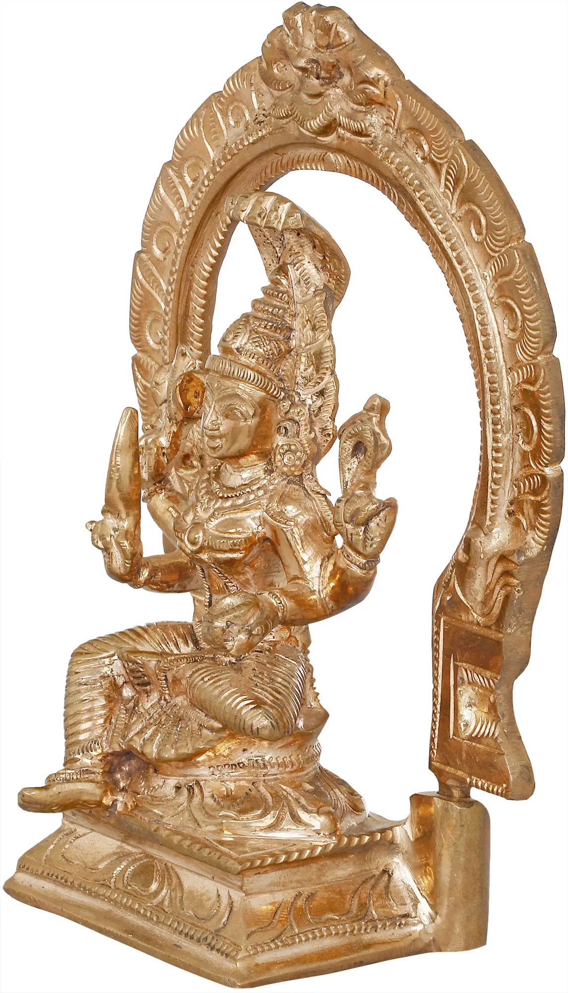 A compact, handheld sculpture. Devi Mariamman is seated in lalitasana in the mouth of a lotus. She is the chaturbhujadharini, the one possessed of (‘dharini’) four (‘chatur’) arms (‘bhuja’). In Her hands She holds a lotus (posterior right), a conch (posterior left), a long and slender weapon indicative of Her wrathful streak (anterior right), and a bowl (anterior left). From the navel downwards She is clad in a silken dhoti, while a world of shringar graces the youthful, maternal curves of Her upper body. Her attire is a signature element of the iconography of the South.