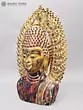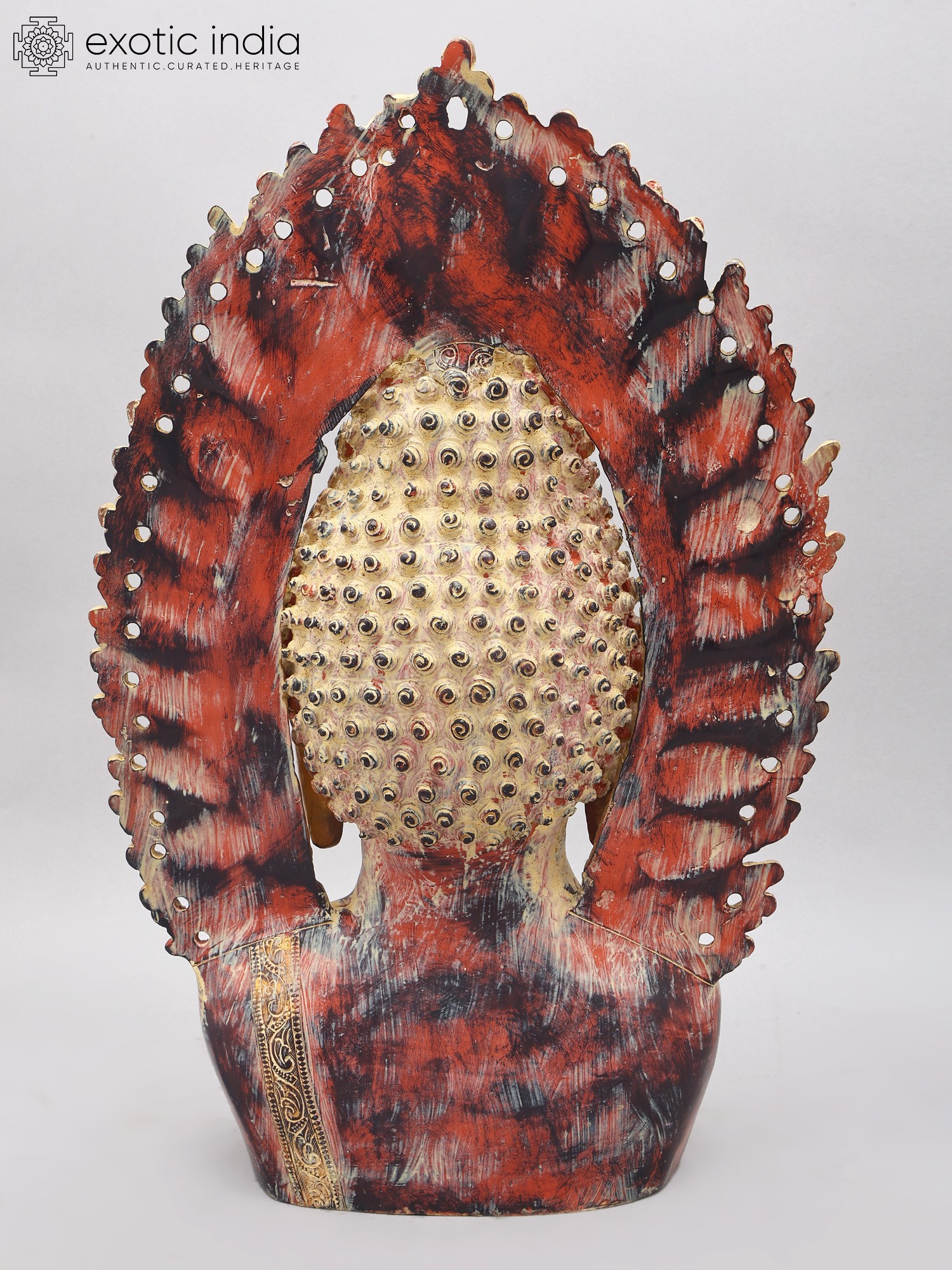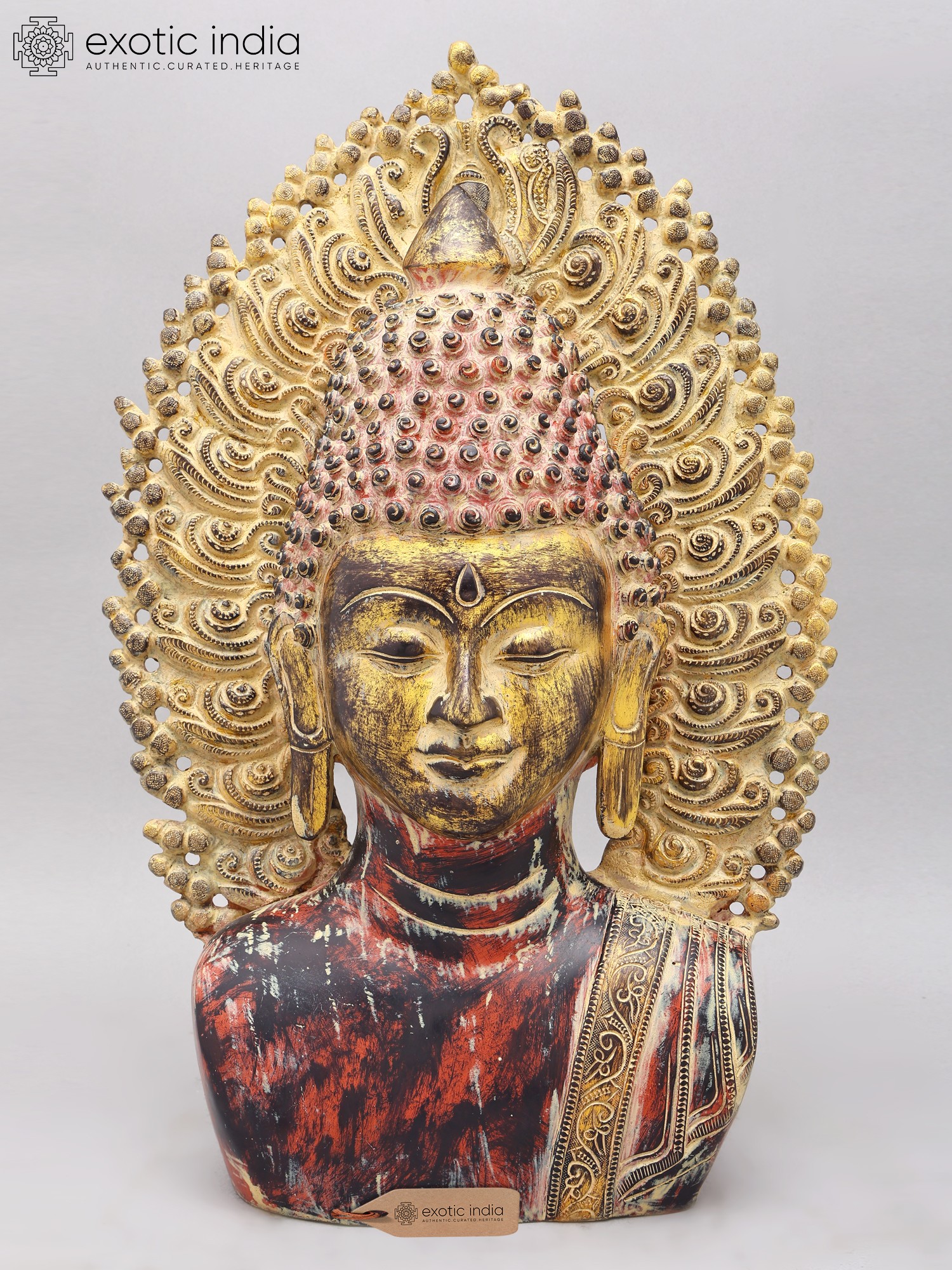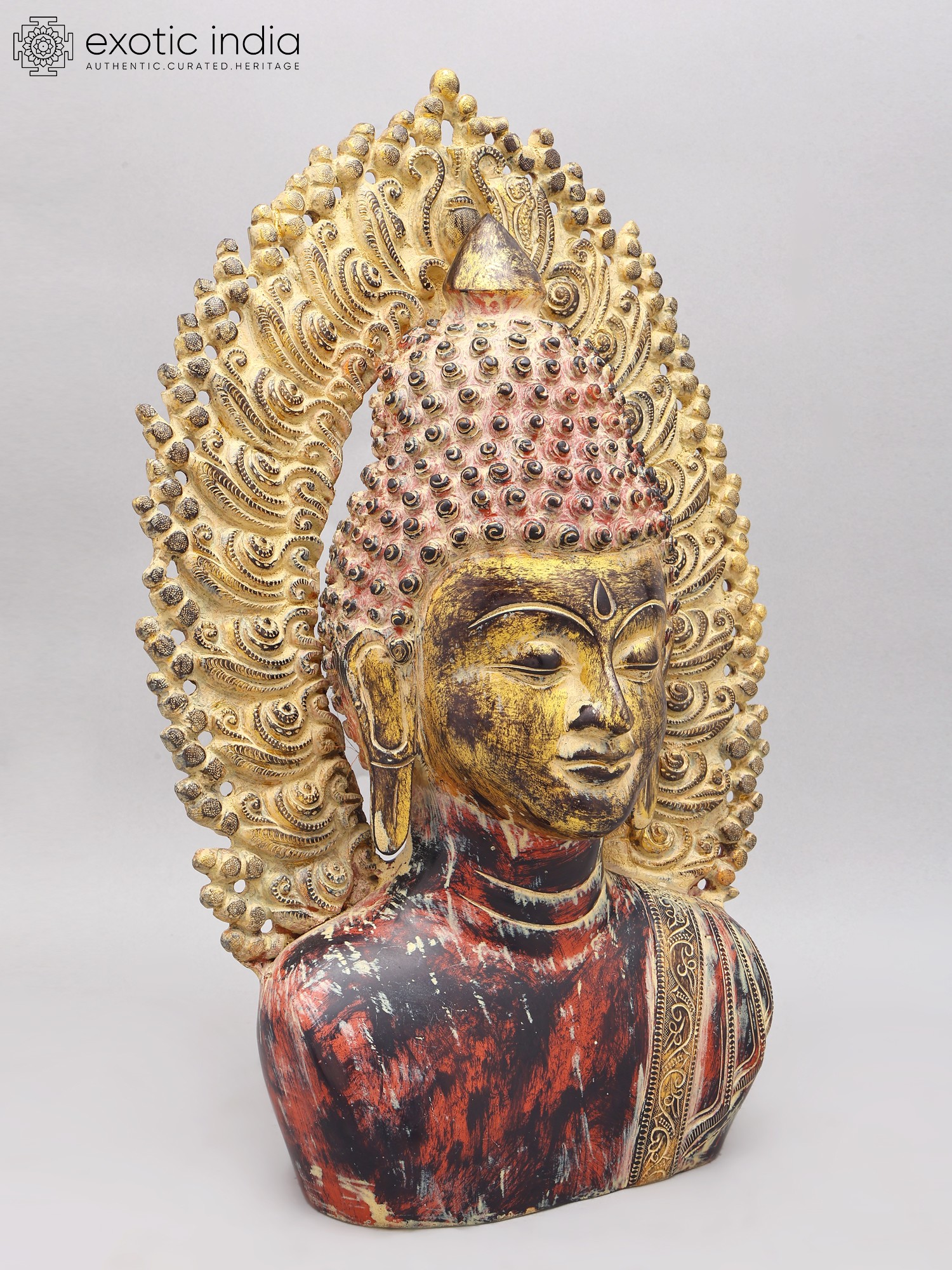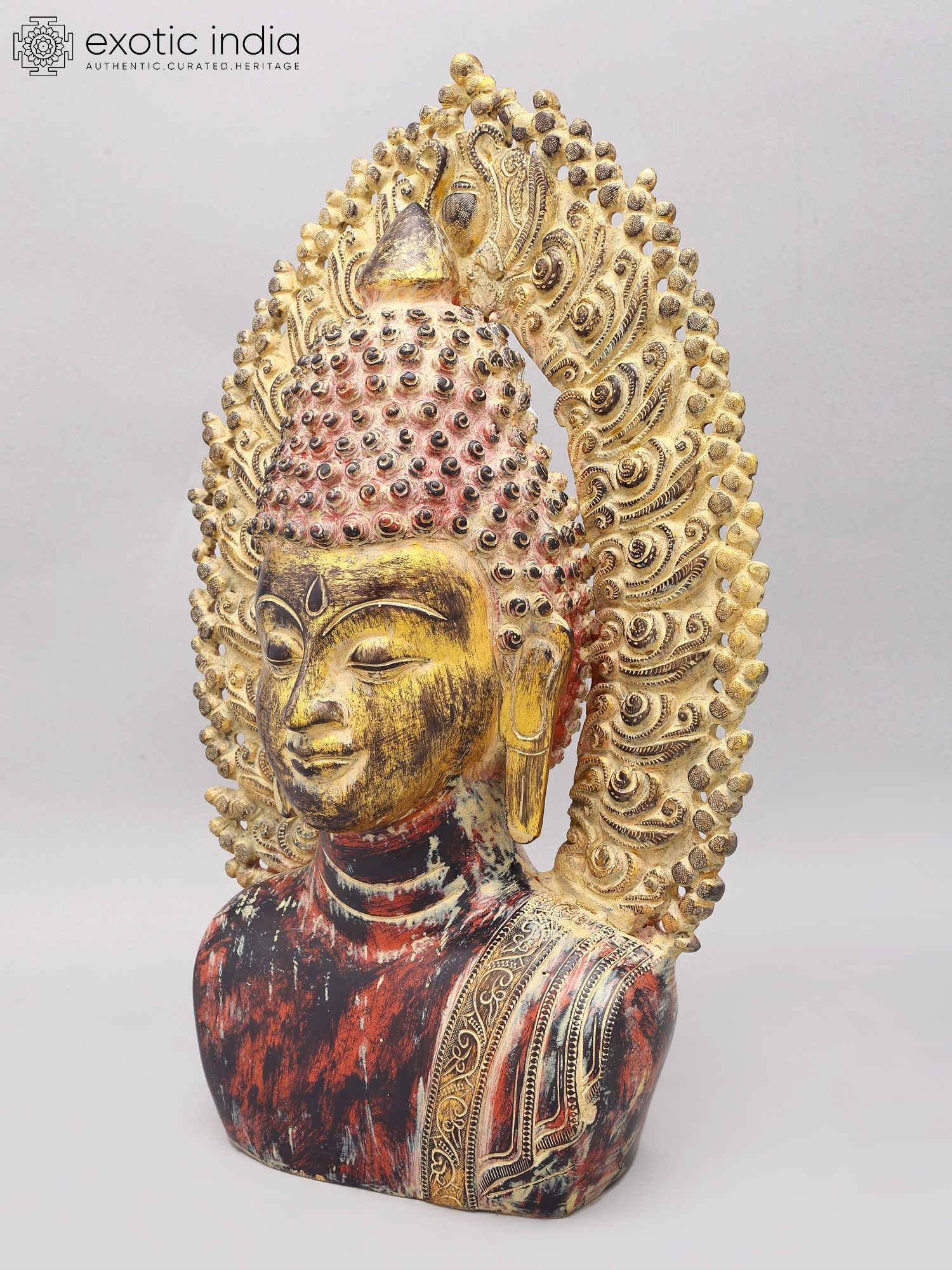 Note the aureole that frames the Buddha bust that you see on this page. It is a compact, intricately engraved number. Each panel along its elongated, gently curving frame has been carved in perfect symmetry with the other. Curvaceous coils like the mouths of numerous lotuses, freshwater foam from which they grow, and the tendrils of unassuming vines along the base. Such a Buddha bust would add to the aesthetics of the space of any devotee.